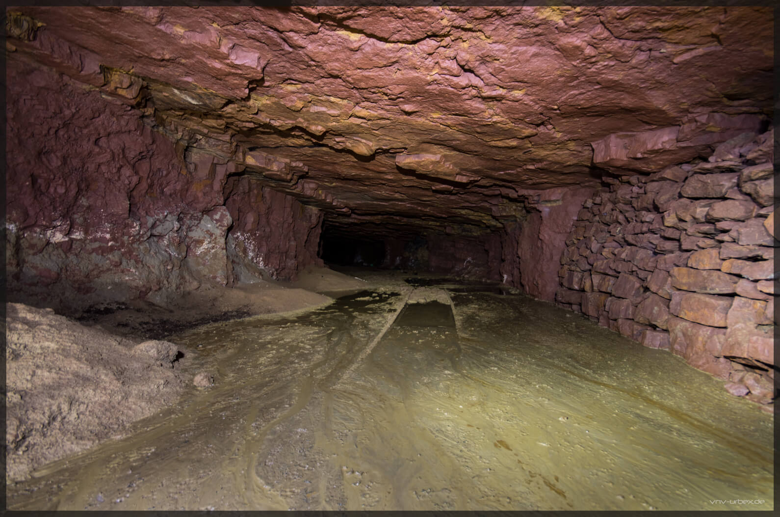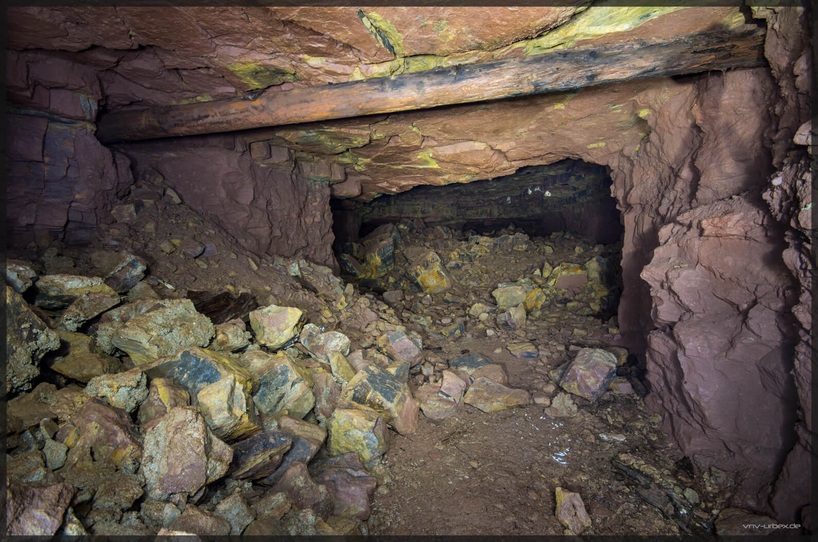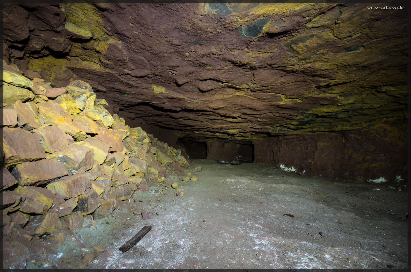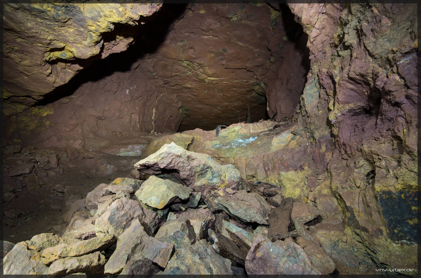Diese schöne und nahezu unberührte Doggererz Grube befindet sich tief im Schwarzwald, ein wirklich farbiger Platz unter der Erde. Die Grube war nur 7 Jahre aktiv in Betrieb, doch für diese kurze Zeit war der Vortrieb relativ groß. Einige Jahre nach der Schließung wurde noch versucht, eine Pilzfarm dort einzurichten, was aber auch nach kurzer Zeit eingestellt wurde. Heute liegt die gesamte Grube im Dornröschenschlaf und ein Marder hat sich häuslich eingerichtet. Die liegende Doggerscholle erreichte hier eine Mächtigkeit von 2 m. Ich habe der Grube einfach den Name „Grube Kunterbunt“ gegeben, da hier wirklich viele lebendige Farben von den Wänden leuchten.