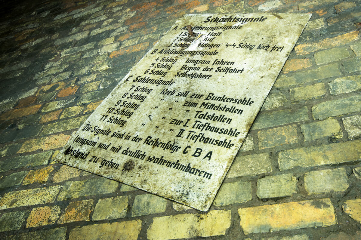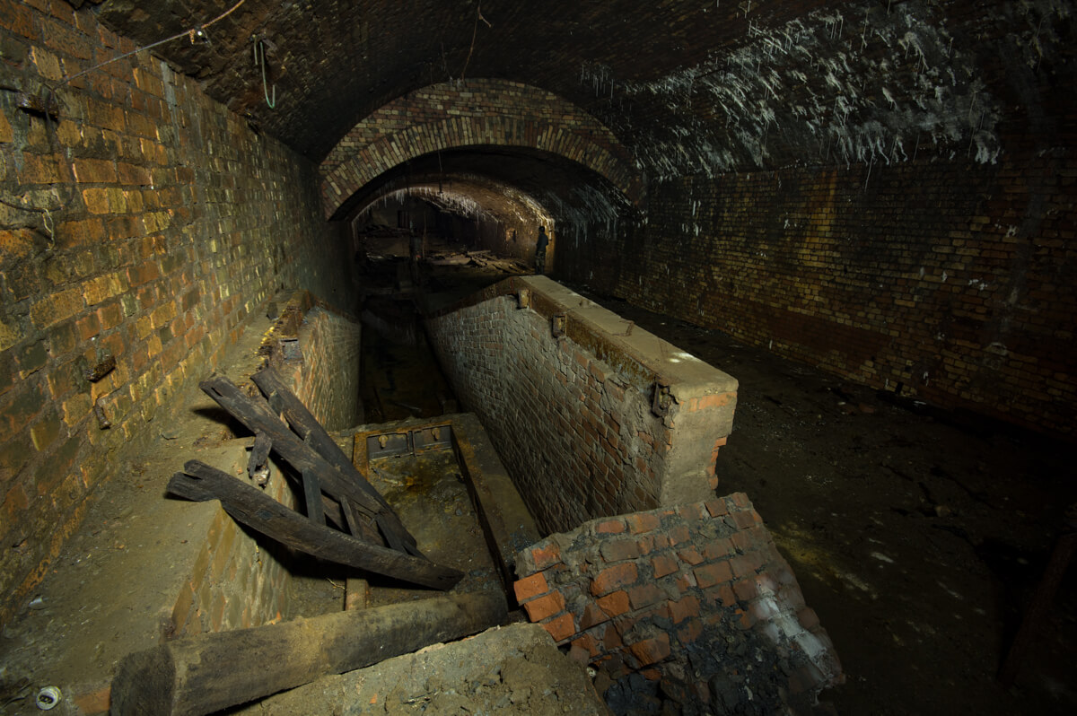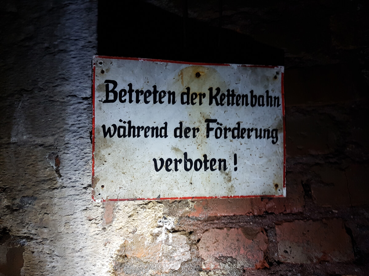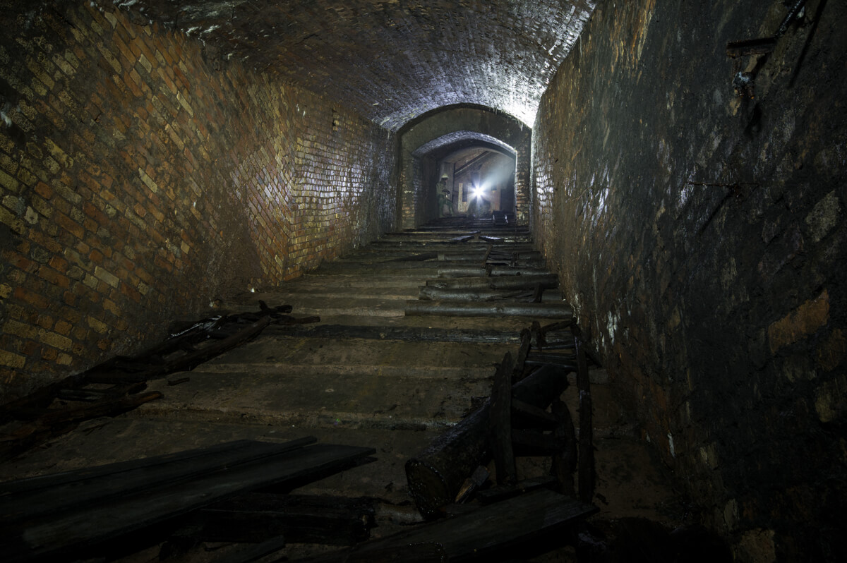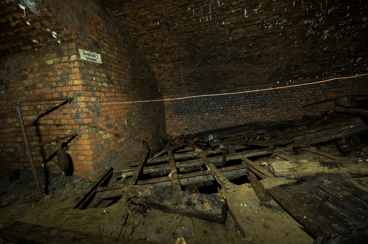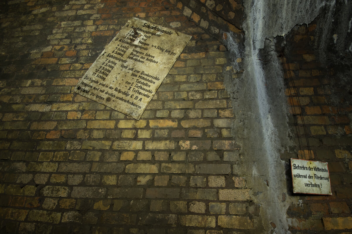 Die gesamte Bunkersohle stand wie der Füllort der Mittelstollen-Sohle im Ziegelgewölbeausbau. Da wir seit Langem die Ersten hier oben waren, zeigte sich die Sohle vollkommen unberührt. Die rot-gelben Ziegelsteine verliehen der Bunkersohle ihre ganz eigene Lichtstimmung. In der Ferne war bereits der Blindschacht zu erkennen. Rechts davor die Rampe der Kettenbahn und am Stoß die Anschlagtafel des Schachts. Am östlichen Ende lag der Fördermaschinenraum und anschließend der Seilberg mit den Seilscheiben an dessen Ende. Insgesamt ist der Querschnitt der Bunkersohle etwas geringer als der darunter liegende Füllort der Mittelstollen-Sohle.