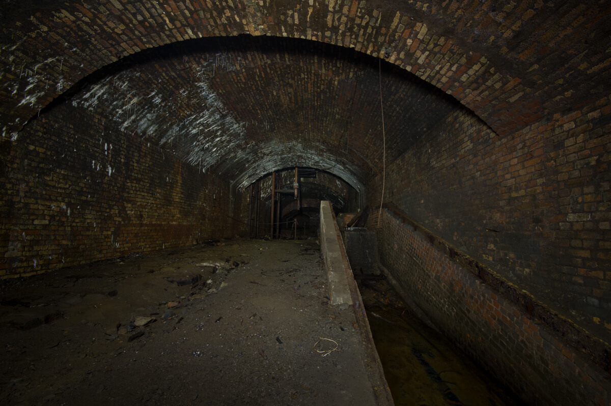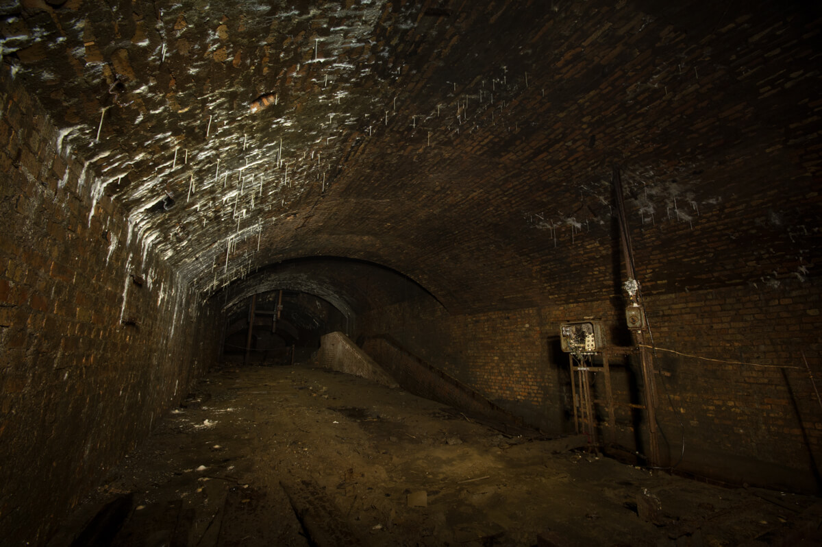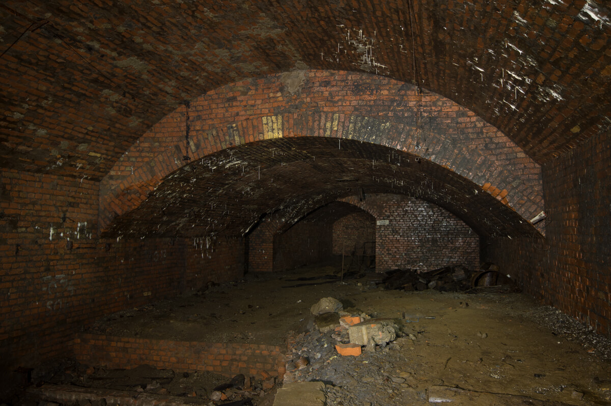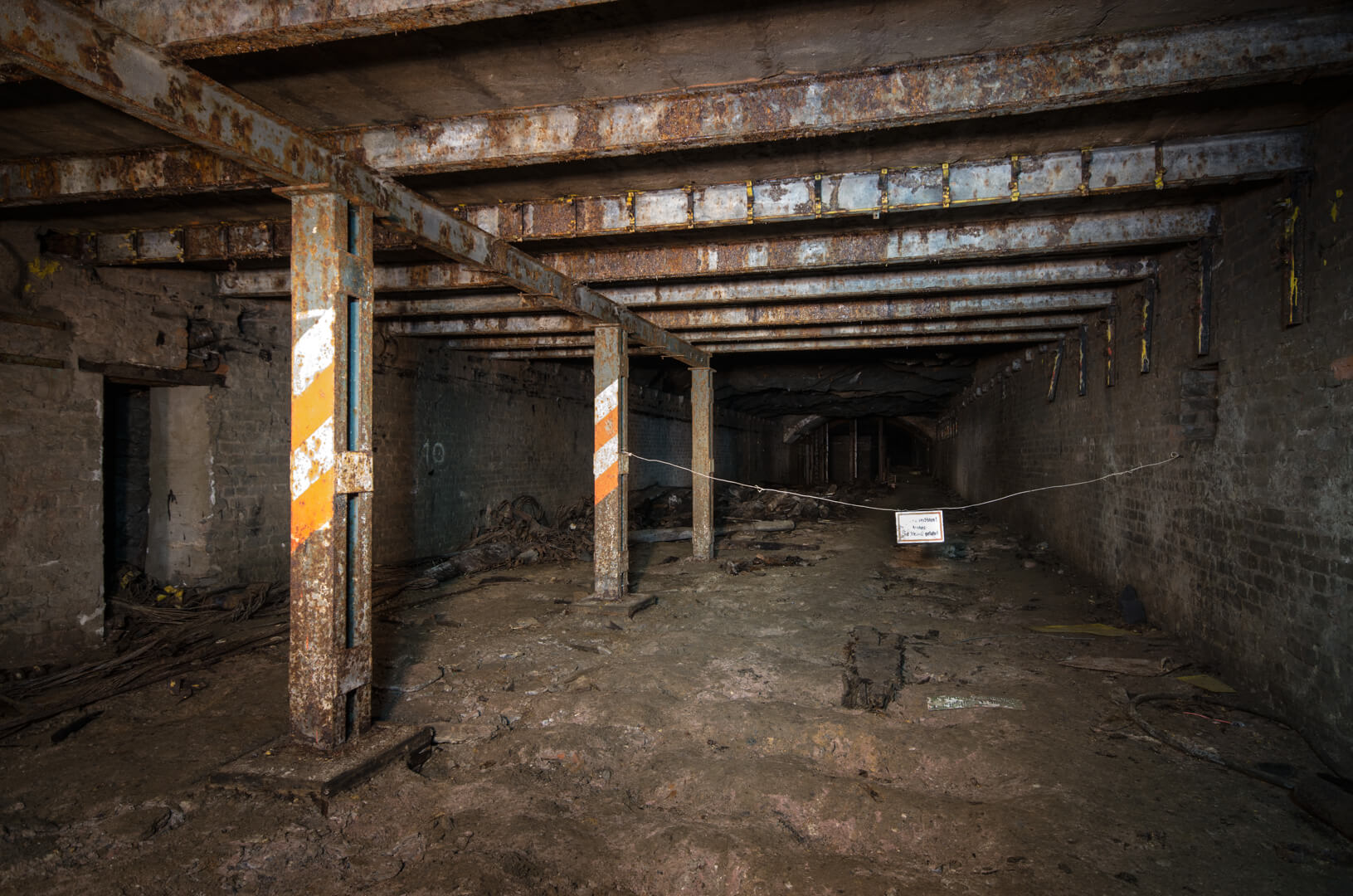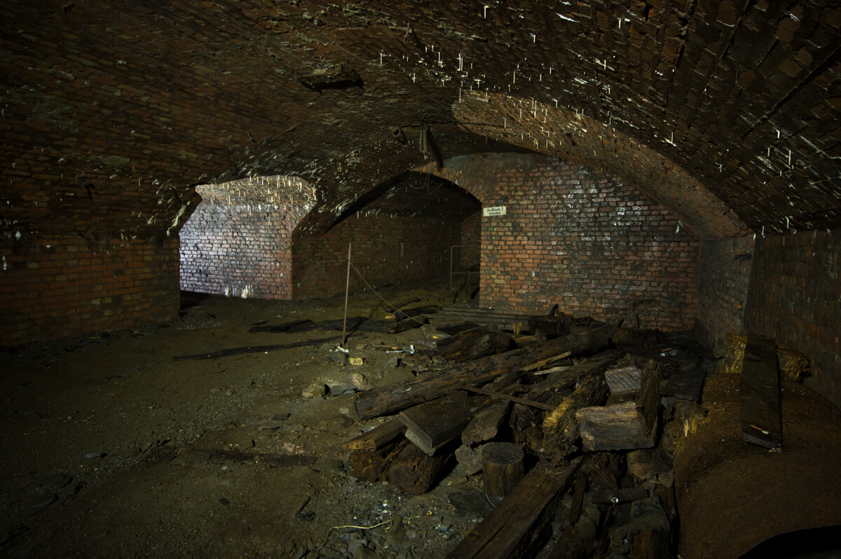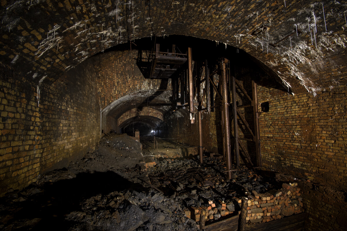 Die gesamte Bunkersohle stand wie der Füllort der Mittelstollen-Sohle im Ziegelgewölbeausbau. Da wir seit Langem die Ersten hier oben waren, zeigte sich die Sohle vollkommen unberührt. Die rot-gelben Ziegelsteine verliehen der Bunkersohle ihre ganz eigene Lichtstimmung. In der Ferne war bereits der Blindschacht zu erkennen. Rechts davor die Rampe der Kettenbahn und am Stoß die Anschlagtafel des Schachts. Am östlichen Ende lag der Fördermaschinenraum und anschließend der Seilberg mit den Seilscheiben an dessen Ende. Insgesamt ist der Querschnitt der Bunkersohle etwas geringer als der darunter liegende Füllort der Mittelstollen-Sohle.