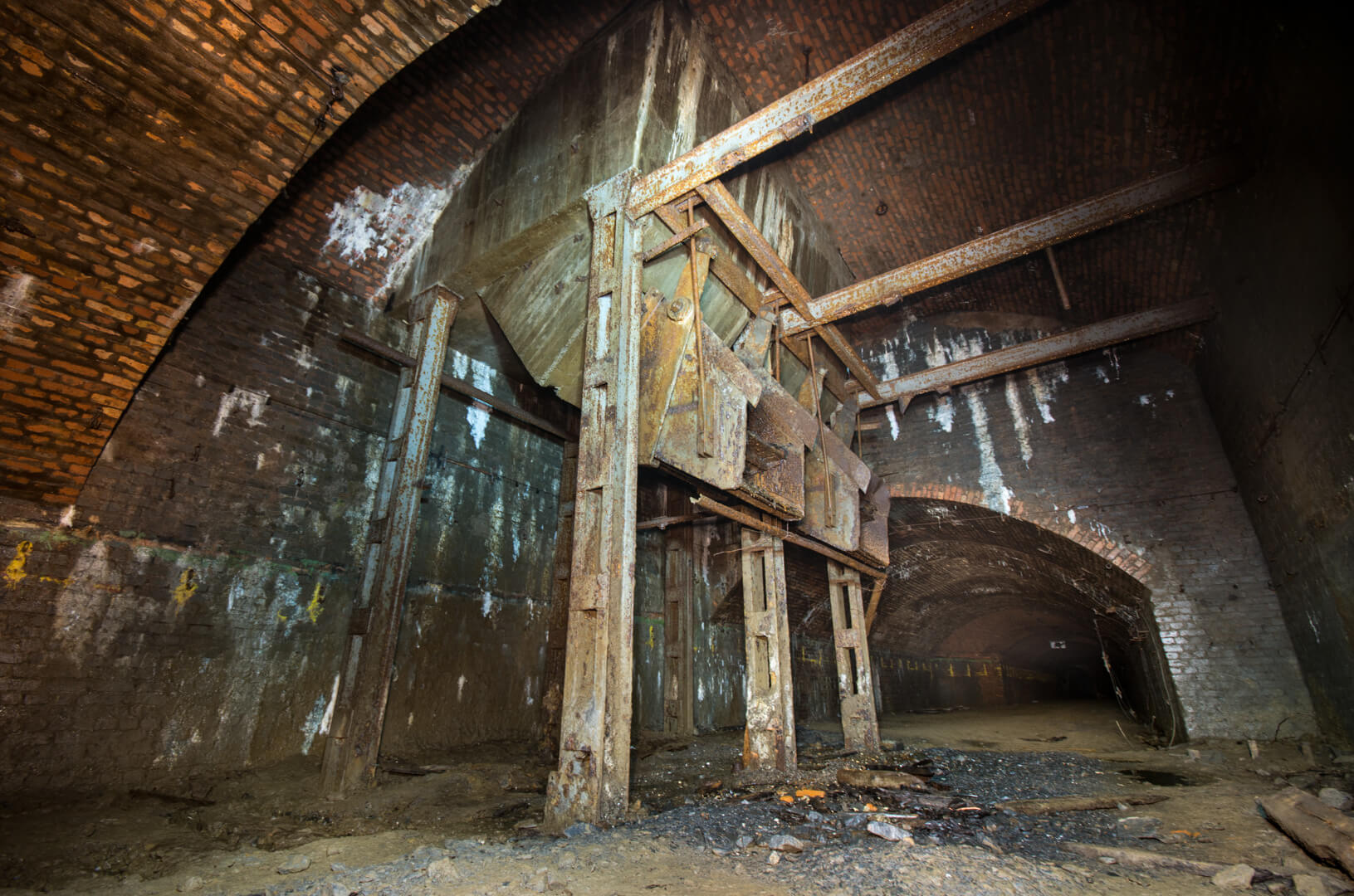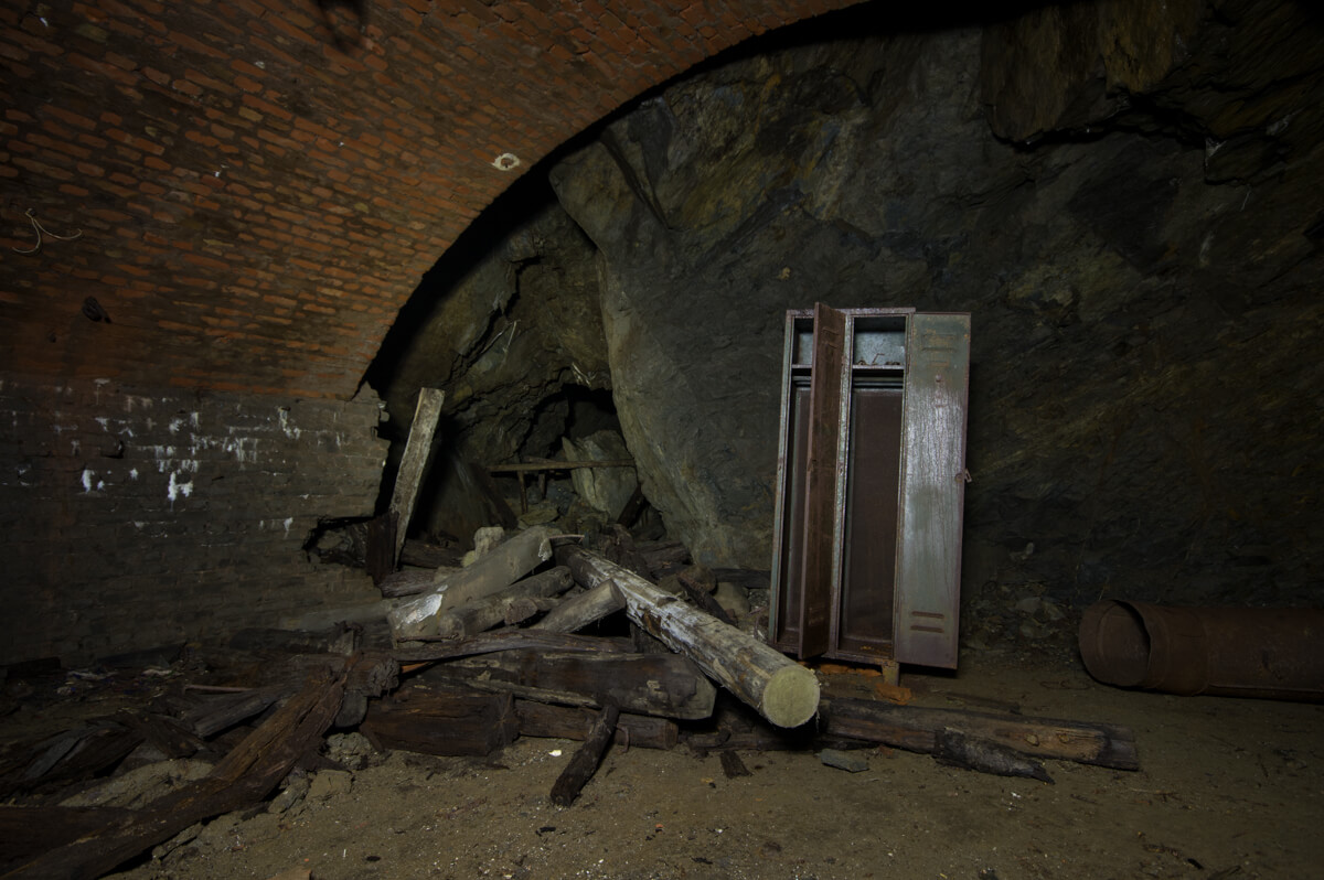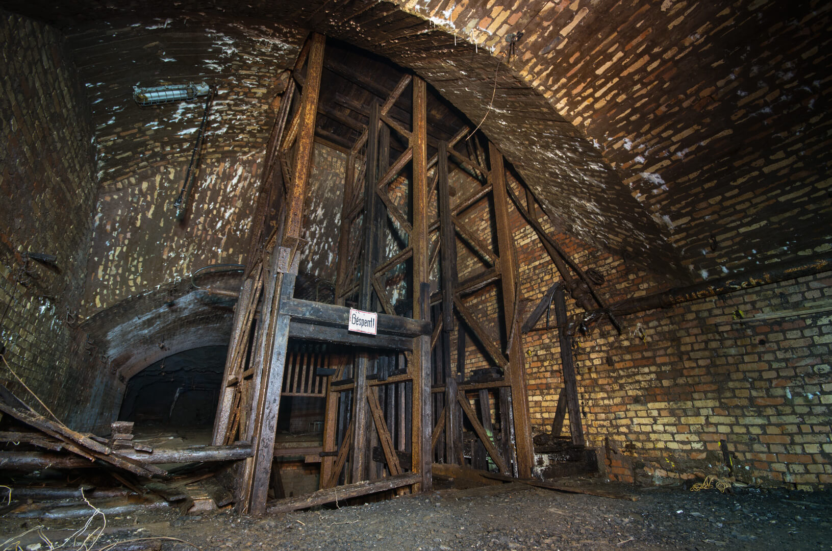 Das Erzbergwerk reiht sich ganz vorn in meine Befahrungen ein. Die Grube gefiel mir damals auf Anhieb. Direkt nach dem Einfahren auf der Mittelstollen-Sohle bewegte ich mich auf den Füllort zu. Vor mir tauchten als erstes die riesigen Rollenschnauzen des Erzbunkers auf. Zwei eng aneinander liegende Rollen aus Stahl, die ihre Schnauzen in die Strecke recken. Weiter hinten erschien im Lichtkegel der mächtige Blindschacht, welcher einst bis auf die 2. Tiefbausohle reichte. Die Erzrollen und der Blindschacht 1 stehen in einer großen, aus Ziegeln gemauerten Gewölbehalle. Untertägige Gewölbemauerungen in diesem Umfang sieht man nicht jeden Tag. Jede Ziegelreihe untermauerte die Wichtigkeit dieses Füllorts. Allerdings wusste ich zu diesem Zeitpunkt noch nicht, dass es noch besser kommen sollte.
