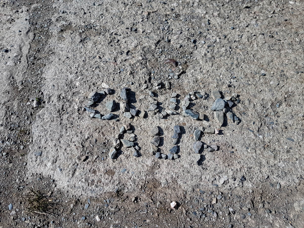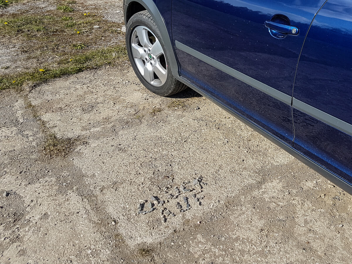 Die heutige Welt dreht sich immer schneller, und da ist es schon eine Besonderheit, wenn sich jemand die Zeit nimmt, um einen freundlichen Gruß am Auto zu hinterlassen. Als ich von der Befahrung zurück zum Auto kam, mich umzog und dann wieder ins Auto steigen wollte, sah ich am Boden neben der Fahrertür dieses Glück auf aus vielen kleinen und von Hand gesammelten Steinchen. Erst dachte ich: Okay, jemand aus dem Dorf wusste, warum das Auto hier auf dem Wanderparkplatz steht. Doch später am Abend meldete sich der Ersteller und erzählte mir, dass er mein Auto dort sah und dann die Steine suchte und sie zu einem Glück auf vereinte. Ja, 400 km fernab der Heimat, hoch oben am Berg, werden noch Grüße in mühsamer Handarbeit hinterlassen. Und hiermit ein GLÜCK AUF! Zurück an Chris.