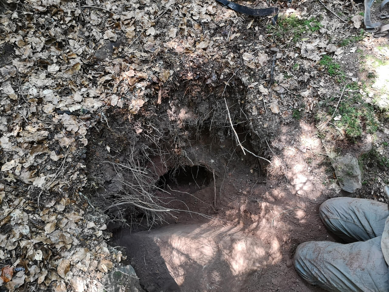 Die Punkte 5 und 6 markieren kleinere Suchstollen, die wir entdeckten. Im Gelände waren diese für den normalen Betrachter so gut wie nicht erkennbar. Punkt 5 zeigte sich allein durch einen punktuellen Wetterzug. Dieser zog aus einer Öffnung nicht viel größer als ein Mausloch. Der Wetterzug wirbelte immer wieder kleineres Laub auf und machte so auf sich aufmerksam.