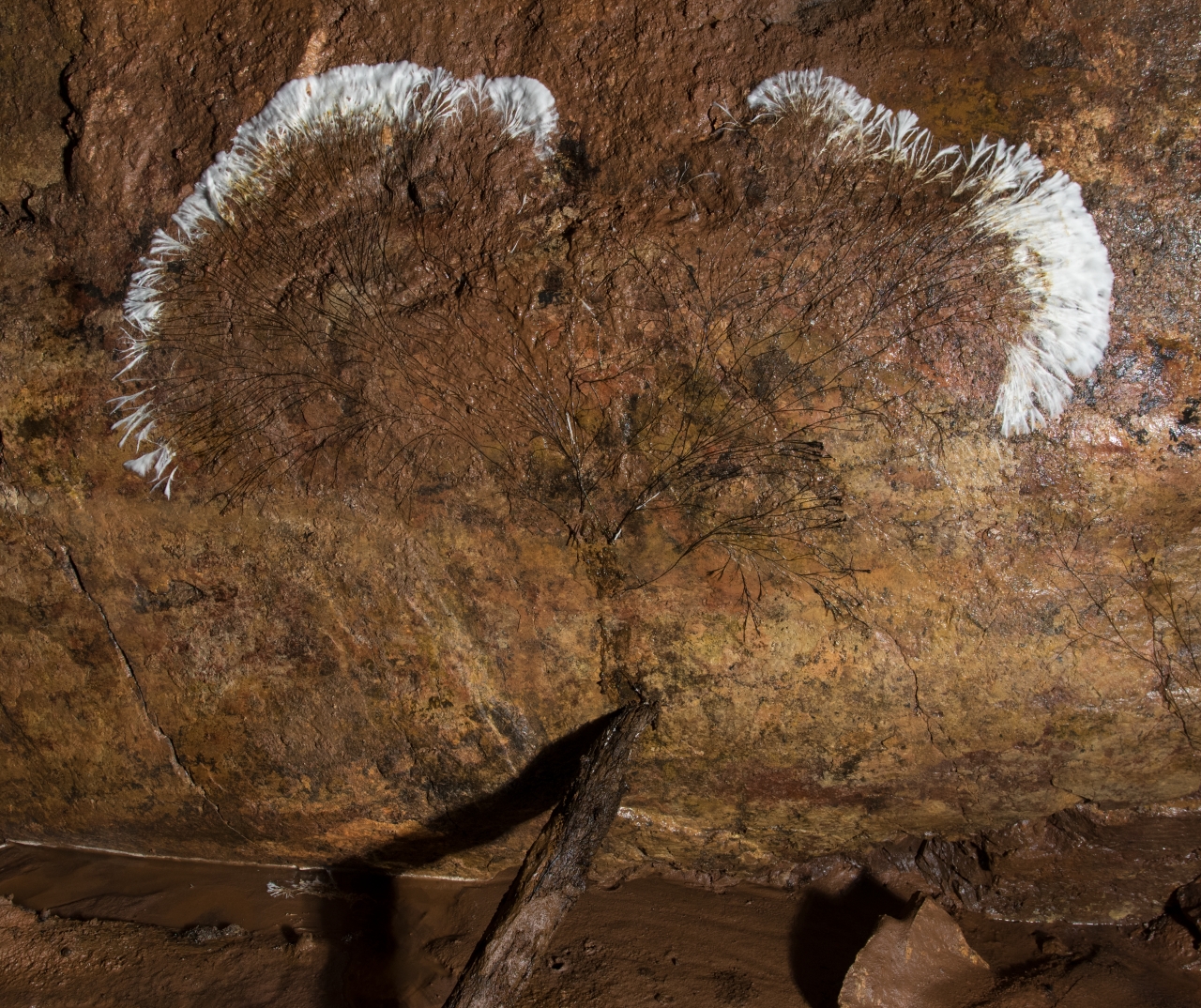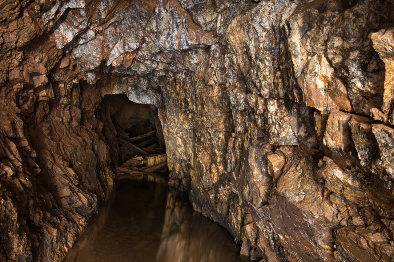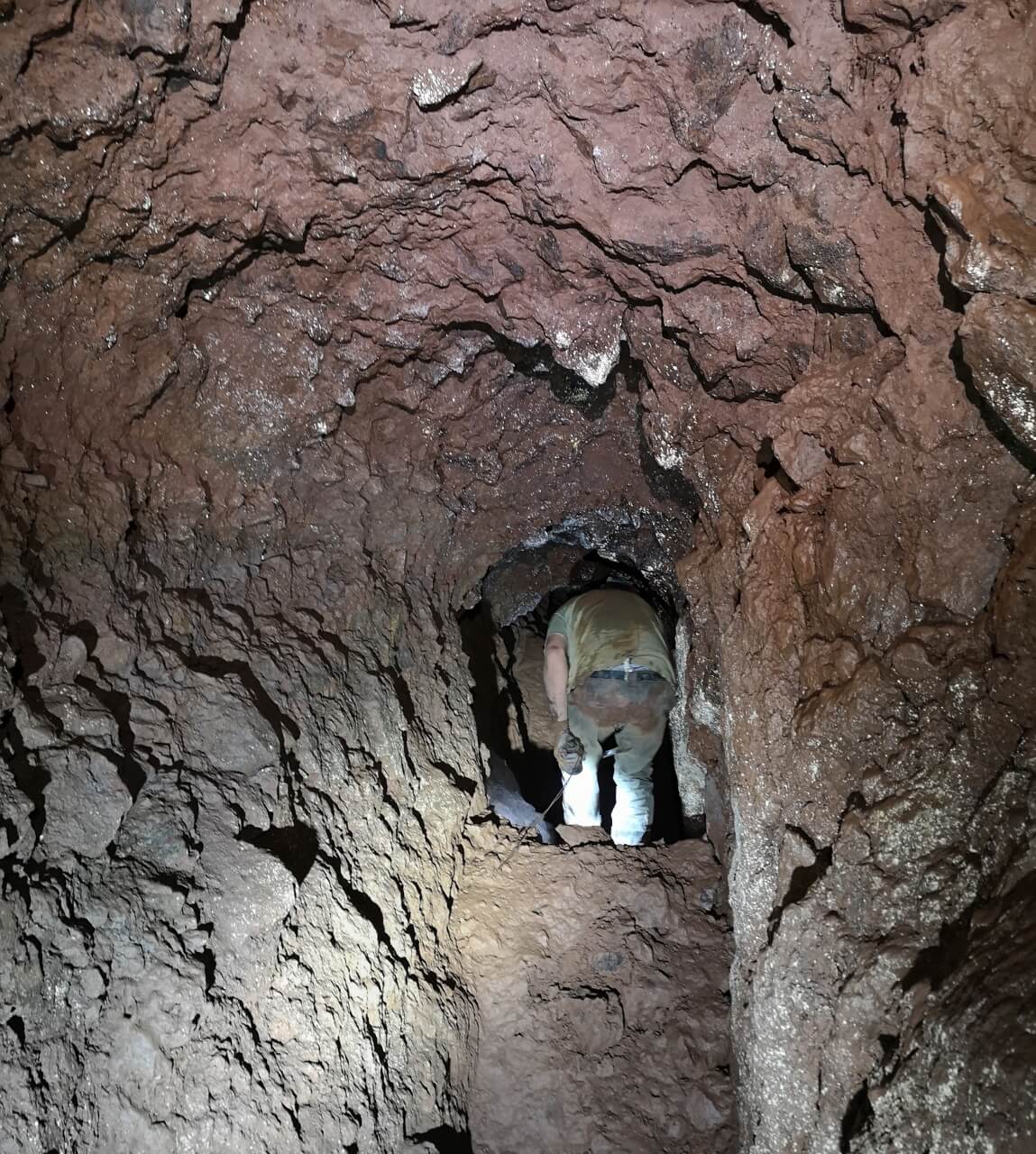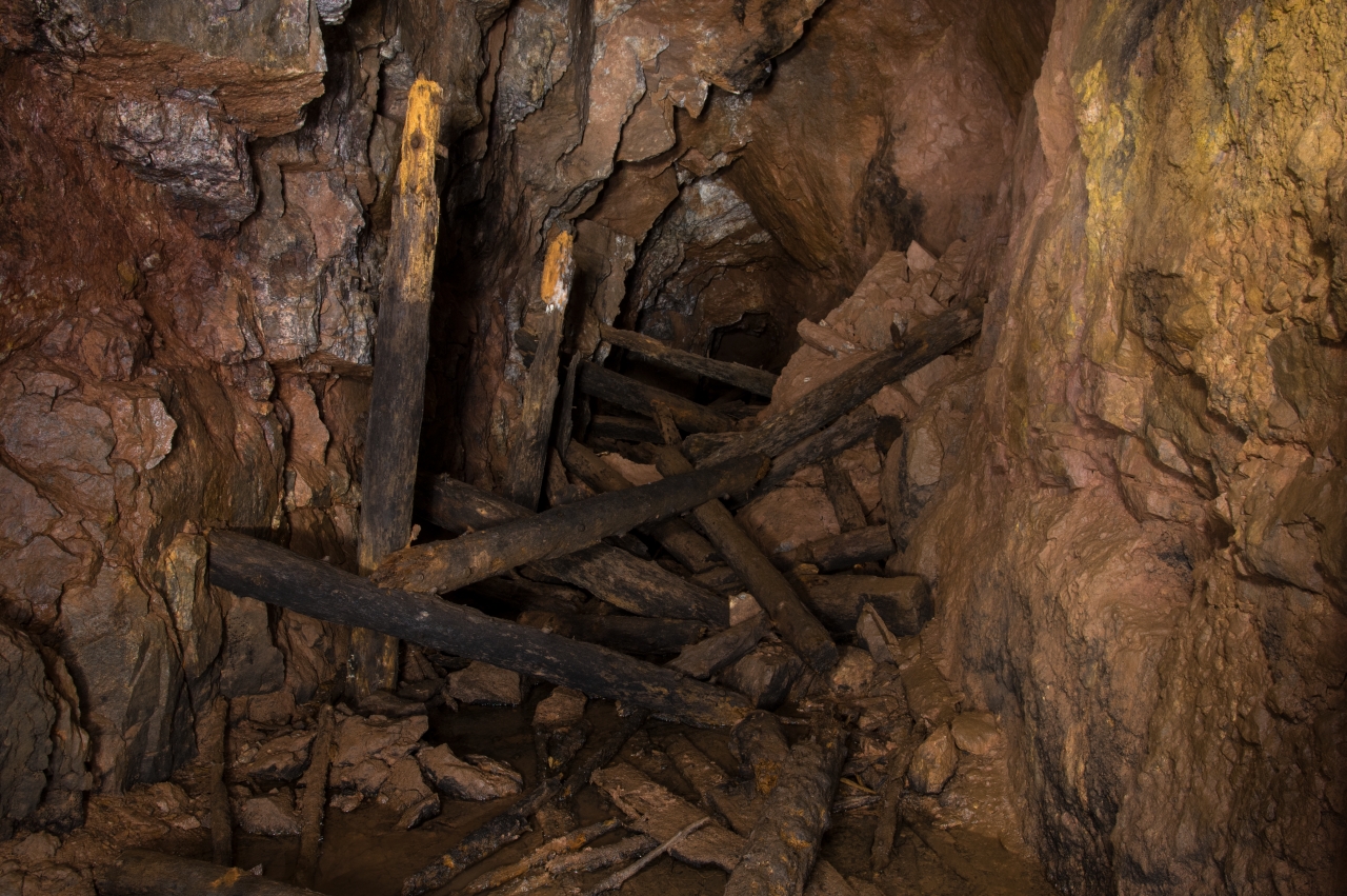 Die zeitliche Epoche der modernen Prospektionsarbeiten endet am Übergang zum historischen Bergbau. Das Stollenprofil verringert sich an dieser Stelle um ein Vielfaches. Spätestens an dieser Stelle wird klar, dass das alte Stollenprofil für die Prospektion nachgerissen wurde. Im anschließenden Stollen ist es nicht mehr möglich, aufrecht zu stehen. Wir konnten uns lediglich in der Hocke weiterbewegen. Der Stollen endet an einem Verbruch. In diesem Bereich wurde Sand und Geröll eingespült. Wir gehen davon aus, dass wir uns hier am markierten Bereich Punkt 4 auf der Karte befinden.