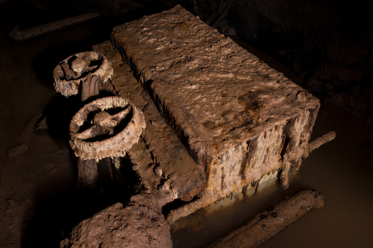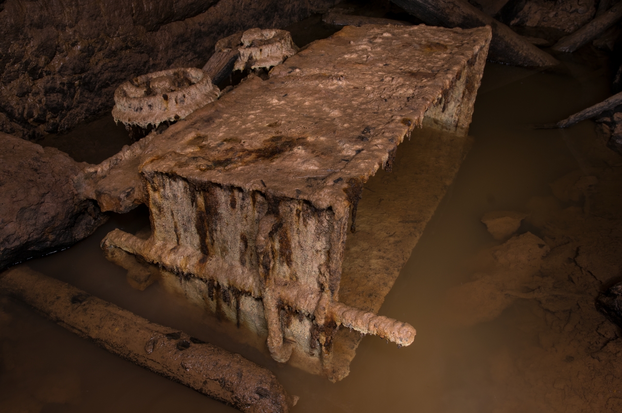 Nur wenige Meter hinter dem Gesenk stand der Abteufkübel, welchen man mittels Haspel in das Gesenk abließ. Die Bergmänner füllten diesen von Hand mit Aushub. Per Haspel zogen sie den vollen Kübel wieder nach oben. Entleerten ihn in den Hunt und fuhren das Material auf die Halde bei Punkt 1. Wir konnten eine Stelle identifizieren, an der die Haspel stand. Nach Einstellung der Prospektionsarbeiten baute man die Gleise zurück und nahm ebenfalls die Haspel mit. Wir fanden an einzelnen Kappen der Türstöcke kleine Isolatoren, daher kann man davon ausgehen, dass die Grube in dieser Zeit elektrifiziert war. Dies höchstwahrscheinlich nur im Rahmen einer Beleuchtung. Bei den Arbeiten kam ebenso Druckluft zum Einsatz. Der Druckluftbehälter liegt heute wie zum Abtransport bereit mitten im Stollen.