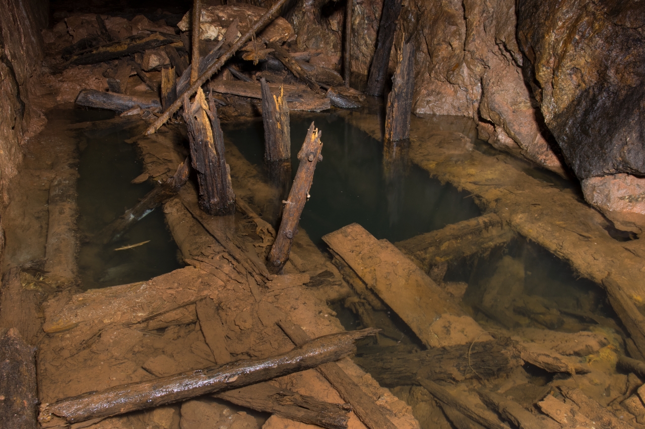 Vorbei am Hunt galt es vorsichtig über die Hölzer zu steigen und weiter Richtung Gesenk vorzudringen. Das Gesenk war das einzig vorab bekannte aus dem Stollen. Hier findet sich in anderer Literatur ein Bild aus den 80er-Jahren. In den letzten Jahrzehnten hat sich dann doch einiges geändert. In dem alten Bild sind deutlich mehr senkrechte Holzelemente und Holzgitter sichtbar. Ebenso der Türrahmen zum Gesenk ist noch vorhanden und das Wasser stand zu der Zeit nicht so hoch wie zu unserem Besuch.