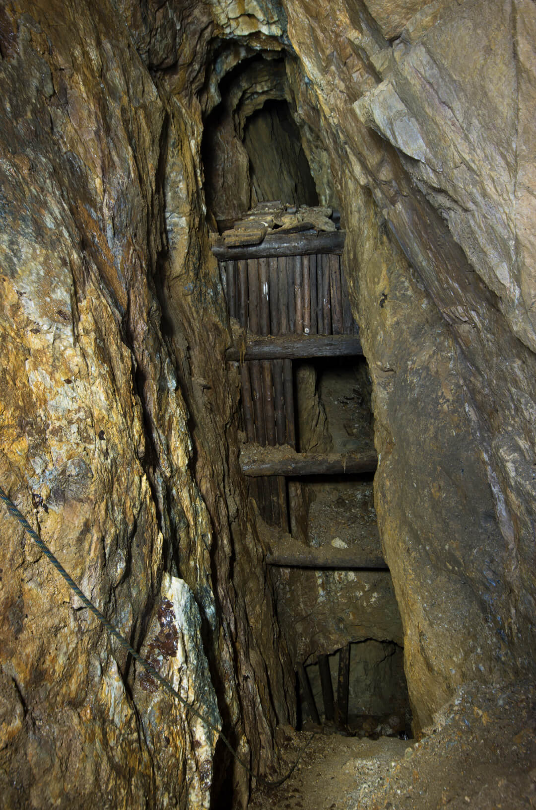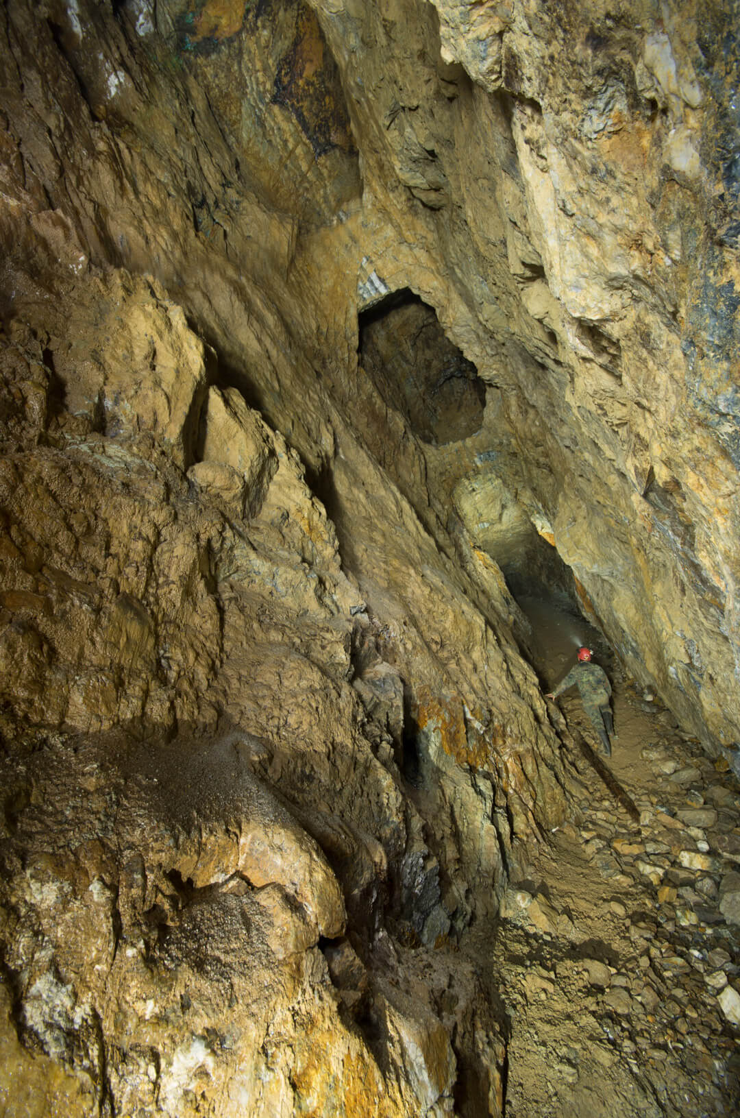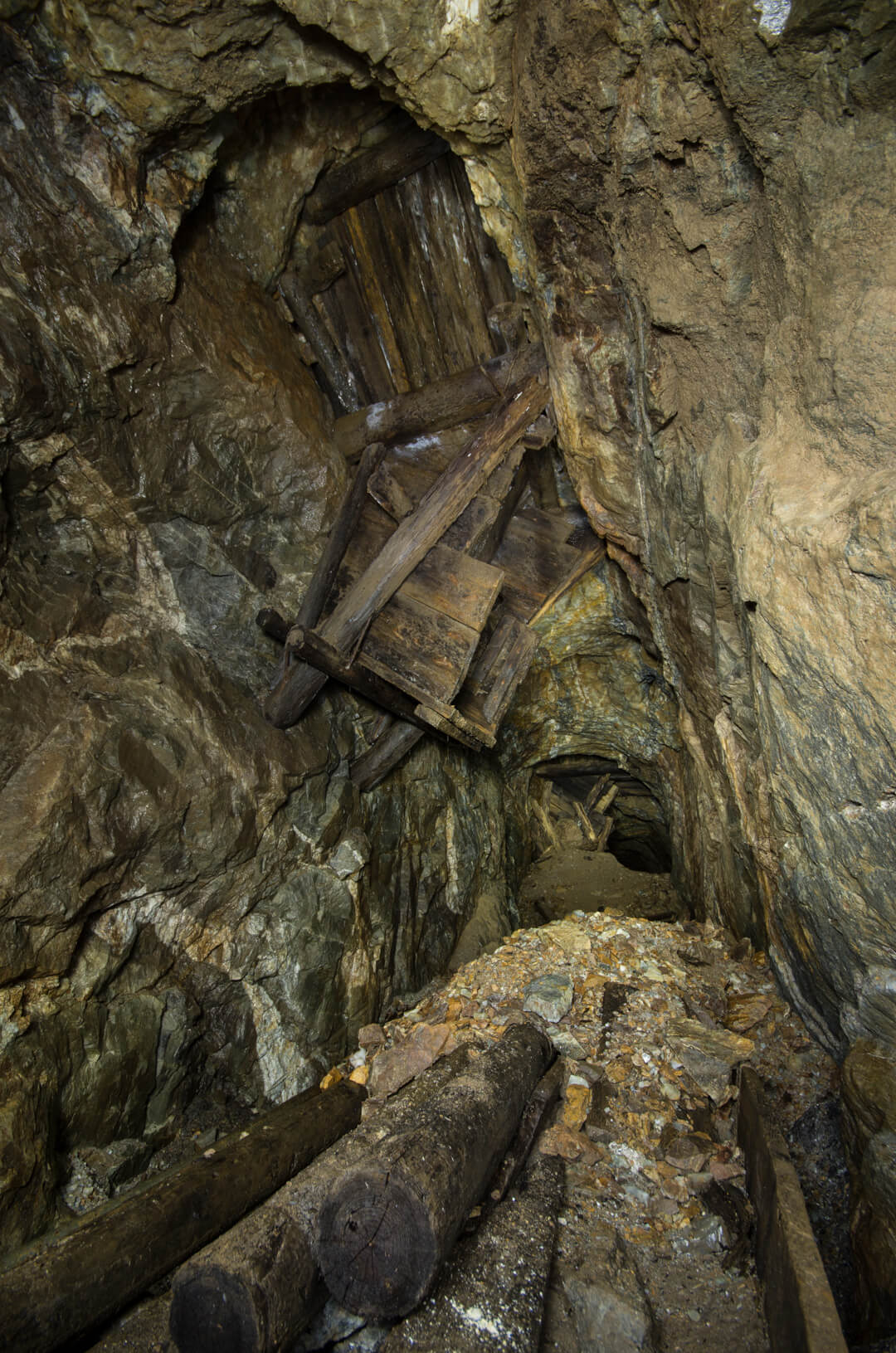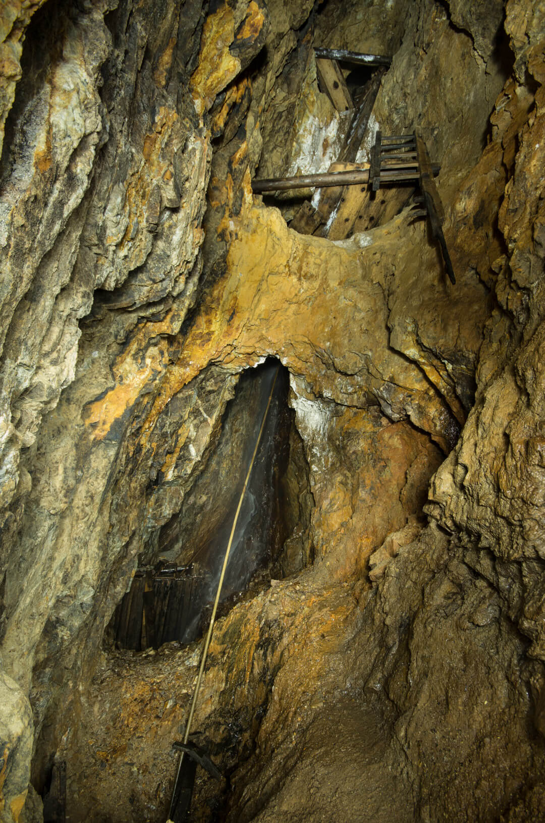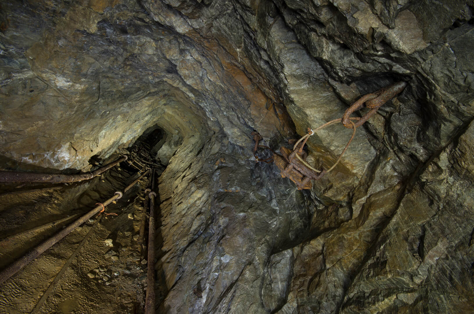 Die gesamte Abseilstrecke bis auf die Stollensohle müsste bei circa 60 Metern liegen. Über den Verhau eingestiegen, seilten wir durch den abgebauten Gang. Die Verhaue lassen sich bis ins 14. Jahrhundert zurückdatieren und führten bereits damals auf Stollen und Abbaue.