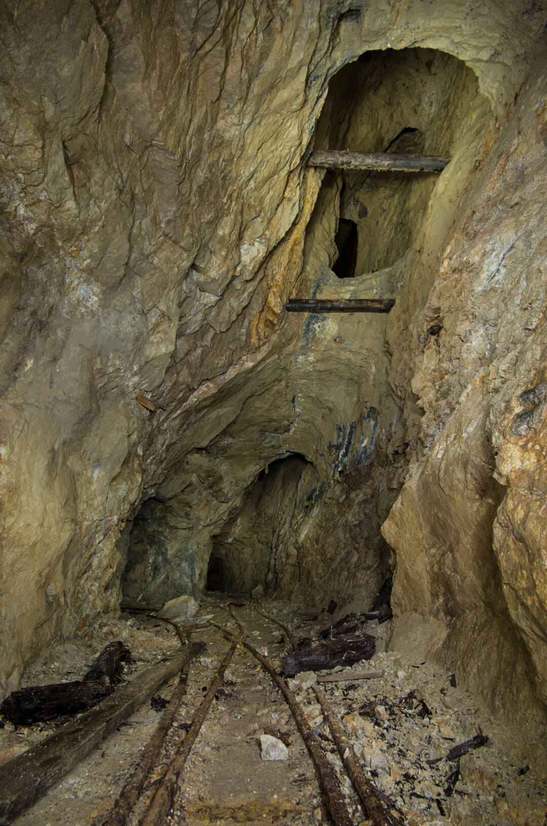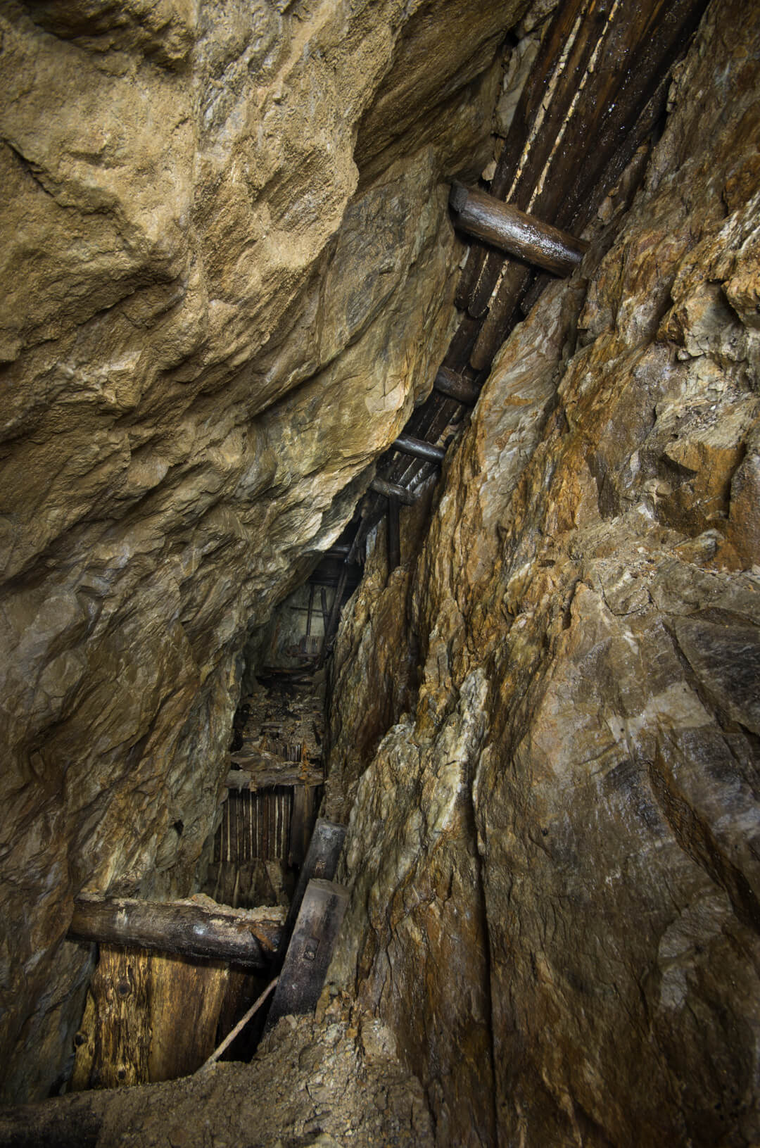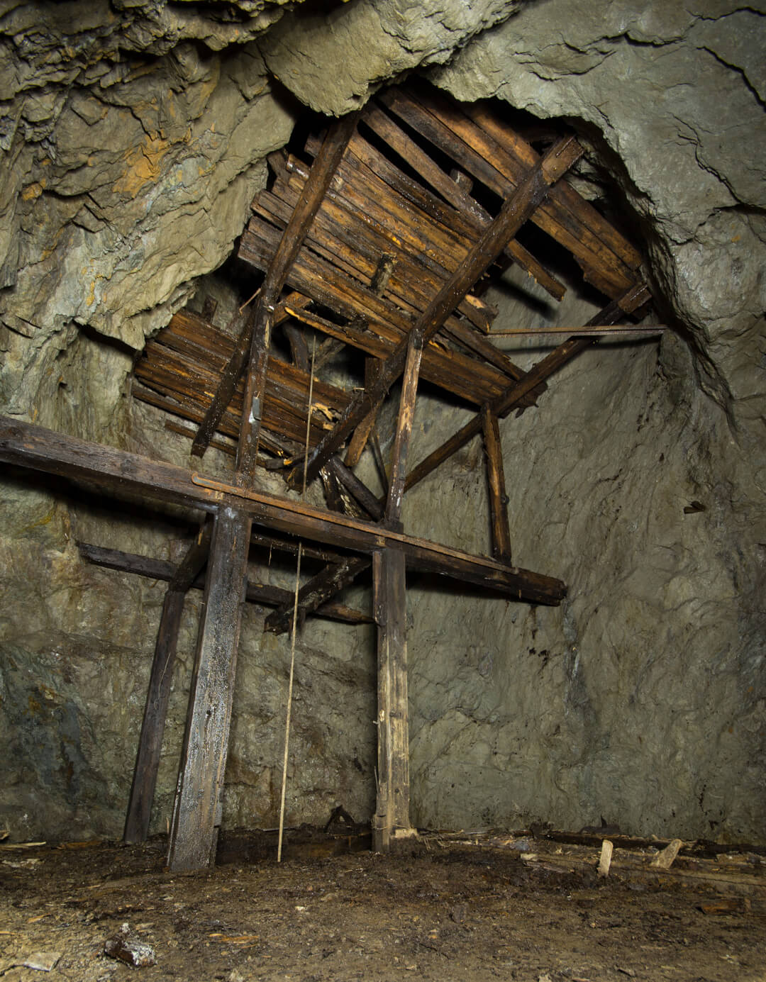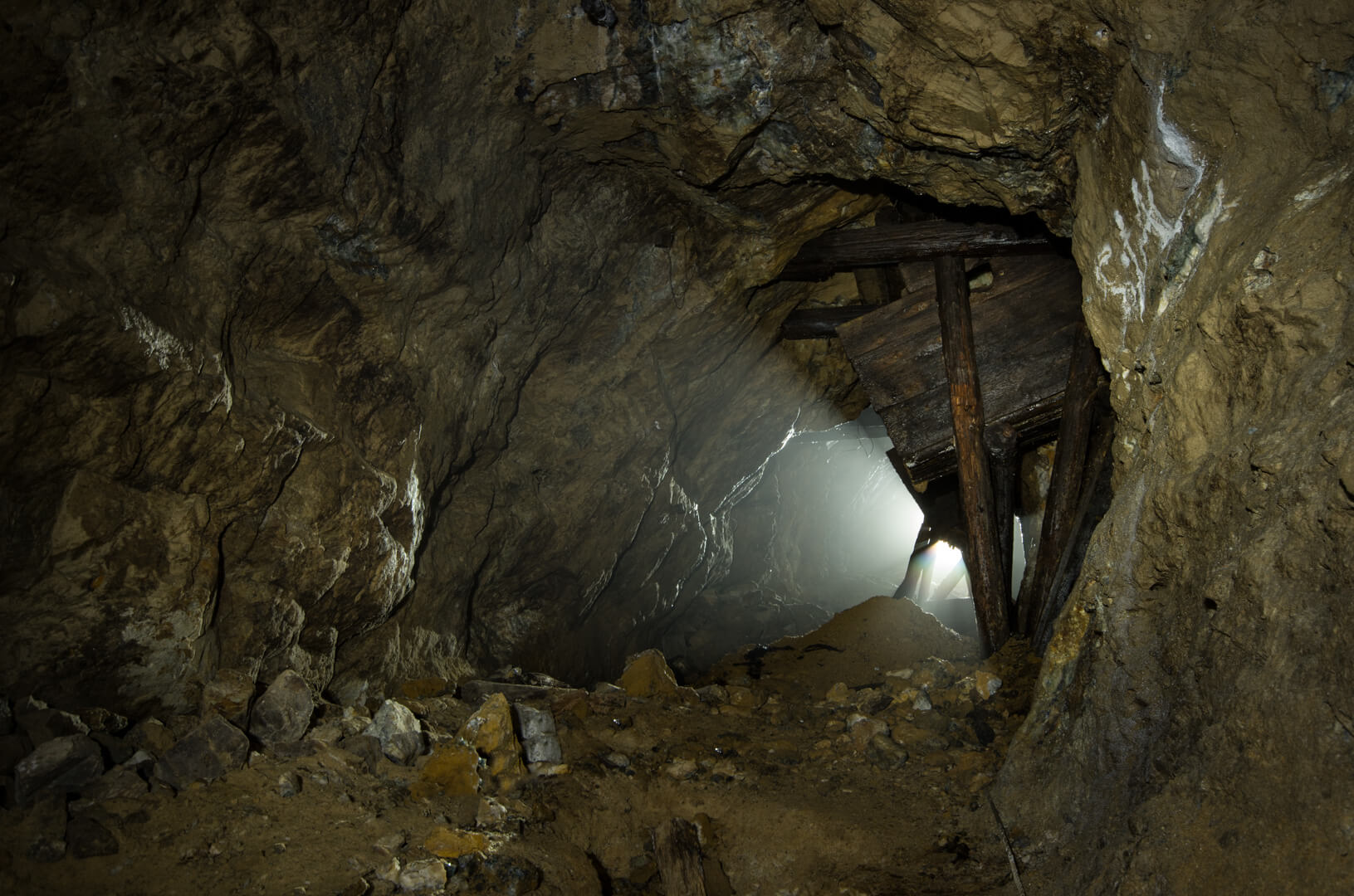 Die gesamte Abseilstrecke bis auf die Stollensohle müsste bei circa 60 Metern liegen. Über den Verhau eingestiegen, seilten wir durch den abgebauten Gang. Die Verhaue lassen sich bis ins 14. Jahrhundert zurückdatieren und führten bereits damals auf Stollen und Abbaue.