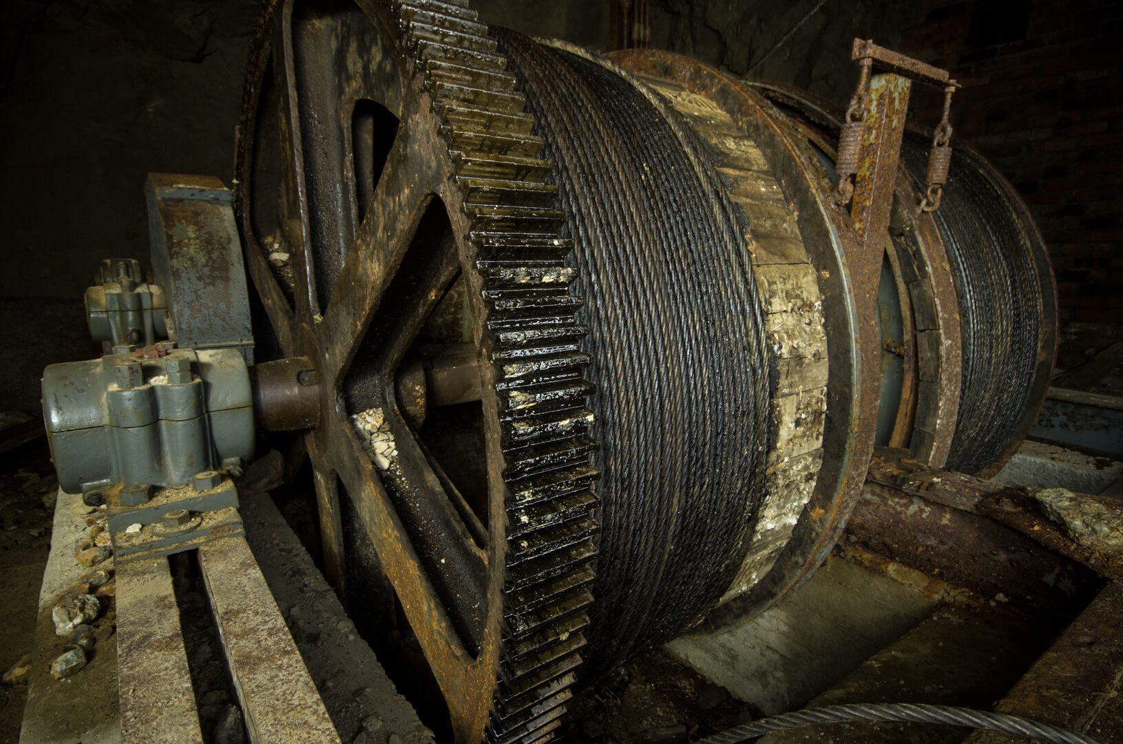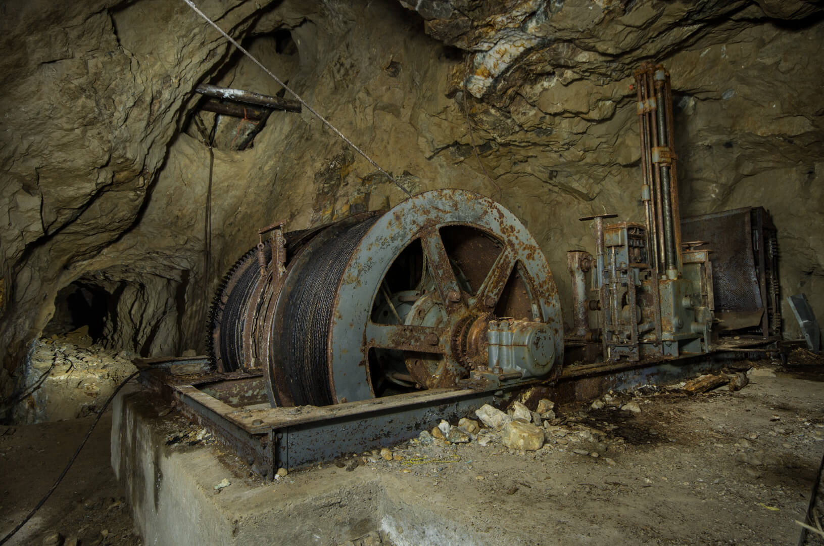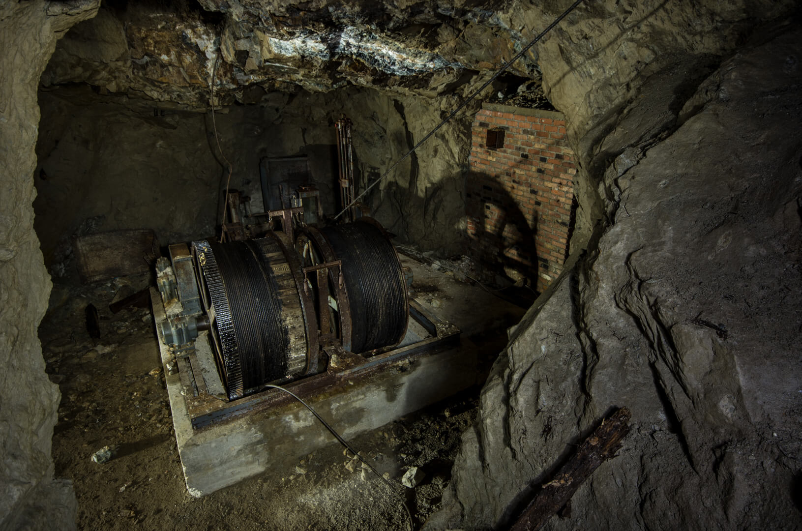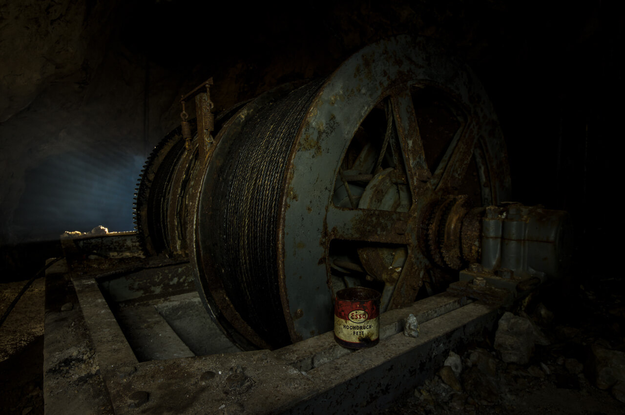 Ein vielfach abgelichtetes Highlight ist die Fördermaschine der Gebrüder Weiss aus Frankfurt am Main, welche im Jahr 1961 montiert wurde. Der dazugehörige Blindschacht verband die tiefer liegenden Sohlen 22 Meter Sohle und 54 mS mit der Stollensohle. Die Abteufung des Schachts auf die 80 mS war geplant und in Arbeit. Ob diese fertiggestellt wurde, erschließt sich nicht aus den mir vorliegenden Quellen. Der Bau des zentralen Blindschachts mit seiner mächtigen Fördermaschine war somit die wichtigste Weiterentwicklung der Grube. Die Fördermaschine und der anschließende Blindschacht waren nur wenige Jahre in Betrieb. Bereits im Jahr 1963 waren die nördlichen Felder ausgeerzt und auf den tieferen Sohlen des südlichen Felds wurden die Bergleute nicht mehr fündig. So sollte der Grubenbetrieb im Jahr 1964 endgültig eingestellt werden.