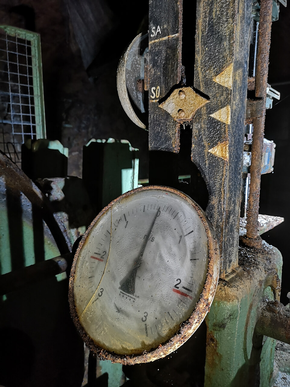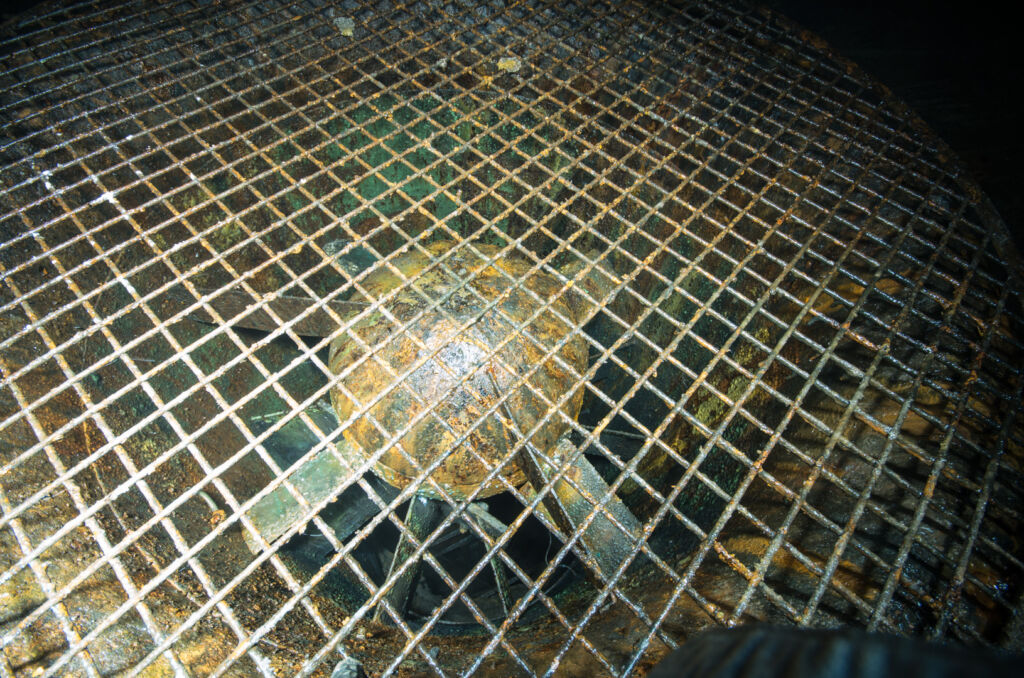 Mittels Seiltechnik war es uns möglich, über den Blindschacht 2 auf die nächste Sohle(100mS) vorzudringen. Von dort gelangt man auch zum Wetterschacht. Auf dem Weg zu diesem passierten wir die zwei mächtigen Rohre der Wetterführung. In den stählernen Rohren mit über 1 Meter Durchmesser sind riesige Lüfter montiert. Sie hatten die Aufgabe, den Wetterzug zwischen den einzelnen Sohlen anzutreiben und somit den Luftaustausch über den anschließenden Wetterschacht herzustellen.