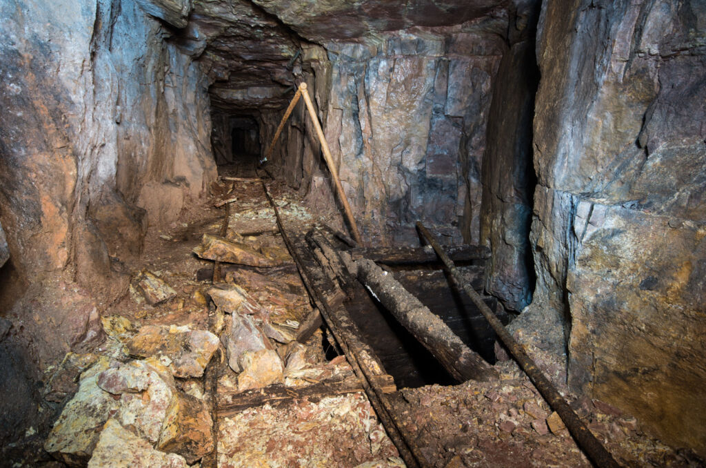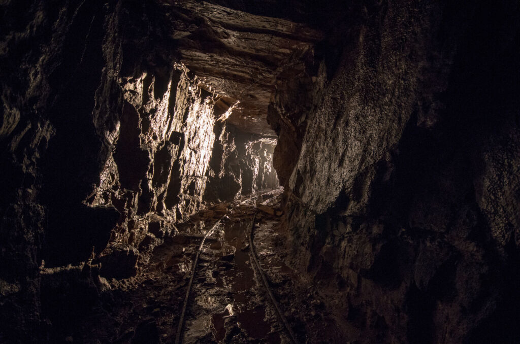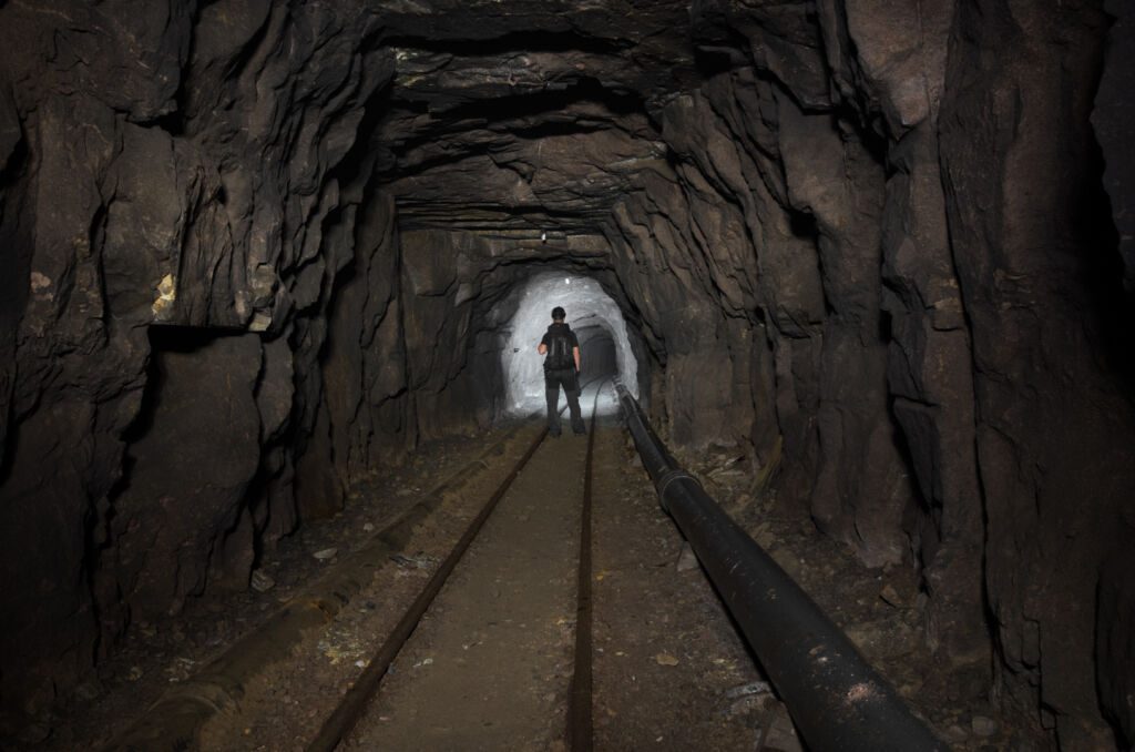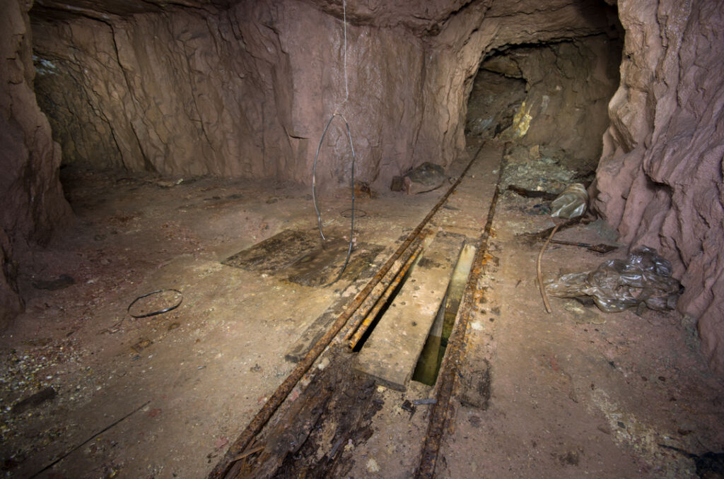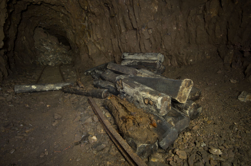 Der Förderstollen der 120 Meter Sohle zeigt so gut wie keinen Verbruch. Lediglich auf den ersten 100 Metern passierten wir eine Störzone mit etwas Material auf der Strecke. Es macht den Eindruck, als wäre an dieser Stelle ein älterer Abbau unterfahren worden, welcher schon zu Betriebszeiten mit Leitplanken gesichert wurde. Direkt dahinter findet sich das Chassis einer Lore.