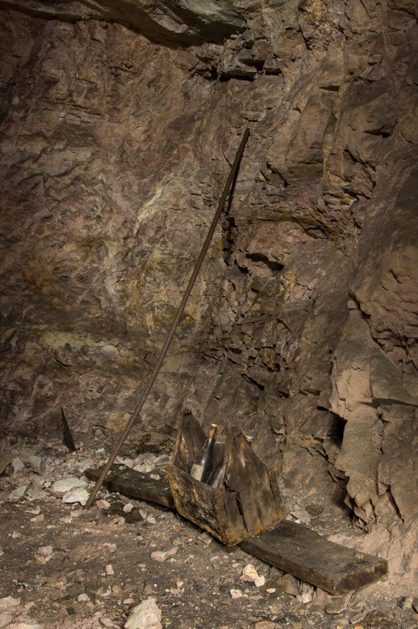 In einem kleinen Querschlag stand noch ein hölzerner Bierkasten wie ein selbst gezimmerter Sechserträger. In diesem befanden sich drei leere Flaschen der Marke „Haigerloher Schloßbräu Export“. Im Abbau fanden sich ebenfalls noch zwei Flaschen. Sicherlich waren mal sechs Flaschen mit eingefahren. Wir konnten allerdings nur 5 finden. Vielleicht bekam eine Flasche der Lok- oder Fördermaschinenführer.