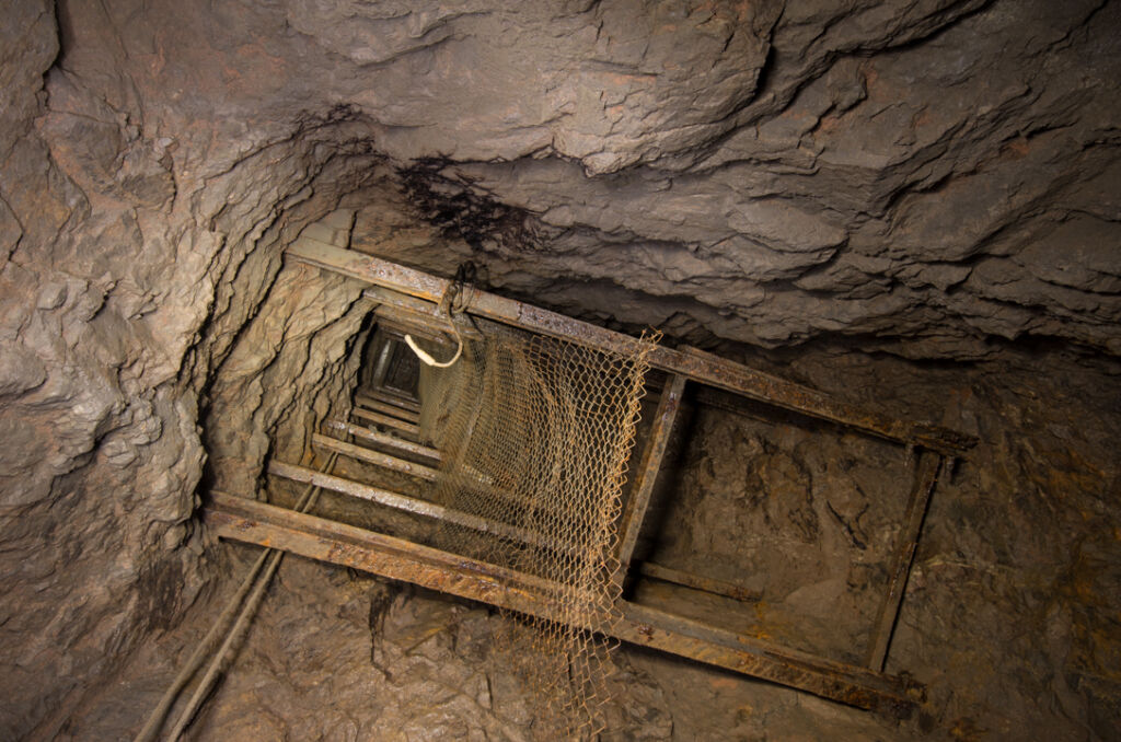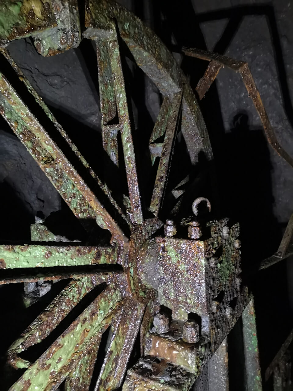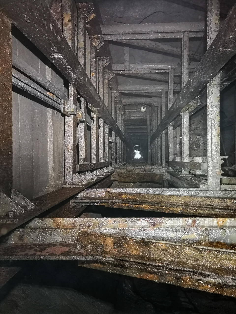 Im weiteren Verlauf der Befahrung bewegten wir uns durch den 1,5 km langen Förderstollen auf den Blindschacht 1 zu. Der Bereich zwischen Blindschacht 1 und 2 vermittelte den Eindruck eines Technikmuseums. Der Blindschacht 1 mit seinen Förderkörben und dem darüberliegenden Wetterschacht. Der Maschinenraum mit seiner nahezu vollständig erhaltenen Fördermaschine. Und zu guter Letzt der Blindschacht 2 mit seinem eingebauten Stahlgerüst.
