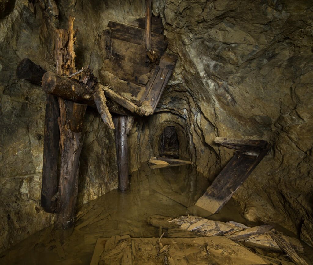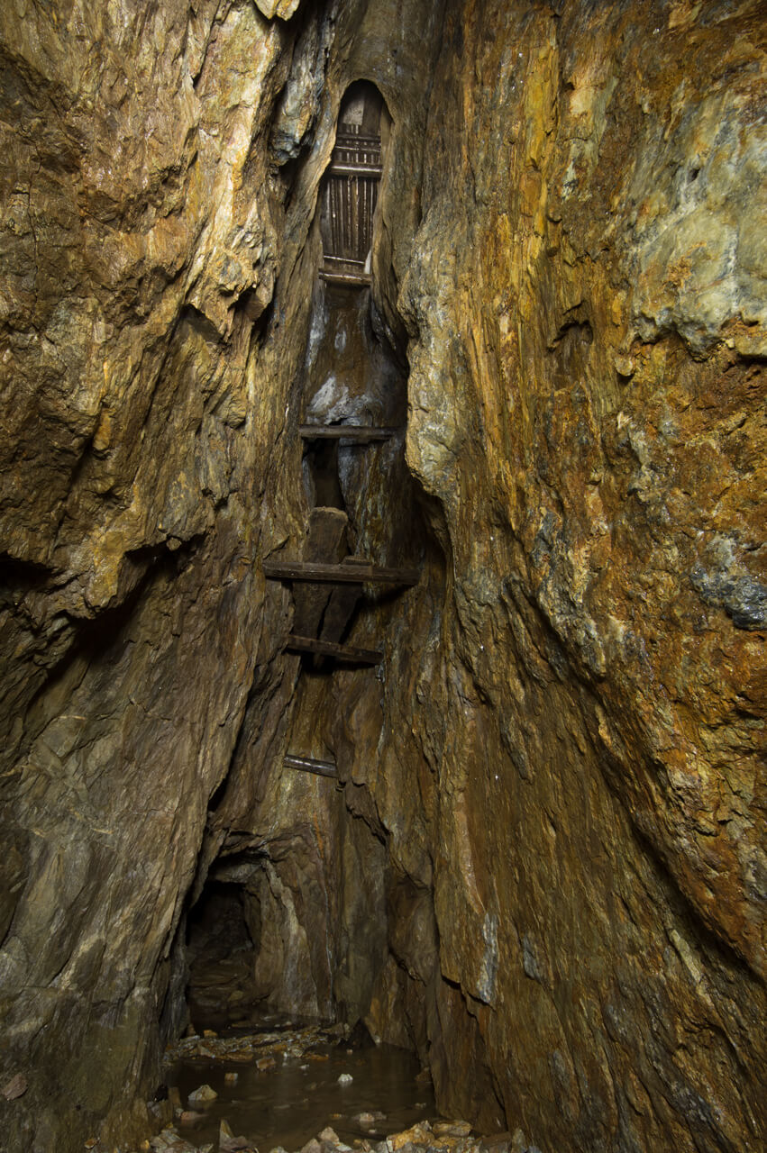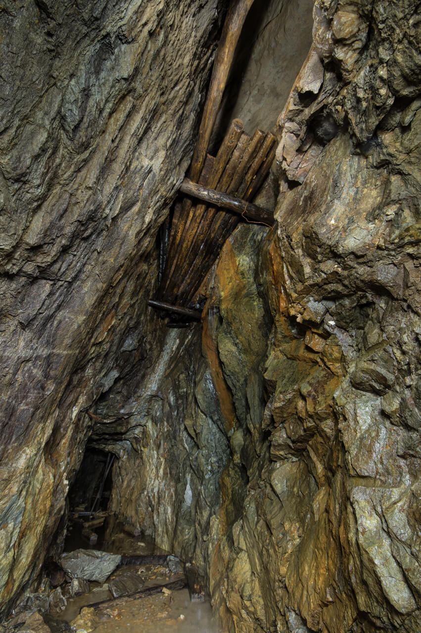 Die Grube ist heute nur mit umfangreicher SRT Technik erreichbar. Im Inneren kann man den Arbeitsablauf noch gut nachvollziehen. Einige Rollen sind bereits zusammengebrochen, wieder andere stehen noch gut da. Im hinteren Bereich finden sich auch größere Verstopfungen. Hier sind Rollen ausgelaufen oder gebrochen. Hinter diesen staut sich das Wasser und ohne Wathose ist das befahren unmöglich.