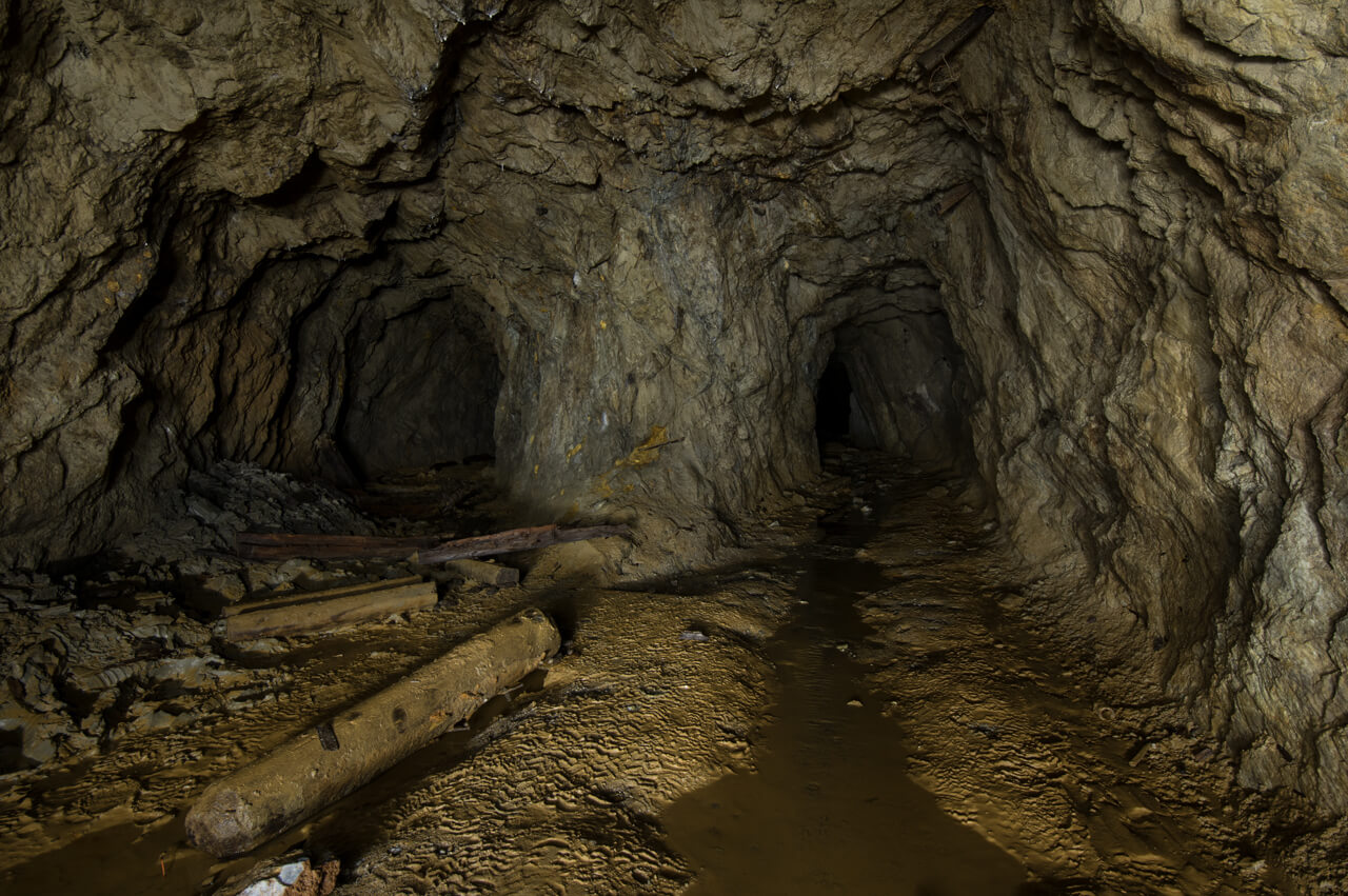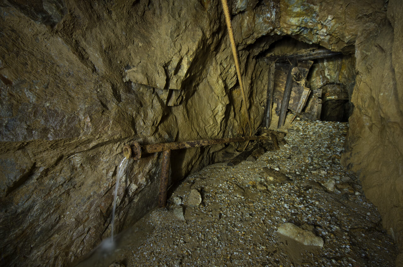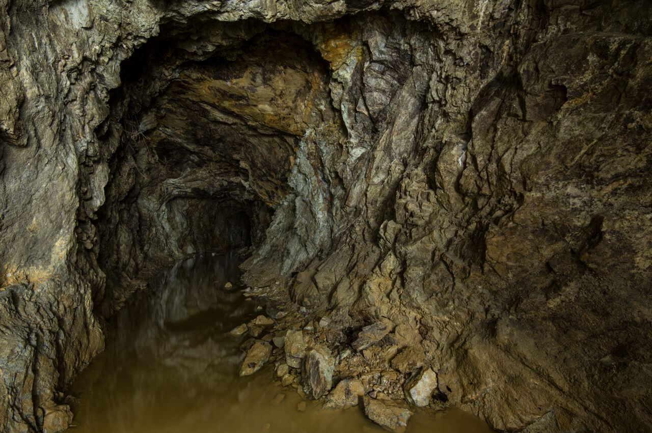 In einer alten Flussspatgrube waten zwei Personen mit Helmen durch knietiefes Wasser und erkunden die unterirdischen Räume.