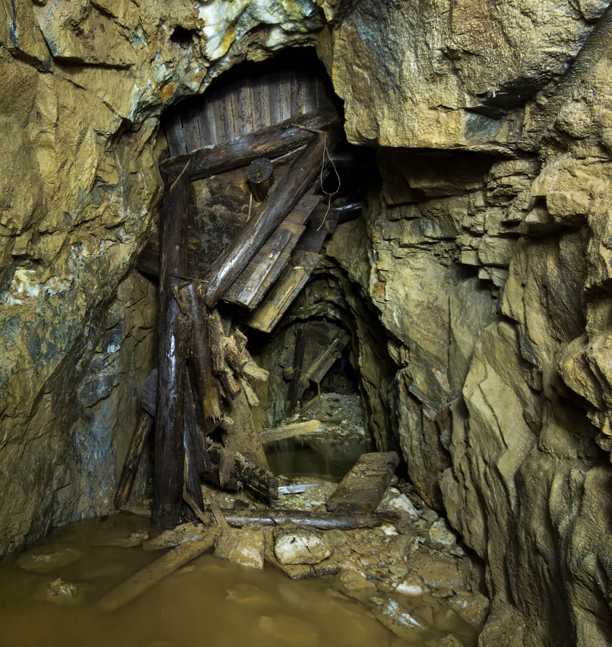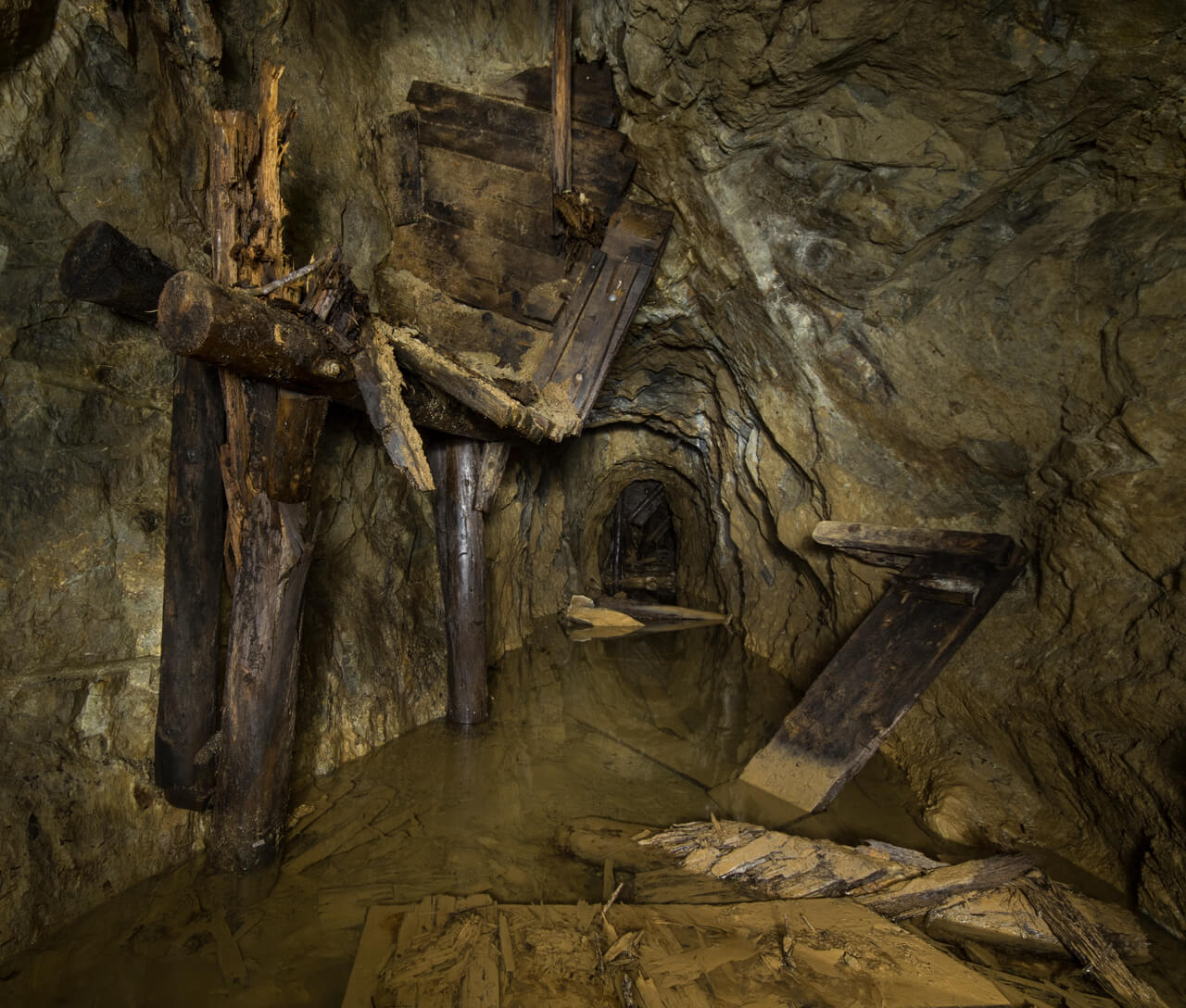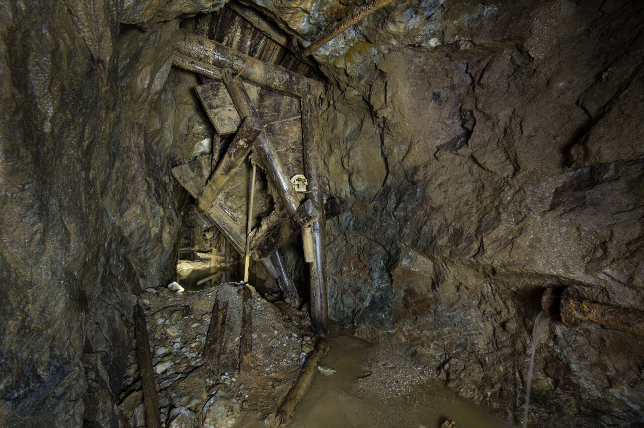 In einer alten Flussspatgrube waten zwei Personen mit Helmen durch knietiefes Wasser und erkunden die unterirdischen Räume.