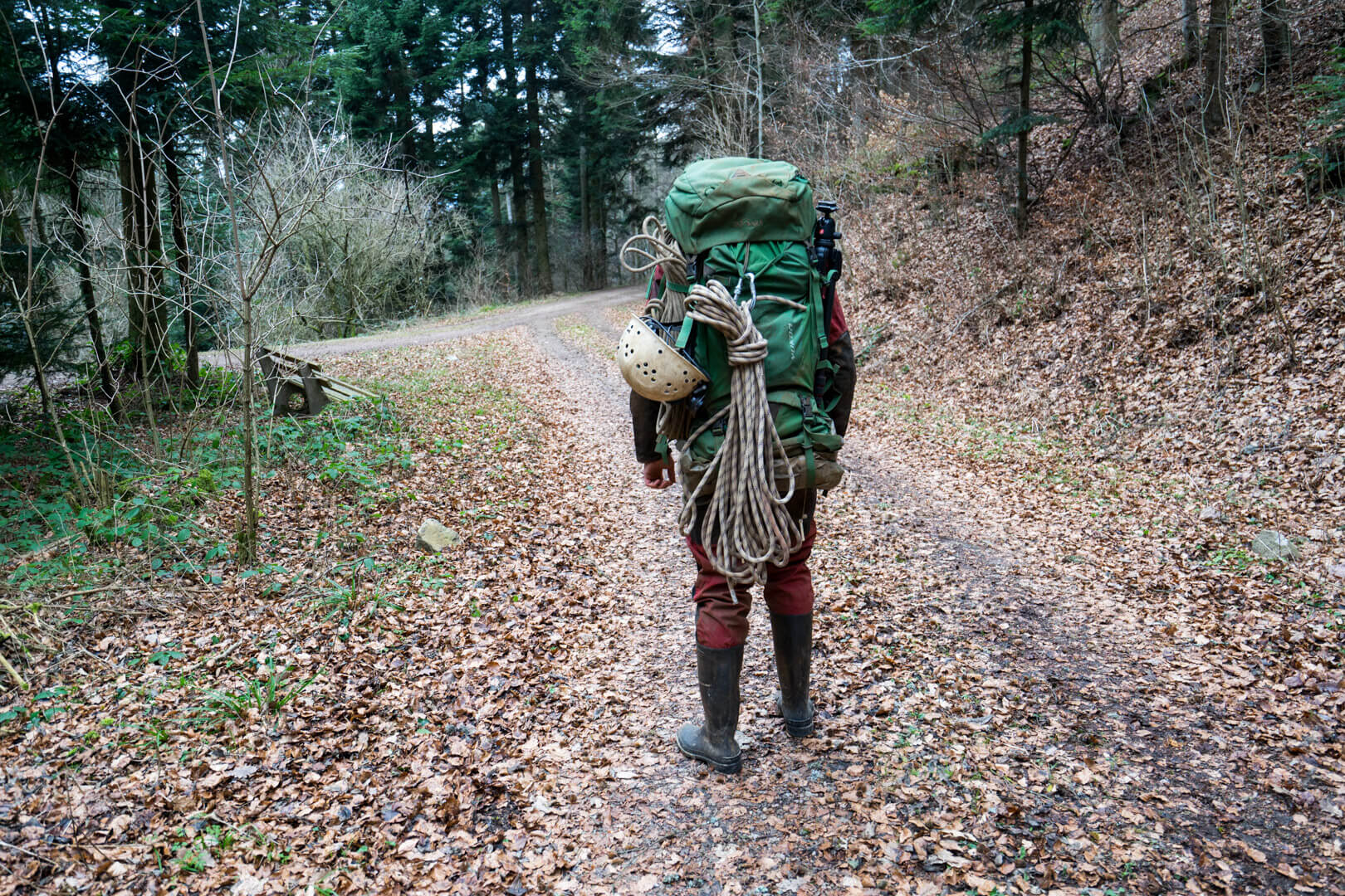 Mit insgesamt 220 Metern Seil in verschiedenen Längen sowie reichlich Anschlagmaterial machten wir uns auf den Weg. Der Zustieg führte durch den Wald in Richtung des ehemaligen Grubeneinstiegs, vorbei an einem Aussichtspunkt, der von Touristen gern genutzt wird. Eine kleine Brücke überspannt ein tief ausgeerztes Quarzriff; sie ist Teil eines Kurwegenetzes der Kurklinik Hausbaden über den Alten Mann.