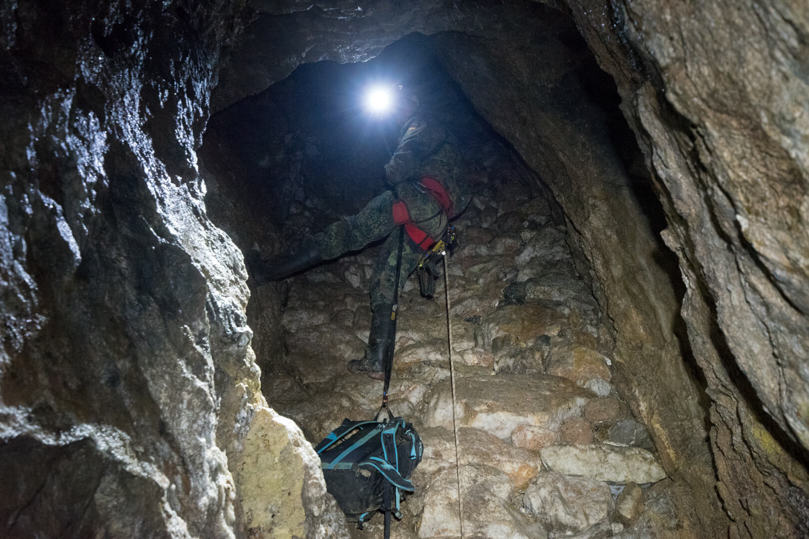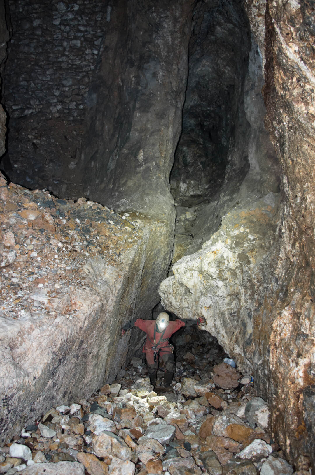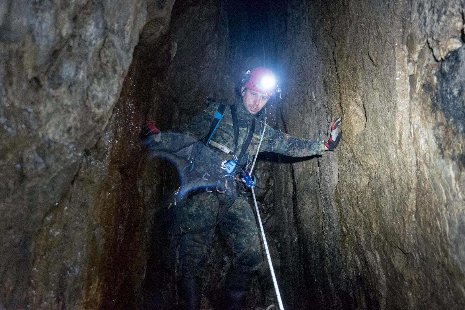 Zu Beginn ging es rund 60 Meter in die Tiefe. Der Abstieg erfolgte durch eine enge Felsspalte. In dieser hatten sich durch eingespültes Geröll zwei kleinere Podeste gebildet. Sie boten zwar kurze Möglichkeiten zum Verschnaufen, stellten jedoch zugleich Hindernisse dar – was wir spätestens beim späteren Aufstieg noch zu spüren bekommen sollten.