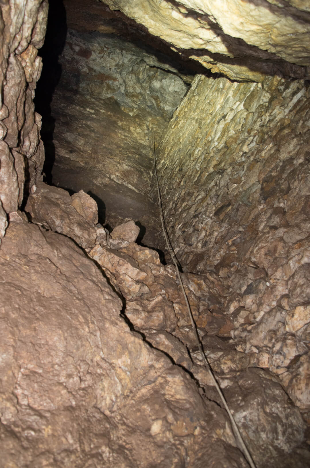 Auf dem letzten Abschnitt der ersten Abseilstrecke glitten wir am Seil durch die schmale Felsspalte hinab in eine riesige Abbauhalle. Dort zeigte sich uns der ausgeerzte Erzgang in seiner gesamten Mächtigkeit.