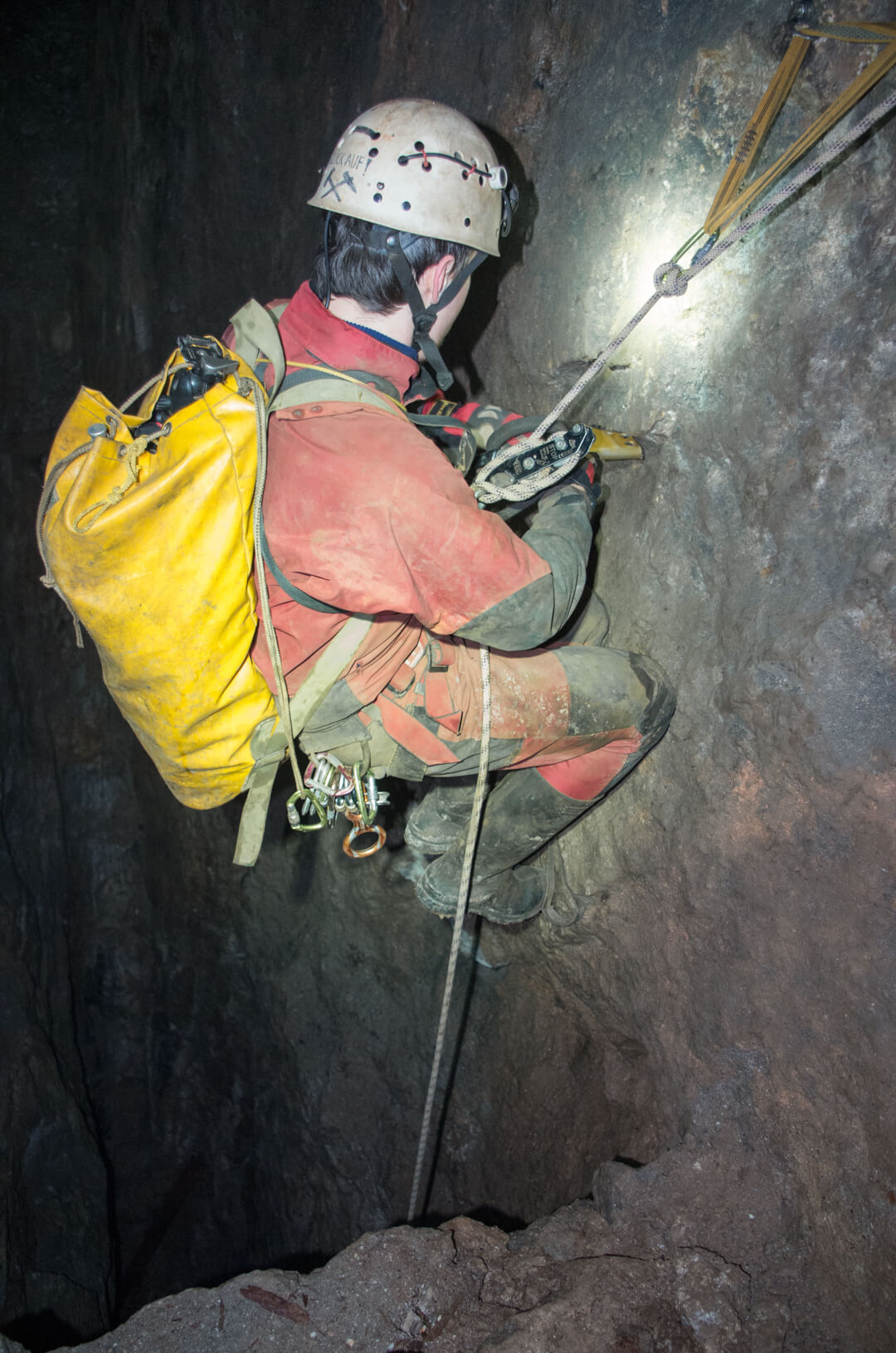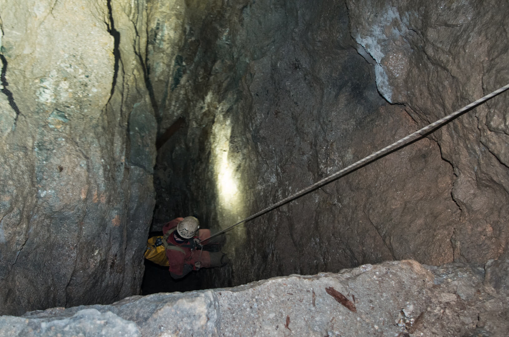 Im weiteren Verlauf der Tour ging es immer tiefer in den Berg. Dafür benötigten wir weitere Seile mit Längen von 30, 20, 30, 40 und 10 Metern. Einige der Abseilstrecken führten an großen Trockenmauern vorbei, von denen manche mehrere Meter hoch waren. Beim Abseilen entlang dieser Mauern entdeckte ich immer wieder Mineralisierungen und kleinere Drusen. Um welche Mineralien es sich dabei genau handelte, entzog sich jedoch meiner Kenntnis – dieses Gebiet überlasse ich lieber den Experten.