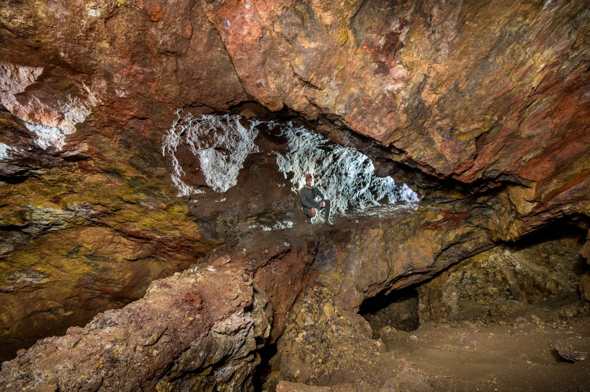 Die obere Sohle präsentiert sich schon auf den ersten Metern in einem erstaunlichen Farbspektrum. Stöße und Firste sind mit warmen Farben überzogen. An der Firste zieht sich ein Terracotta farbenes Band entlang, während die Stöße in einem sanften Pfirsichton erscheinen. Die zerklüftete Struktur der Firste wirft scharfe Schatten in den Stollen. Und aus der Ferne dringt das Geräusch von plätschernden Wasser durch die Strecke.