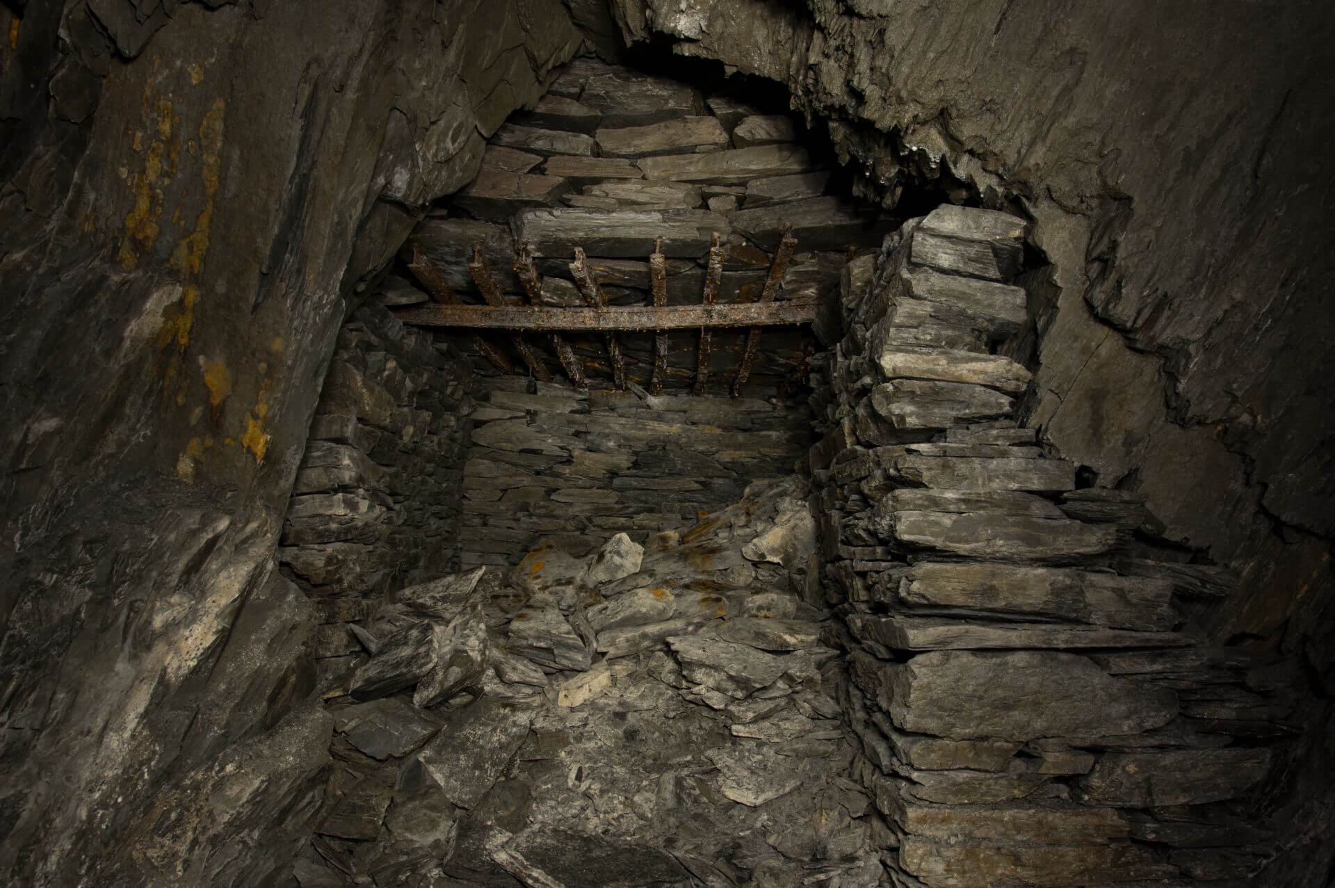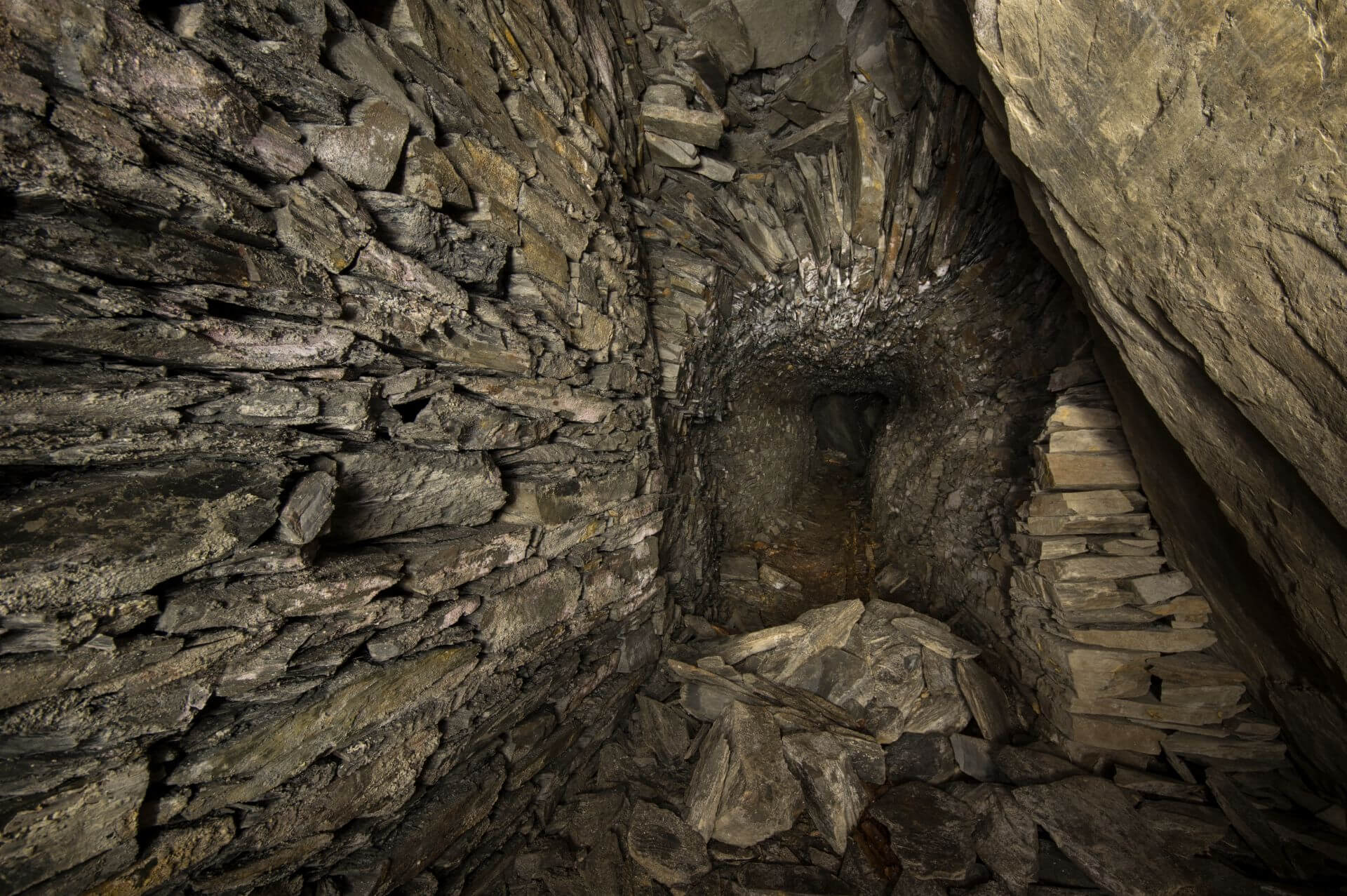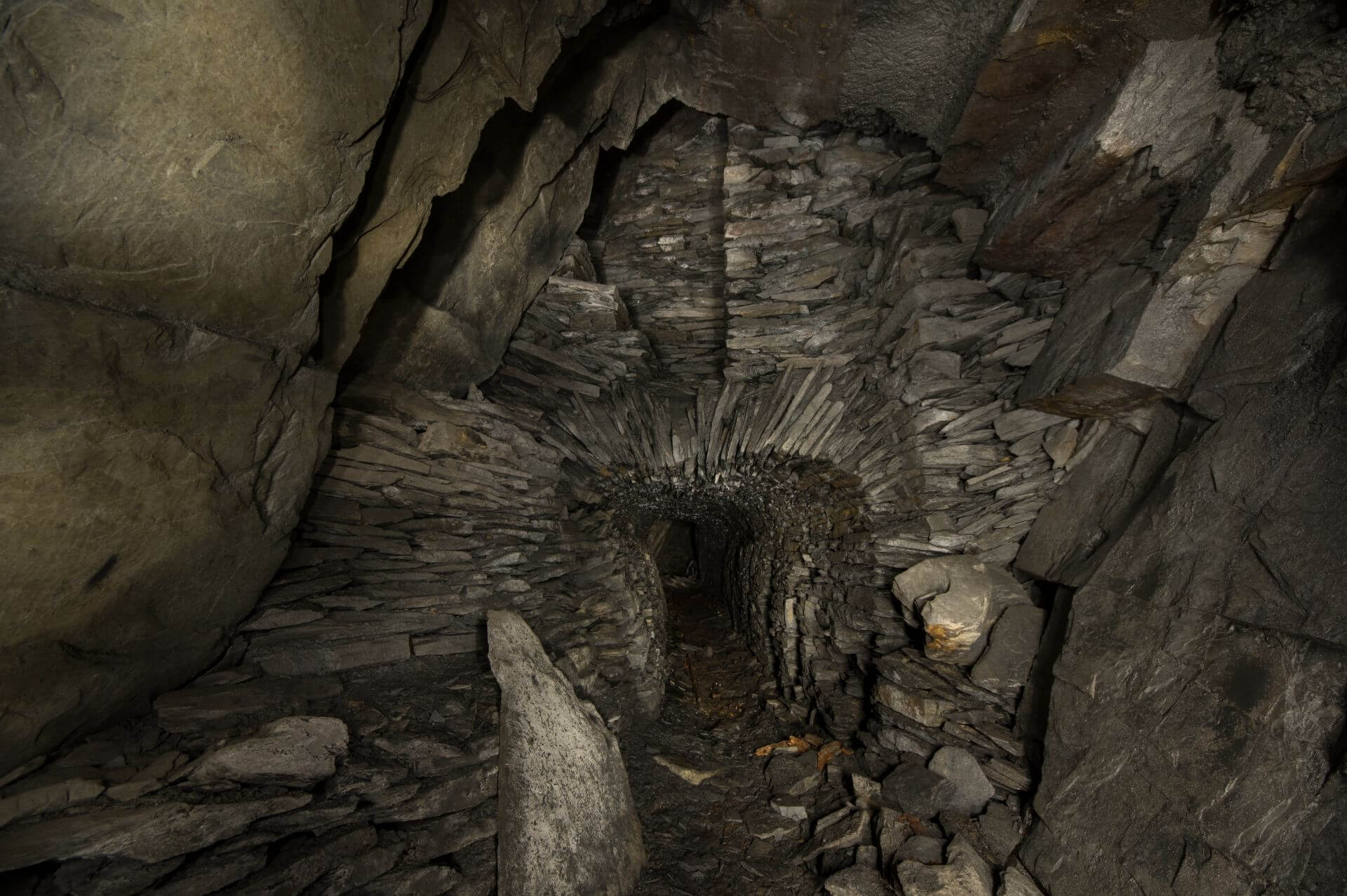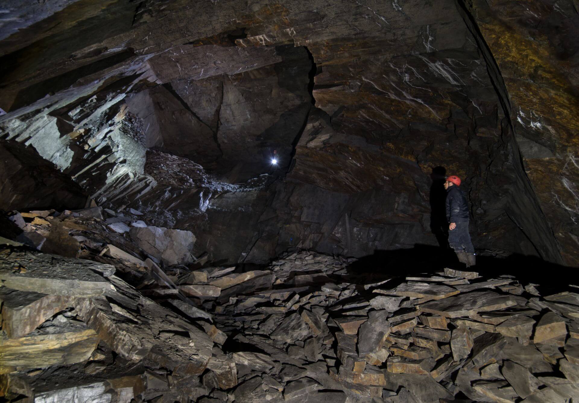 Der Einstieg war eng, brüchig und glich einer Partie Mikado, bei der man kein Stäbchen zum wackeln bringen möchte. So vermochten auch wir keinen Stein zu berühren und passierten mit voller Aufmerksamkeit die Engstelle, welche durch eine verbrochene Trockenmauerung entstanden ist. Nachdem wir diese überwunden haben, standen wir in einer wunderschönen Bogenmauerung aus Schieferstein. Der so ausgebaute Streckenabschnitt führte direkt in die riesige Abbauhalle. Eine Halle so groß, dass unsere Helmlampen die Ausmaße nicht vollständig erfassen konnten.