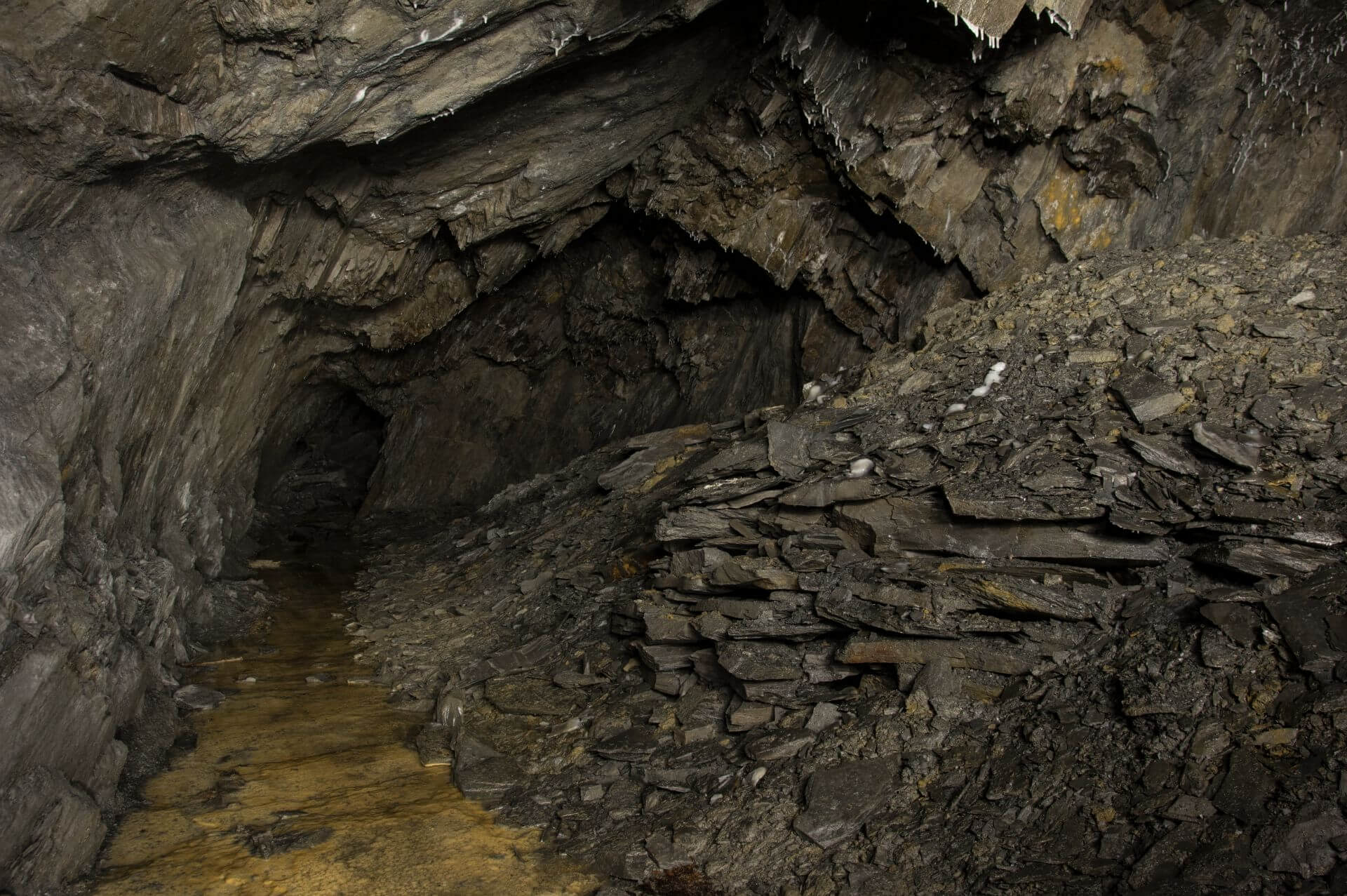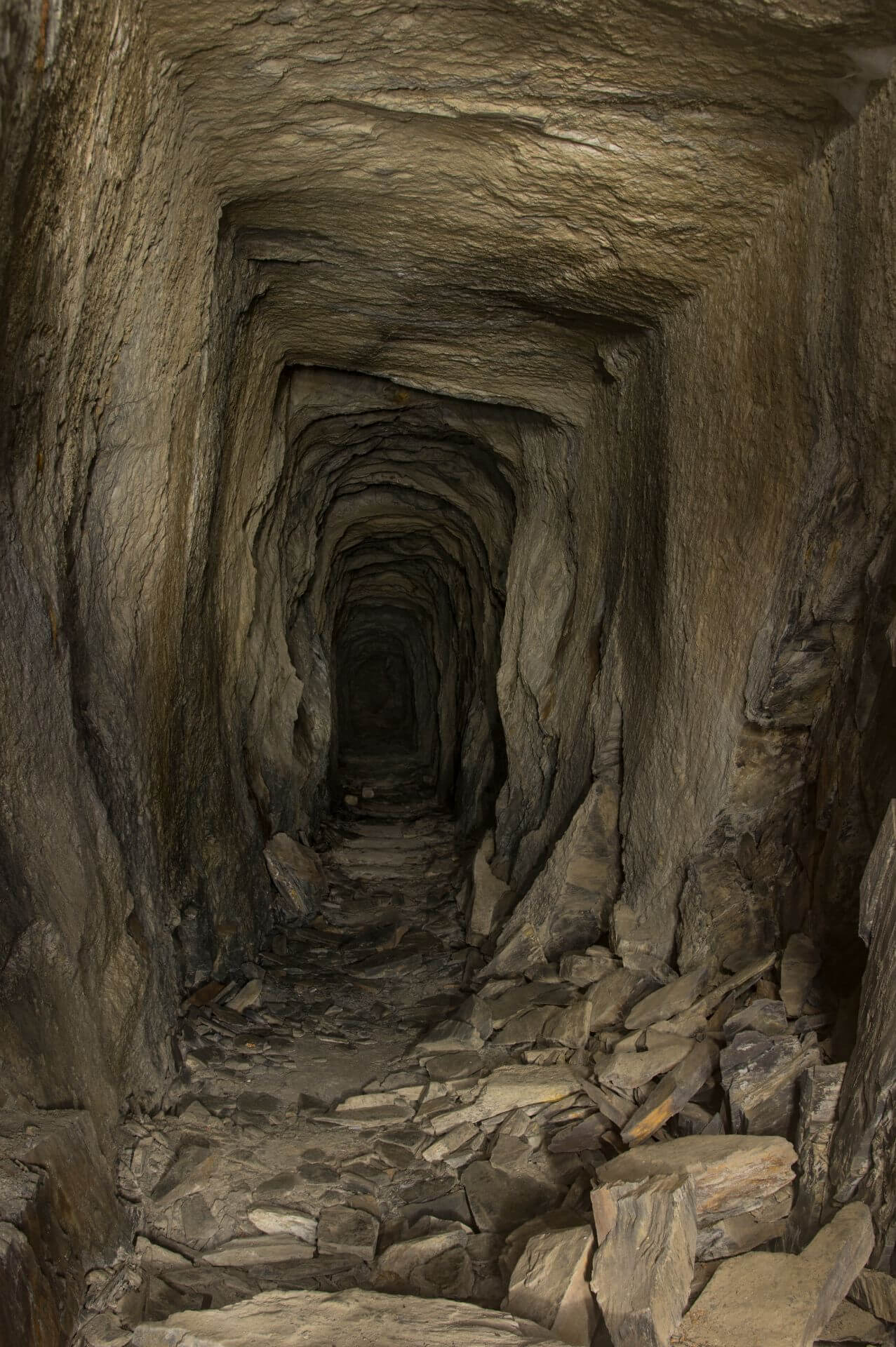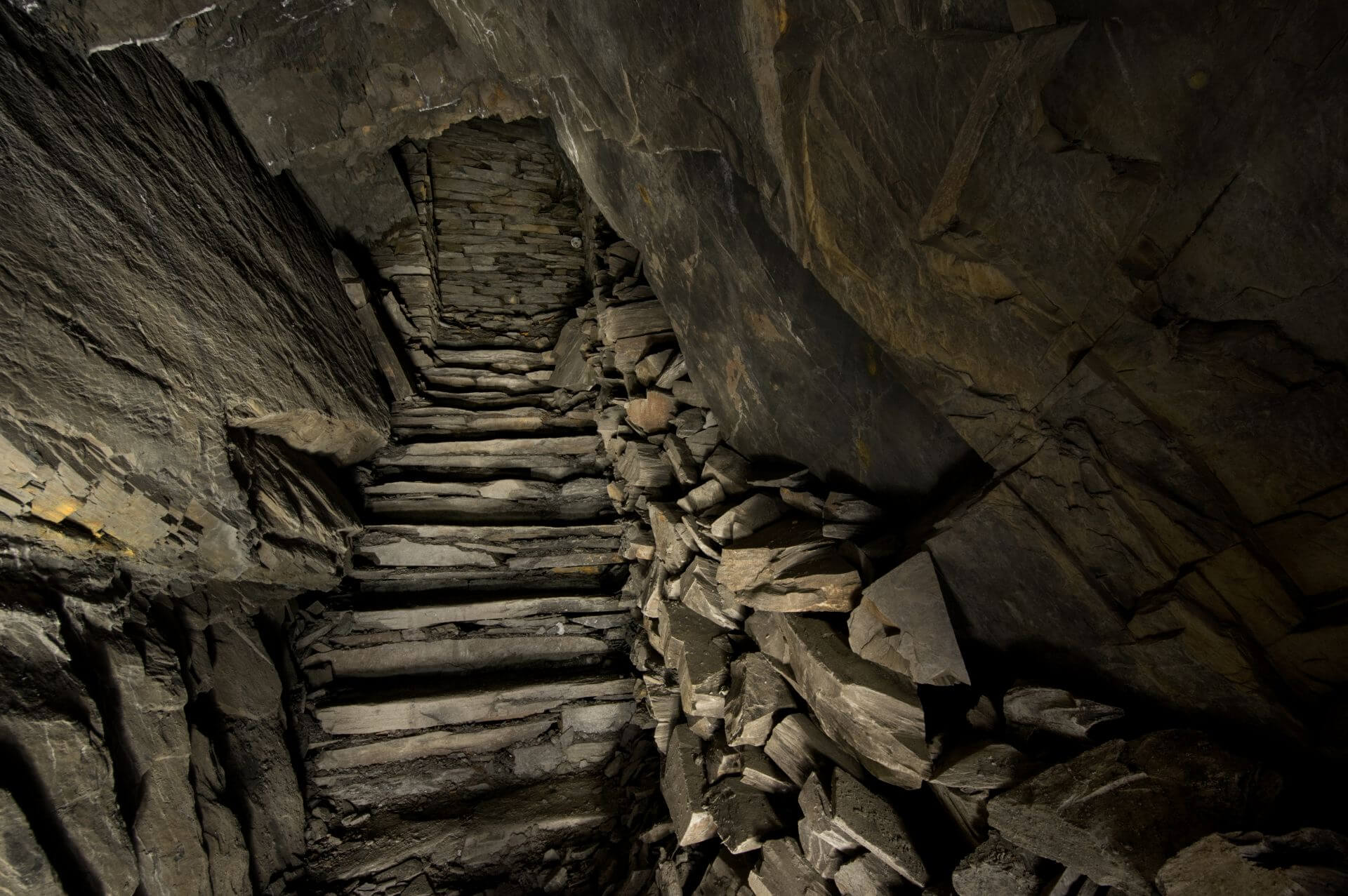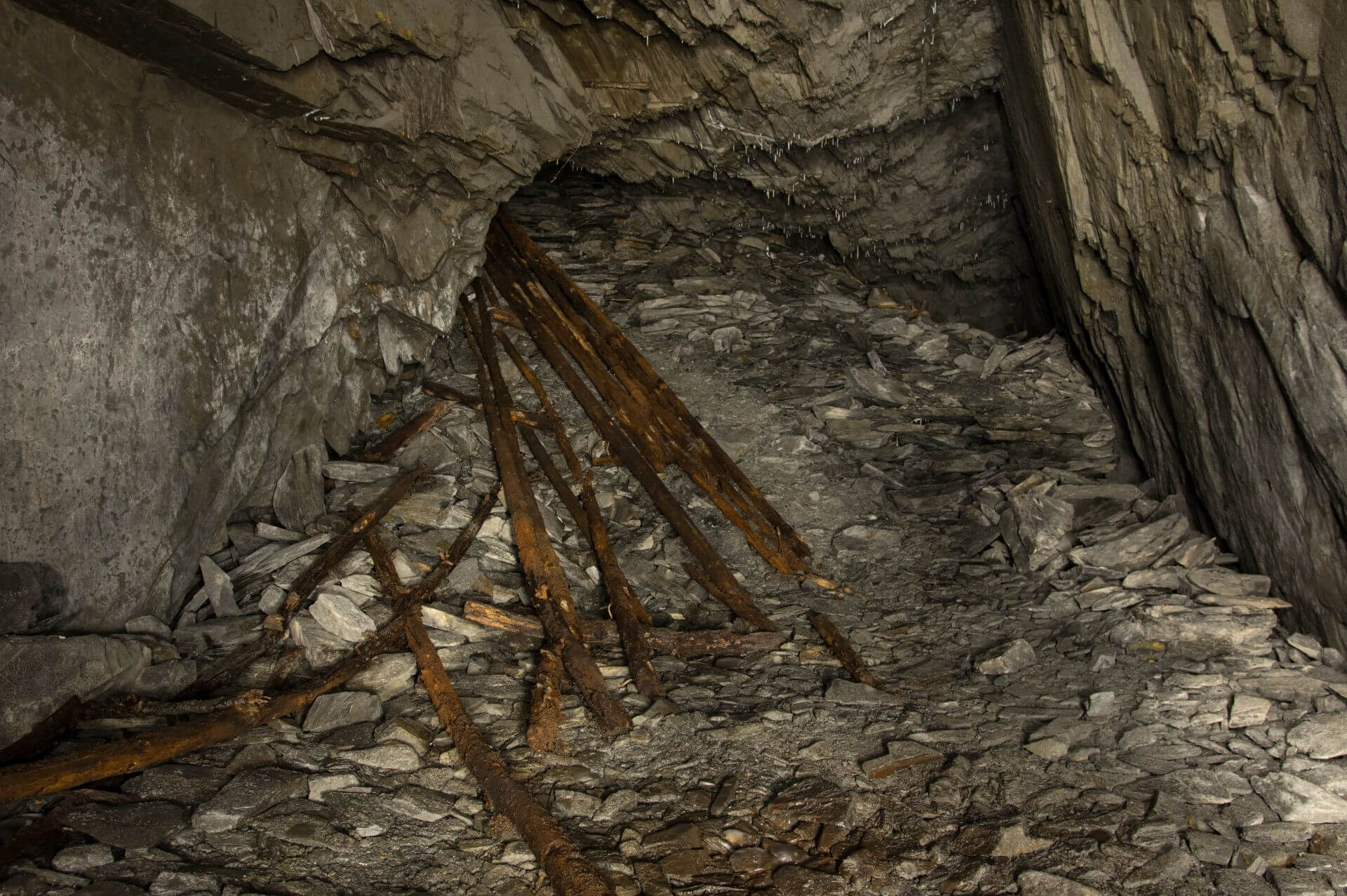 Der Einstieg war eng, brüchig und glich einer Partie Mikado, bei der man kein Stäbchen zum wackeln bringen möchte. So vermochten auch wir keinen Stein zu berühren und passierten mit voller Aufmerksamkeit die Engstelle, welche durch eine verbrochene Trockenmauerung entstanden ist. Nachdem wir diese überwunden haben, standen wir in einer wunderschönen Bogenmauerung aus Schieferstein. Der so ausgebaute Streckenabschnitt führte direkt in die riesige Abbauhalle. Eine Halle so groß, dass unsere Helmlampen die Ausmaße nicht vollständig erfassen konnten.