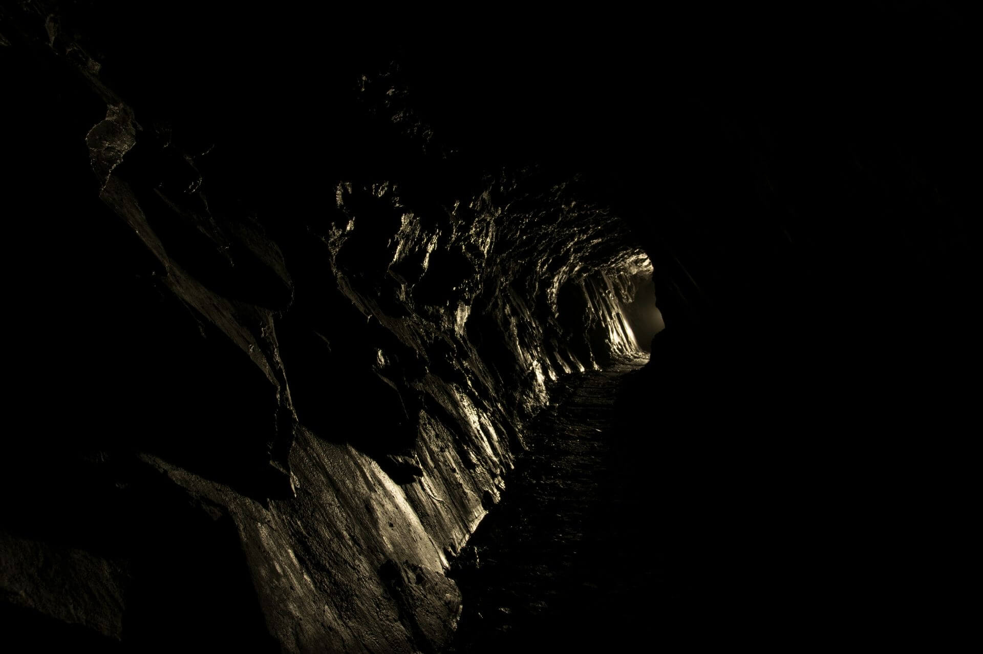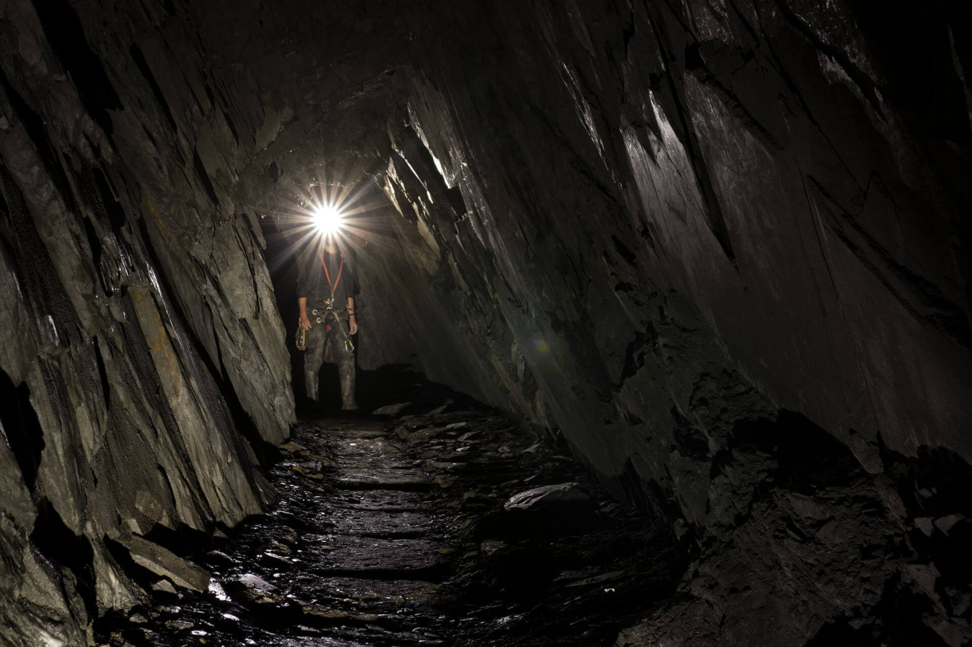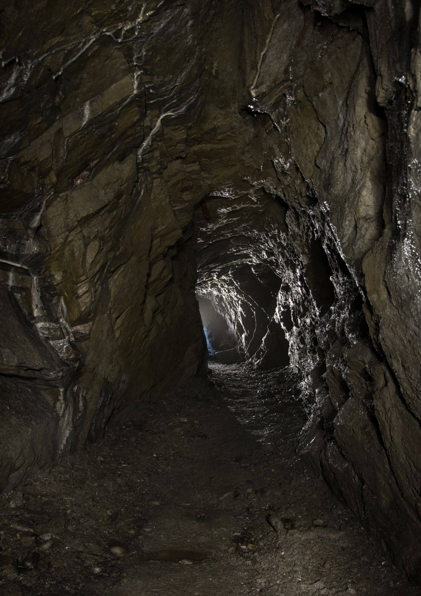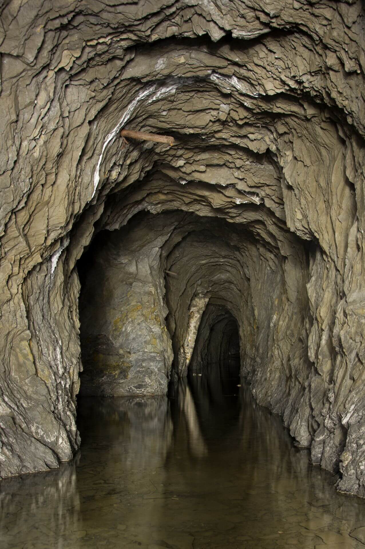 Der Einstieg war eng, brüchig und glich einer Partie Mikado, bei der man kein Stäbchen zum wackeln bringen möchte. So vermochten auch wir keinen Stein zu berühren und passierten mit voller Aufmerksamkeit die Engstelle, welche durch eine verbrochene Trockenmauerung entstanden ist. Nachdem wir diese überwunden haben, standen wir in einer wunderschönen Bogenmauerung aus Schieferstein. Der so ausgebaute Streckenabschnitt führte direkt in die riesige Abbauhalle. Eine Halle so groß, dass unsere Helmlampen die Ausmaße nicht vollständig erfassen konnten.