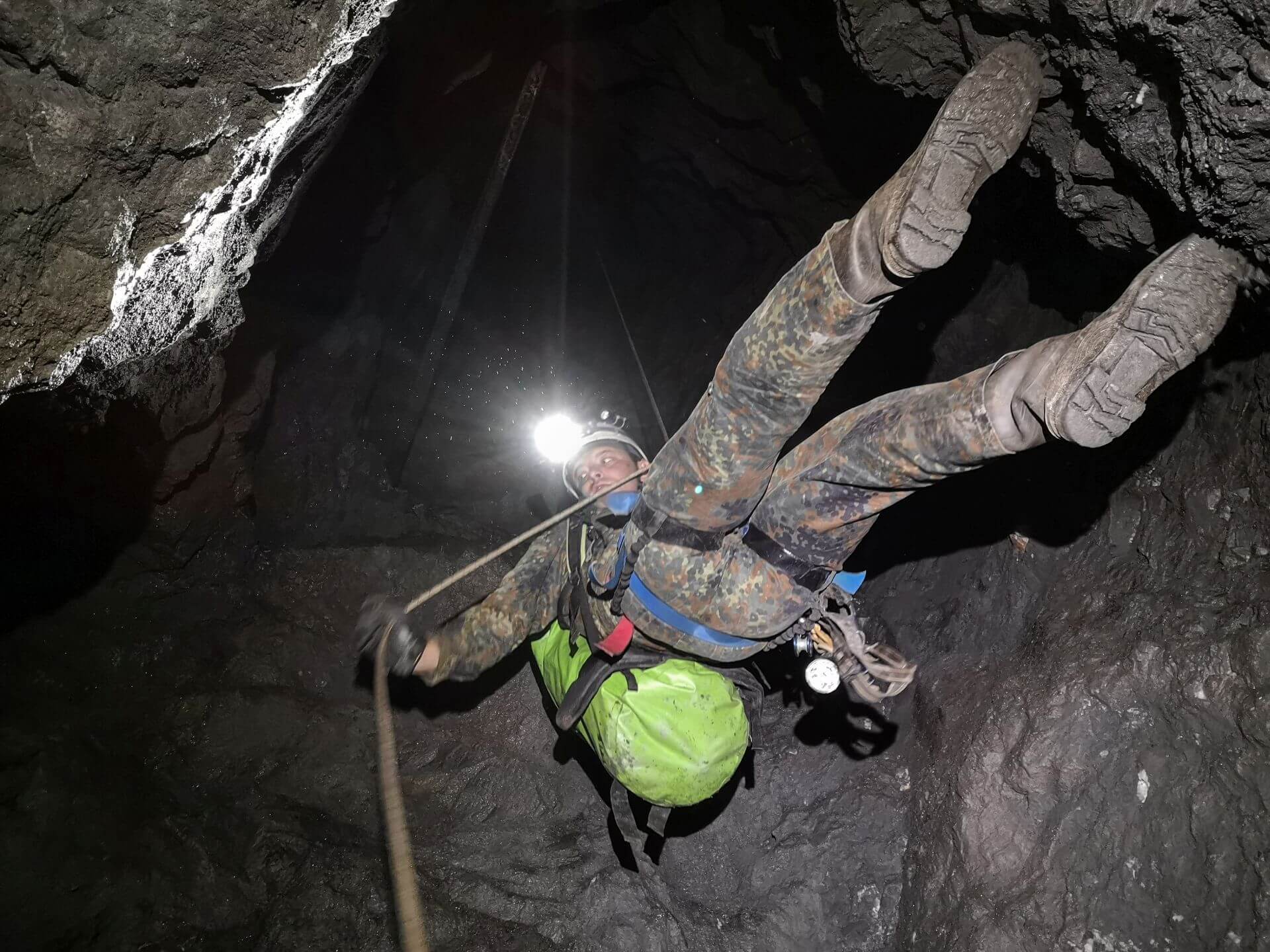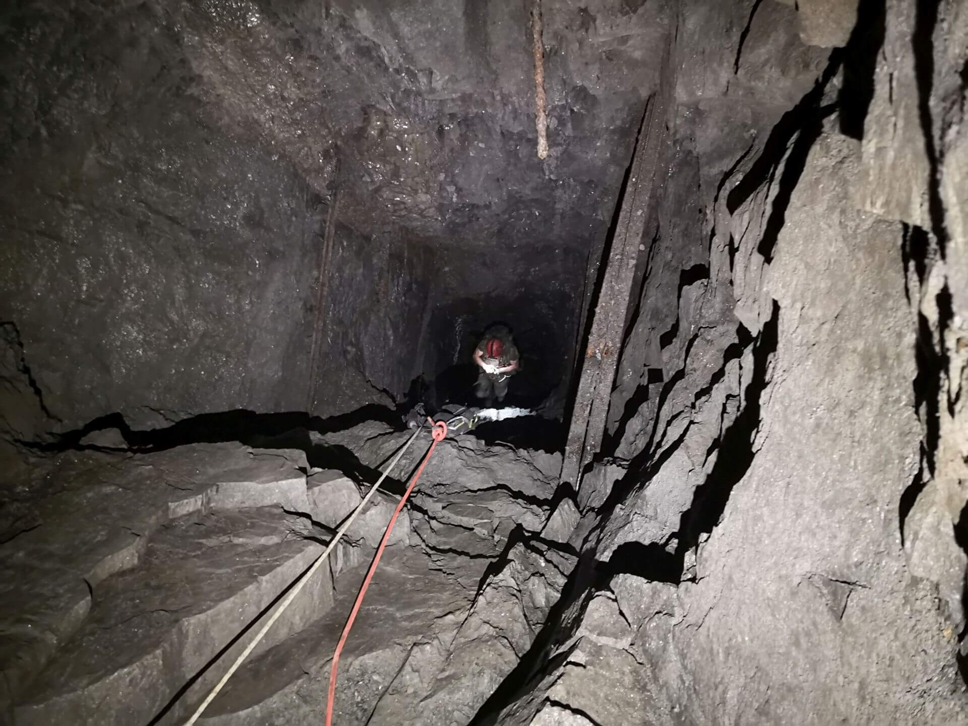 Nachdem wir die Halle erkundet hatten, kamen wir auf normalem Wege nicht weiter. Ein etwa 30 Meter tiefer Schacht erforderte den Einbau von Seiltechnik. Nur kurze Zeit später schlängelte sich das Statikseil durch unsere Abseilgeräte und ließ uns langsam in die Tiefe gleiten. Auf der unteren Sohle angekommen legten wir die Gurte ab, es galt viele Meter altbergbaulicher Strecken zu erkunden.