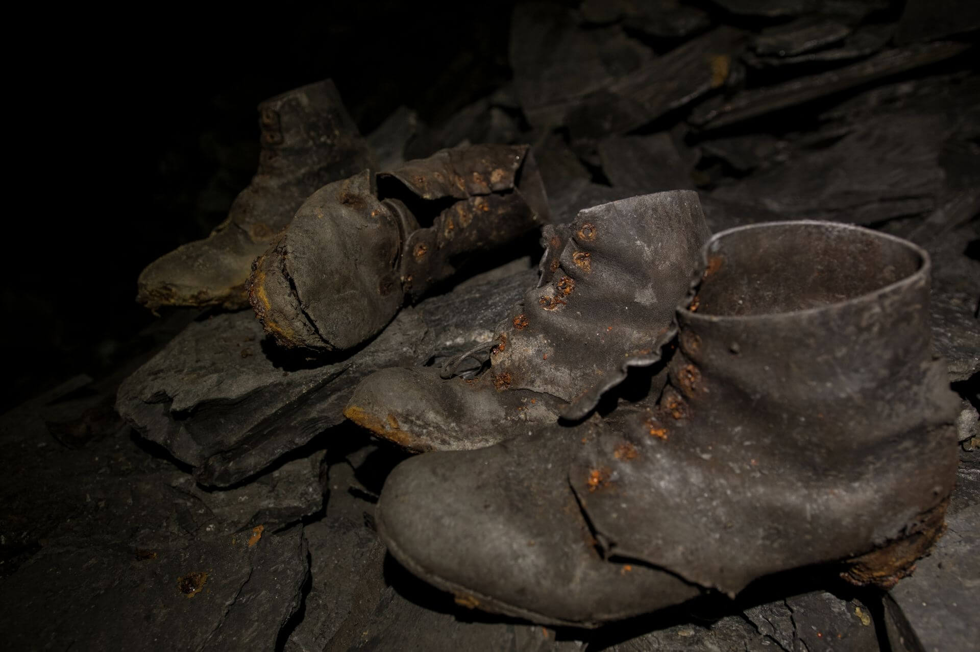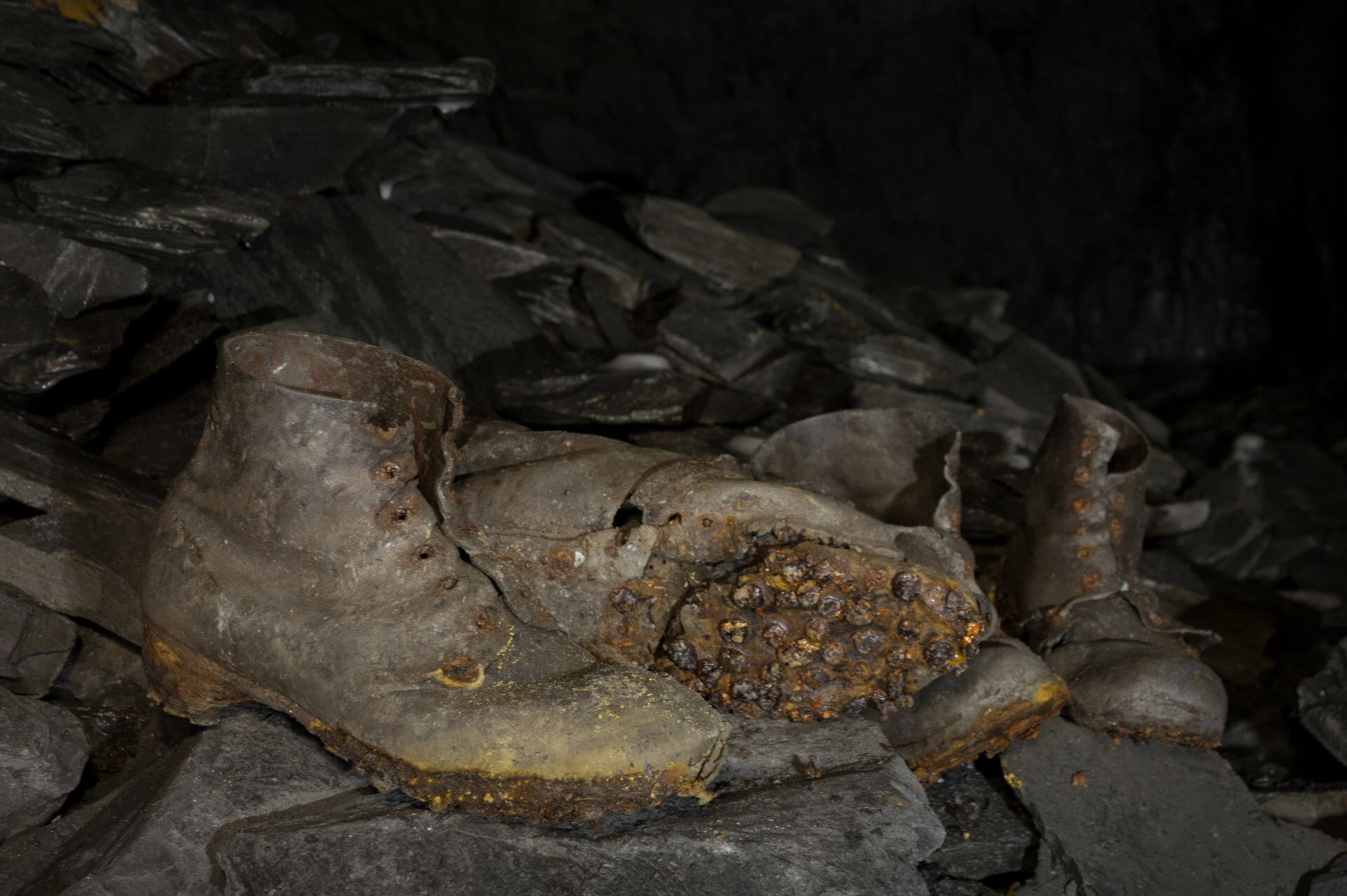 Wir entdeckten einen kleinen Raum. In diesen mündete eine Rutsche für Schieferplatten. Davor türmte sich ein Berg aus Schieferplatten und Versatzmaterial. Auf diesem Berg neben der Rutsche standen zwei Paar Schuhe. Es waren genagelte Lederschuhe, die hier vermutlich seit der Stilllegung stehen.