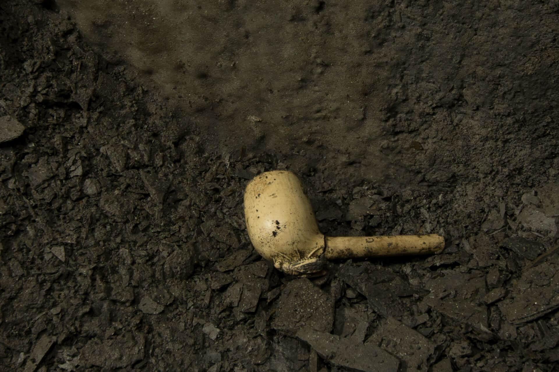 Wir ließen die Schuhe hinter uns und erkundeten weitere Bereiche der Schiefergrube. An einer anderen Stelle entdeckten wir eine Pfeife zum Rauchen von Tabak. Ein Teil war bereits abgebrochen, was vielleicht der Grund dafür war, dass diese zurückgelassen wurde. Für den Bergmann war sie nach dem Bruch nichts mehr Wert, aber für uns ist dies ein schönes Fundstück. Die Pfeife erscheint leicht beige und an der Unterseite des Pfeifenkopfs ist eine Fliege ausgearbeitet.