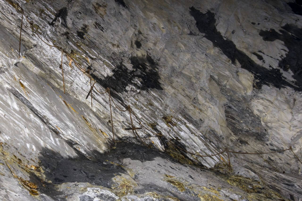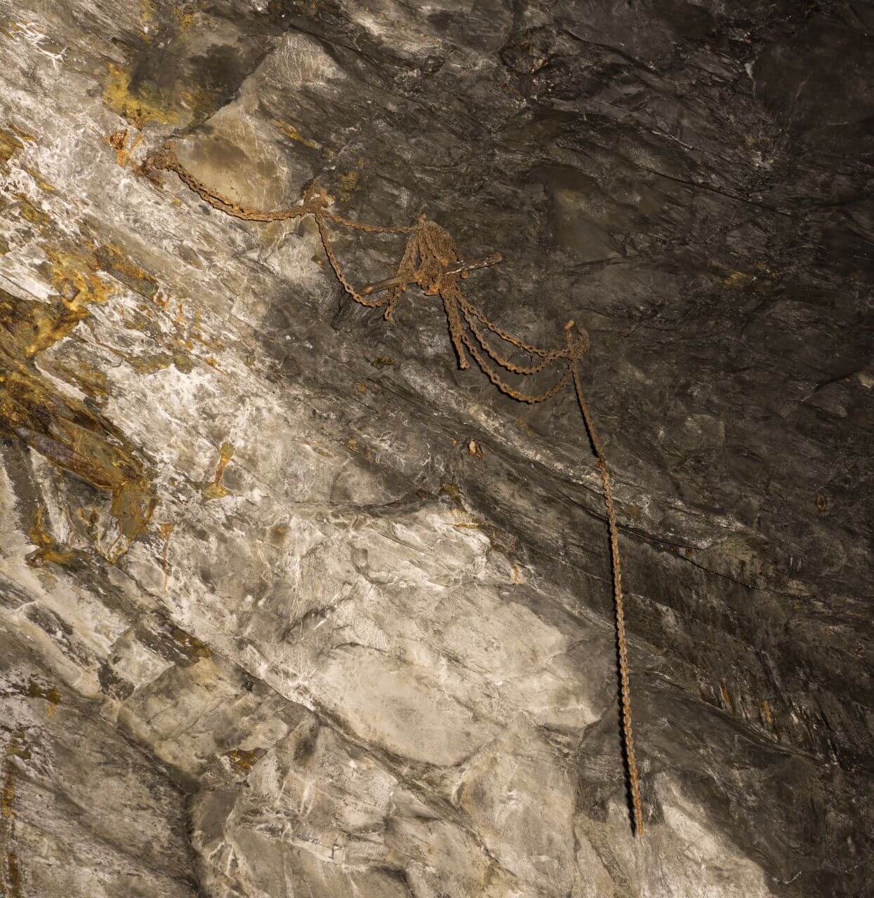 Die folgenden Bilder zeigen nur einen kleinen Abschnitt der Grube. Bisher fehlte einfach die Zeit, um alles zu erkunden. Und doch zeigen diese sehr interessante Einblicke in die einzelnen Abschnitte. Ab und zu konnte ich schon in anderen Gruben an den Stößen die alten Ketten der Bergmänner entdecken. Ketten an dessen Ende ein Sitzholz befestigt war. Auf diesen saßen die Bergmänner und schlugen die Schieferplatten von den Stößen. In dieser Grube fanden sich allerdings einige dieser Ketten. Die meisten hingen noch an Ort und Stelle. Wieder andere lagen steif und verrostet am Boden.