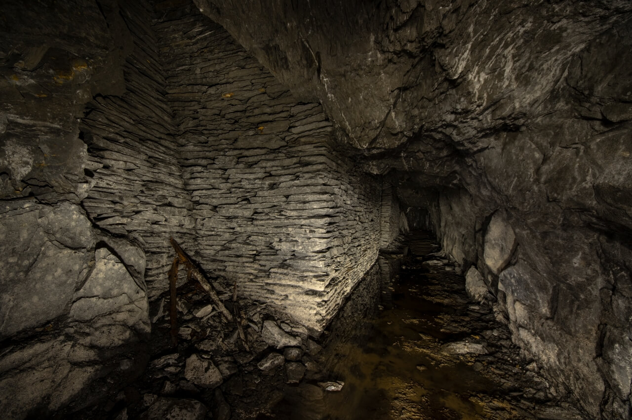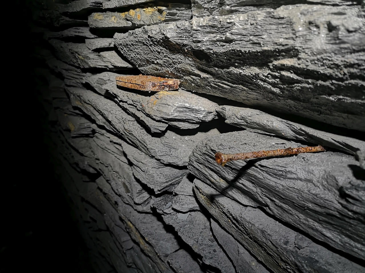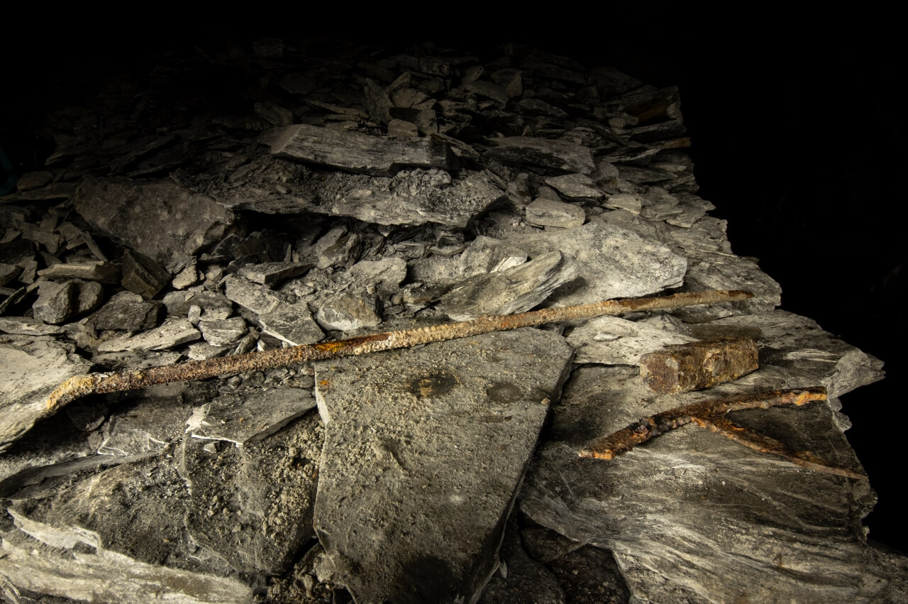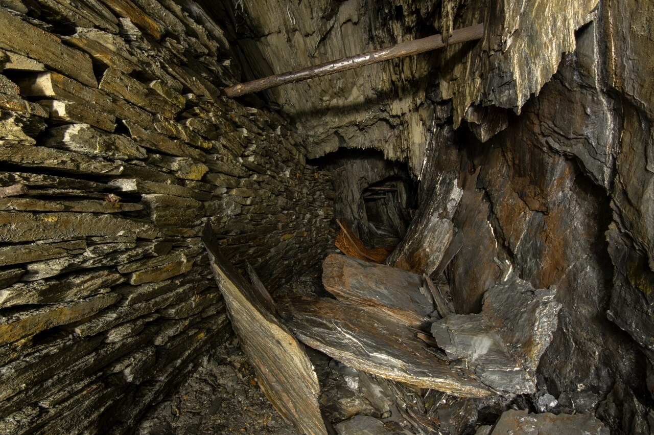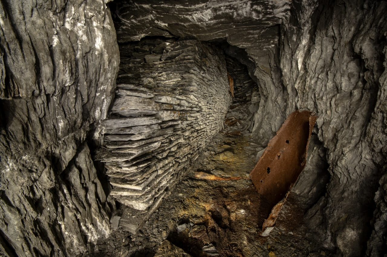 Da wir nicht wussten was uns erwartete, richteten wir eine Seilwache ein, welche den Anschlagpunkt nicht aus den Augen lassen sollte. Der enge Schacht mündete direkt in einem schalen Schrägschacht, welcher wiederum in einem Abbau endete. Von diesem war es nur ein Katzensprung auf die Hauptförderstrecke der Grube. Wir betraten die Förderstrecke und schauten erst einmal nach links und rechts. So als würden wir eine stark befahrende Straße überqueren. Wunderbare Trockenmauerungen zeigten sich im Lichtkegel unserer Lampen. Die dunklen Schiefermauern waren mit weißen Ausblühungen überdeckt. Jene erzeugten einen natürlichen Farbverlauf. Im oberen drittel anthrazitfarbend und nach unten hin immer mehr ins weiß verlaufend. Die dunkle Firste war von weißen Quarzadern durchzogen und mit Sinter bedeckt. Der satte Kontrast wirkte durch das Schattenspiel unserer Lampen noch intensiver.