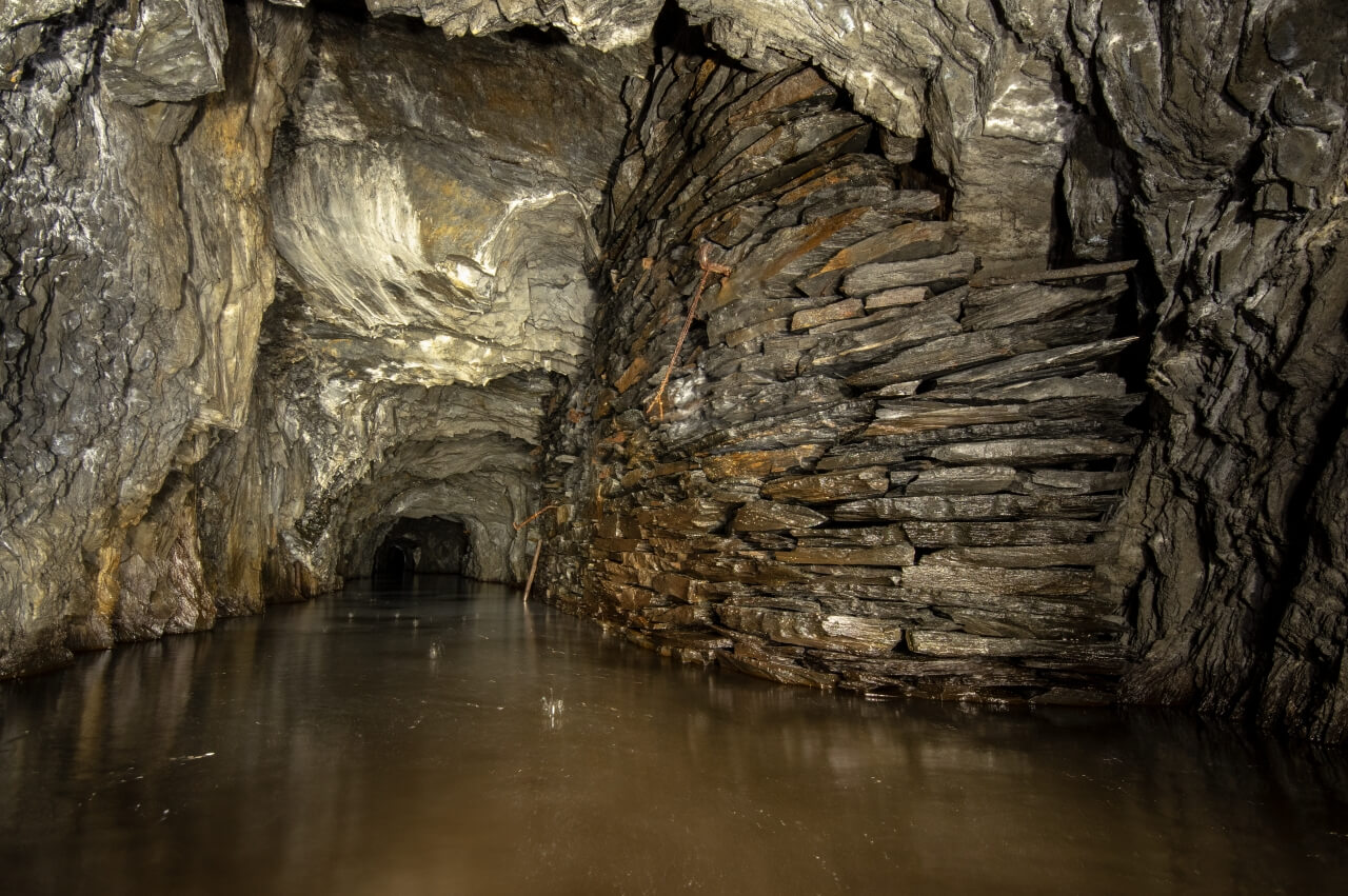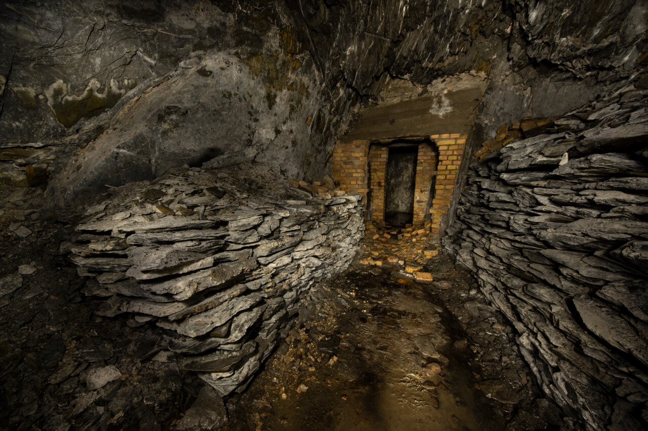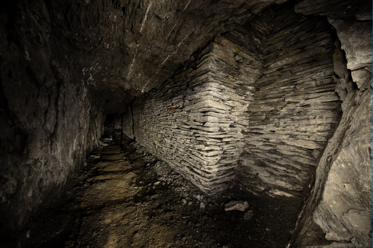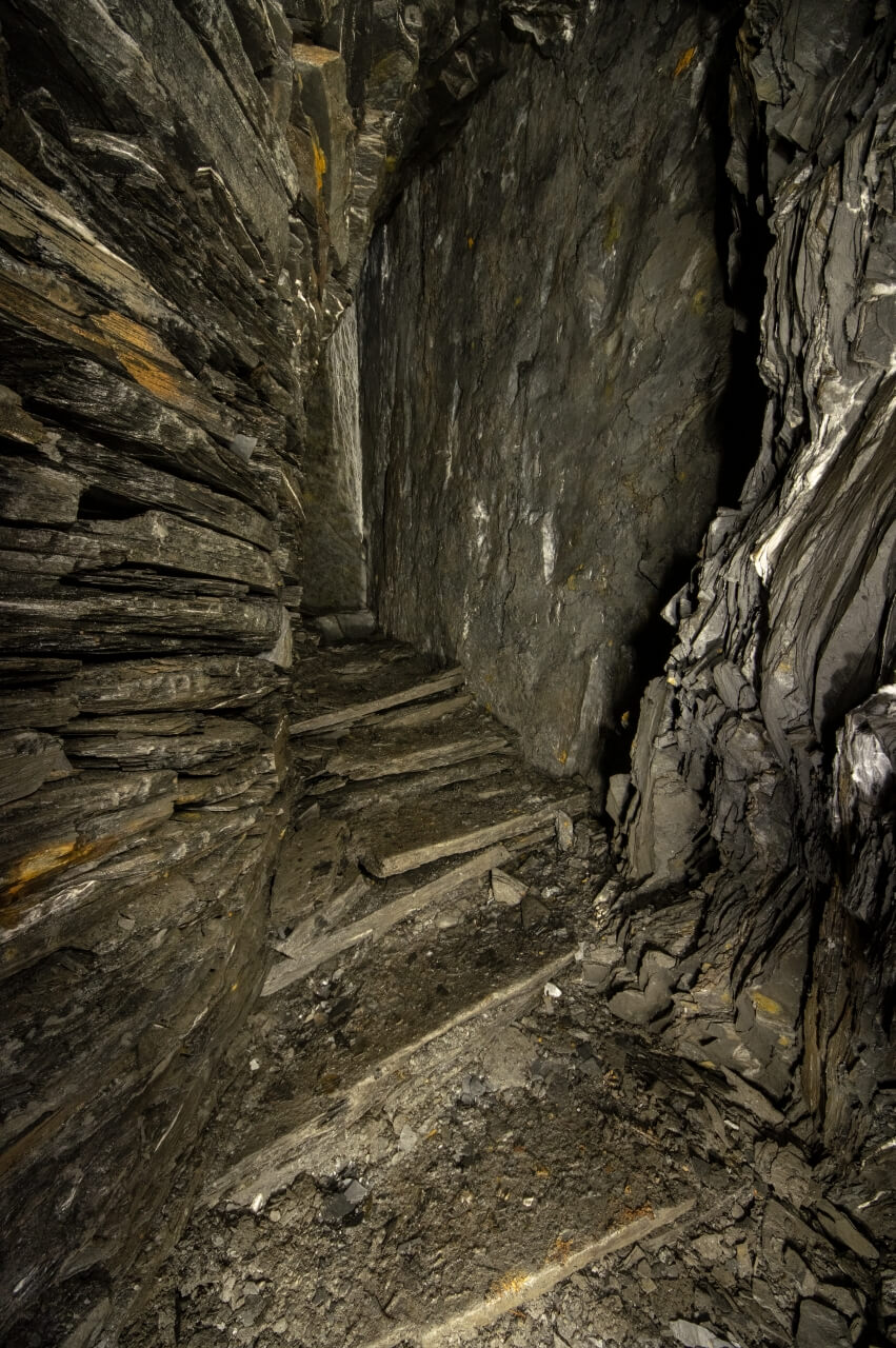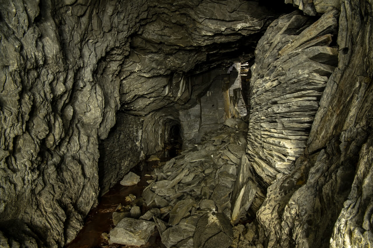 Da wir nicht wussten was uns erwartete, richteten wir eine Seilwache ein, welche den Anschlagpunkt nicht aus den Augen lassen sollte. Der enge Schacht mündete direkt in einem schalen Schrägschacht, welcher wiederum in einem Abbau endete. Von diesem war es nur ein Katzensprung auf die Hauptförderstrecke der Grube. Wir betraten die Förderstrecke und schauten erst einmal nach links und rechts. So als würden wir eine stark befahrende Straße überqueren. Wunderbare Trockenmauerungen zeigten sich im Lichtkegel unserer Lampen. Die dunklen Schiefermauern waren mit weißen Ausblühungen überdeckt. Jene erzeugten einen natürlichen Farbverlauf. Im oberen drittel anthrazitfarbend und nach unten hin immer mehr ins weiß verlaufend. Die dunkle Firste war von weißen Quarzadern durchzogen und mit Sinter bedeckt. Der satte Kontrast wirkte durch das Schattenspiel unserer Lampen noch intensiver.