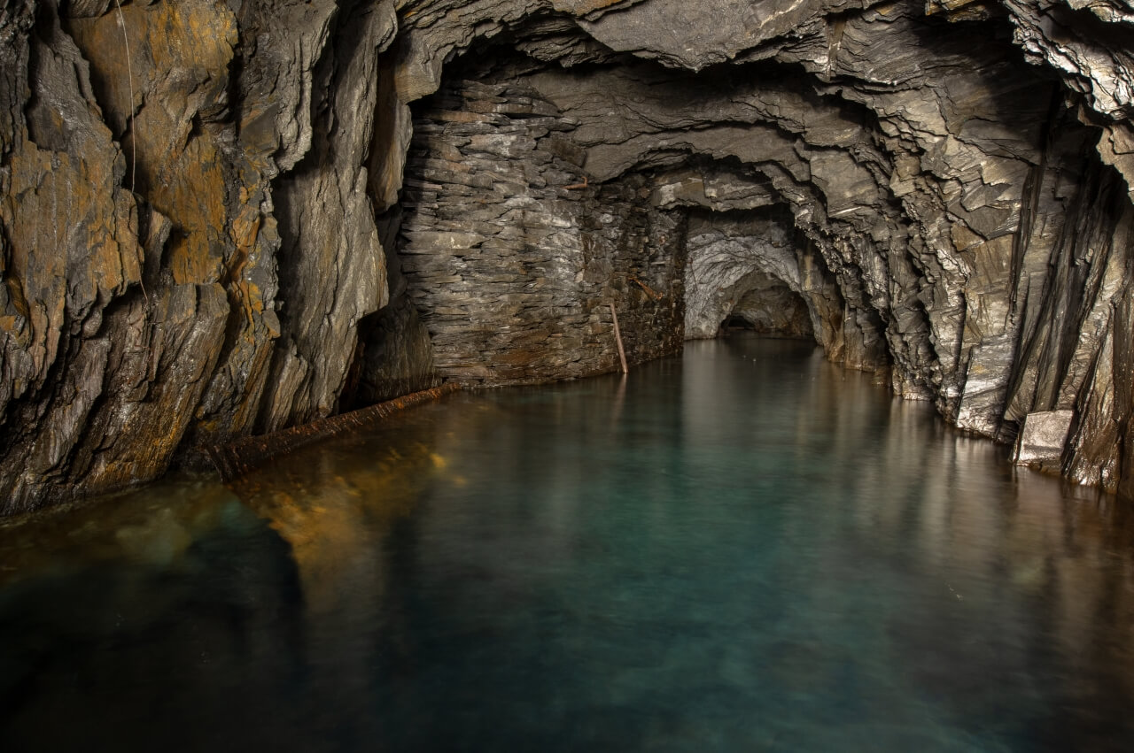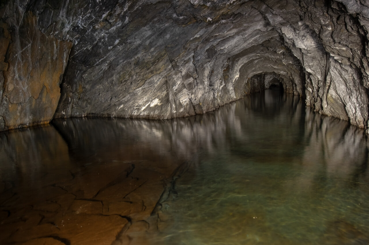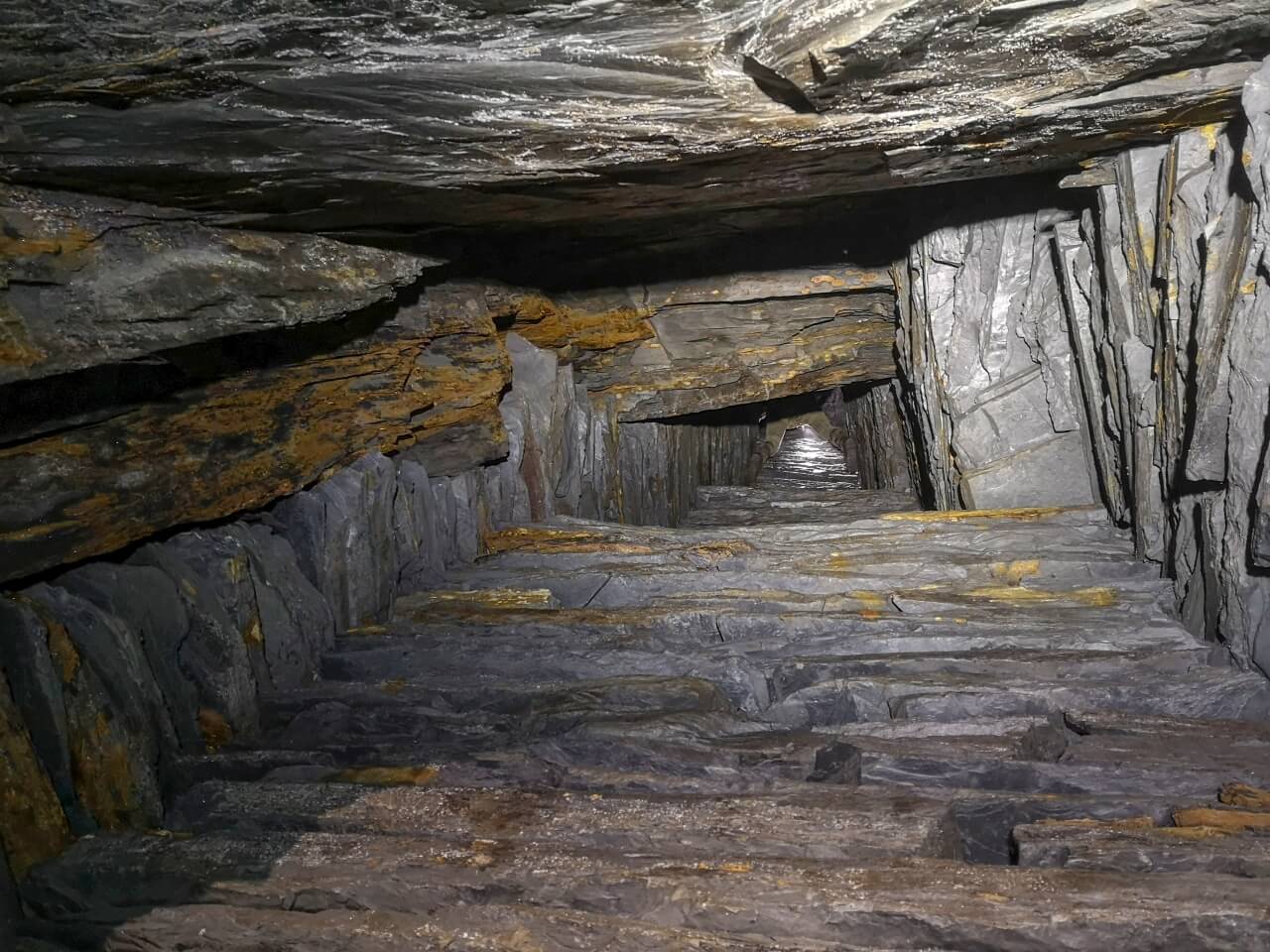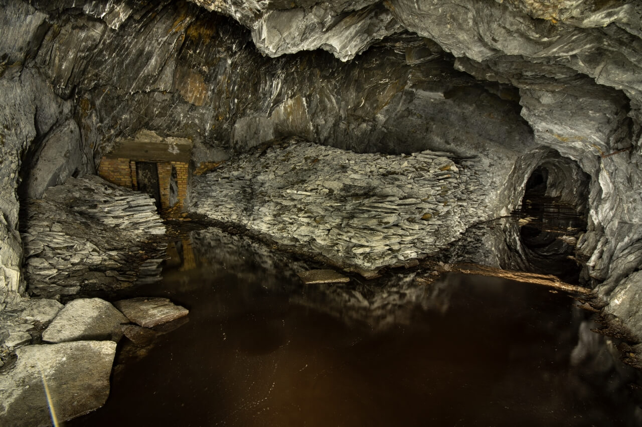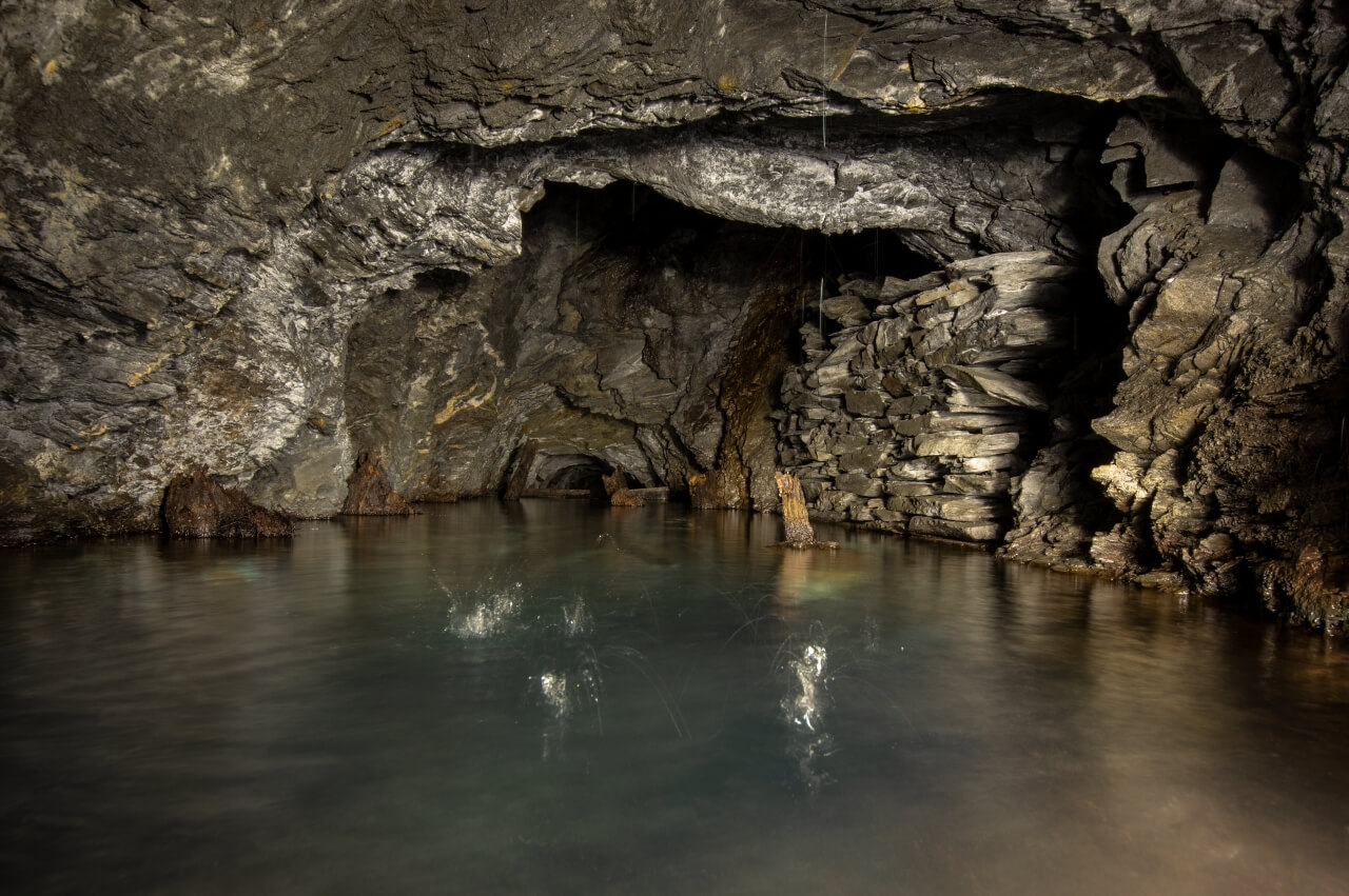 Da wir nicht wussten was uns erwartete, richteten wir eine Seilwache ein, welche den Anschlagpunkt nicht aus den Augen lassen sollte. Der enge Schacht mündete direkt in einem schalen Schrägschacht, welcher wiederum in einem Abbau endete. Von diesem war es nur ein Katzensprung auf die Hauptförderstrecke der Grube. Wir betraten die Förderstrecke und schauten erst einmal nach links und rechts. So als würden wir eine stark befahrende Straße überqueren. Wunderbare Trockenmauerungen zeigten sich im Lichtkegel unserer Lampen. Die dunklen Schiefermauern waren mit weißen Ausblühungen überdeckt. Jene erzeugten einen natürlichen Farbverlauf. Im oberen drittel anthrazitfarbend und nach unten hin immer mehr ins weiß verlaufend. Die dunkle Firste war von weißen Quarzadern durchzogen und mit Sinter bedeckt. Der satte Kontrast wirkte durch das Schattenspiel unserer Lampen noch intensiver.
