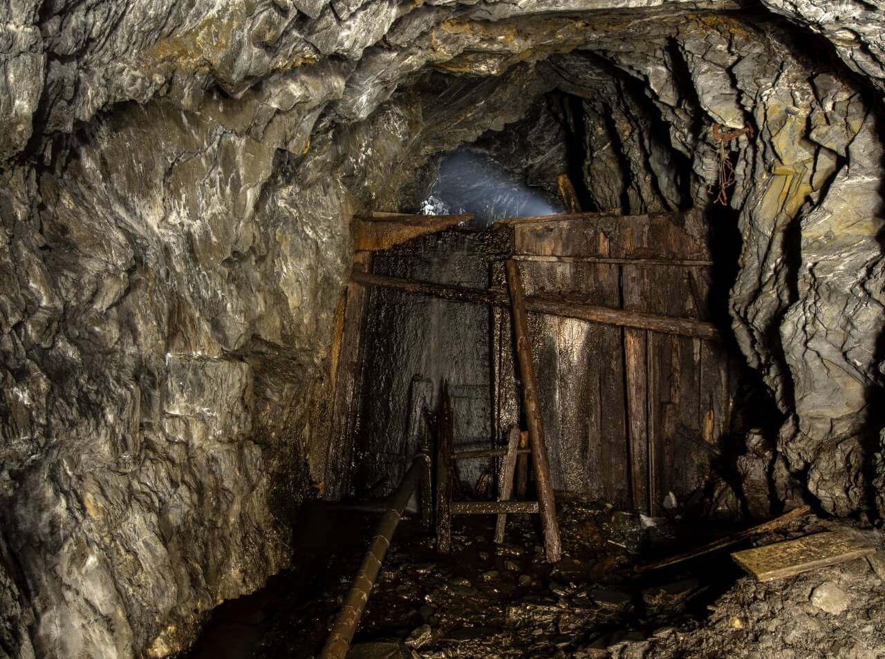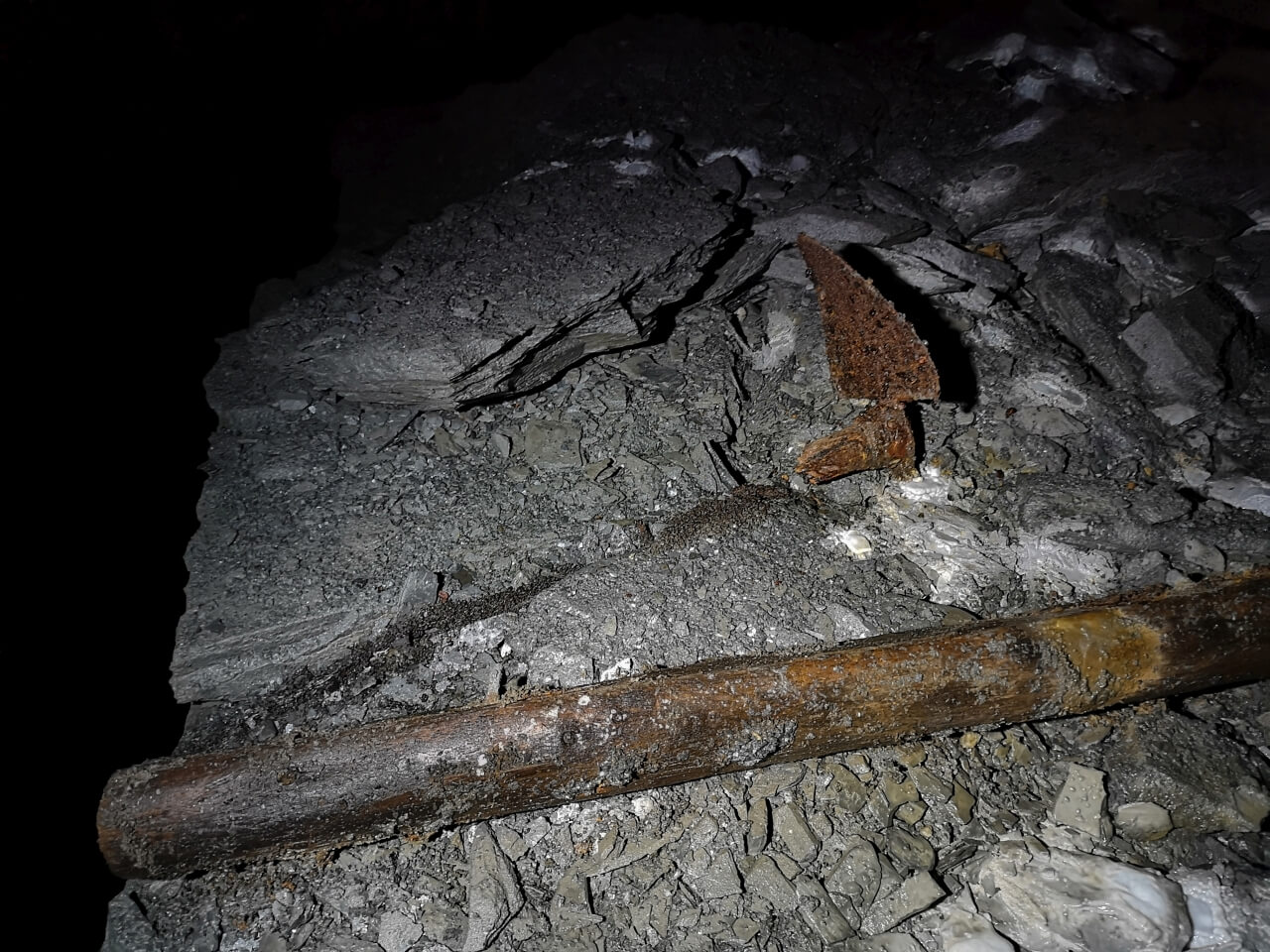 Eindringendes Wasser floss unaufhaltsam in Richtung Mundloch. Anfangs hatte das Wasser eine bräunliche Farbe, wurde aber immer klarer, desto höher es stand. Je weiter wir Richtung Bergrücken liefen, umso mehr stieg der Pegel. Irgendwann konnten wir eine eingezogene Staumauer erkennen. Links und rechts ragten vermoderte Türstockreste aus dem Wasser. Die Kappen müssen schon vor langer Zeit unter ihrem eigenen Gewicht zusammengebrochen sein und vermoderten nun am Grund. Das Wasser stank erbärmlich und stand bis kurz vor der Kante unserer Wathosen.