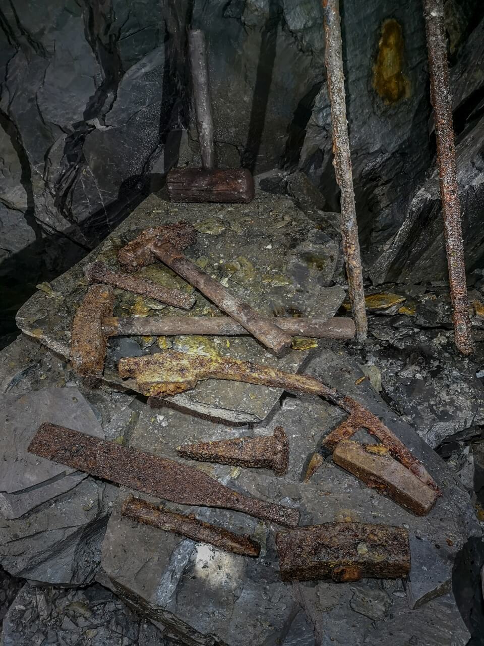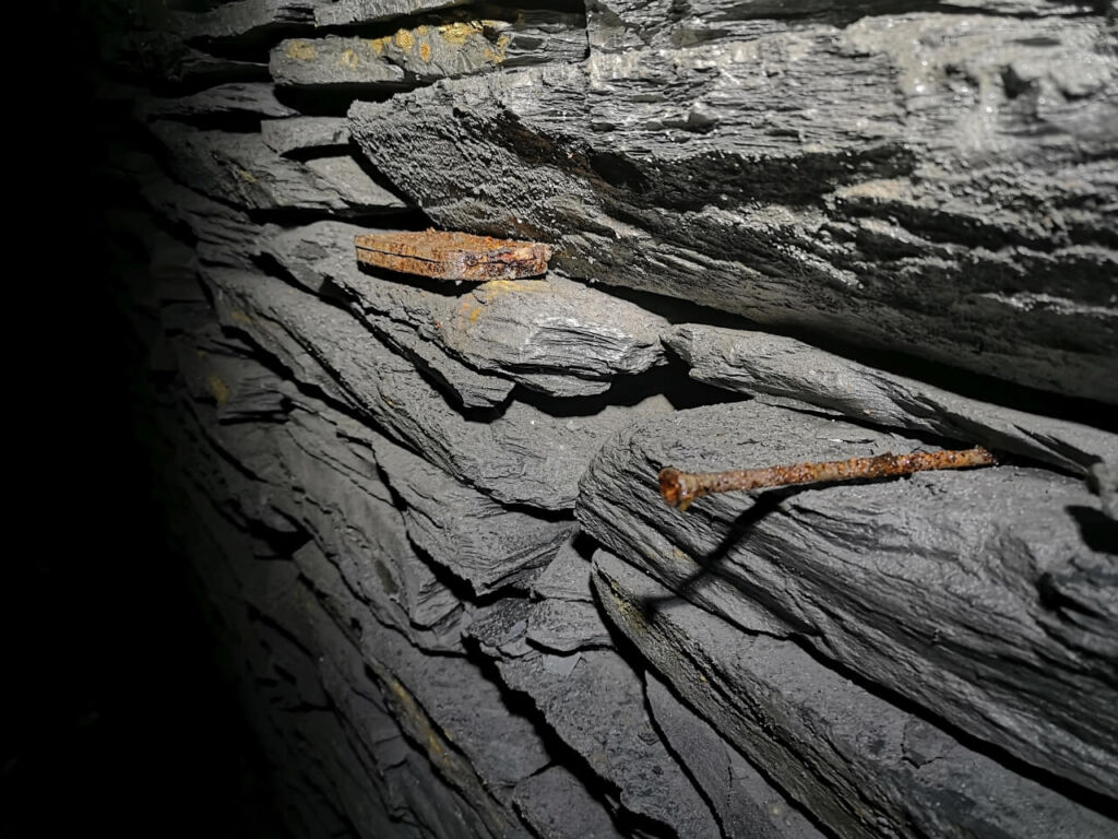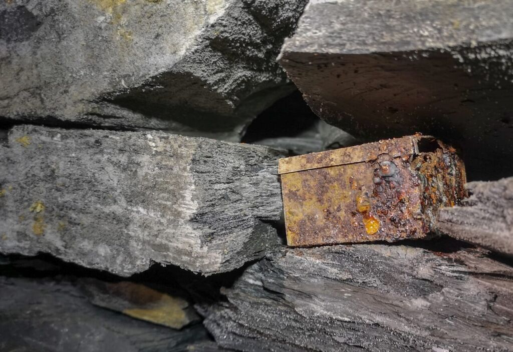 In den Trockenmauerungen fanden wir immer wieder kleine zurückgelassene Utensilien wie eine Tabakdose, einen Mini-Verbandskasten, Schlägel, Eisen und weitere Werkzeuge. Scheinbar legten die Bergmänner ihre persönlichen Dinge in den Spalten der Trockenmauerung ab und vergasen diese dort. Vielleicht ließen sie manche Sachen mit Absicht zurück. Kleine blecherne Zeitkapseln für die Nachwelt.