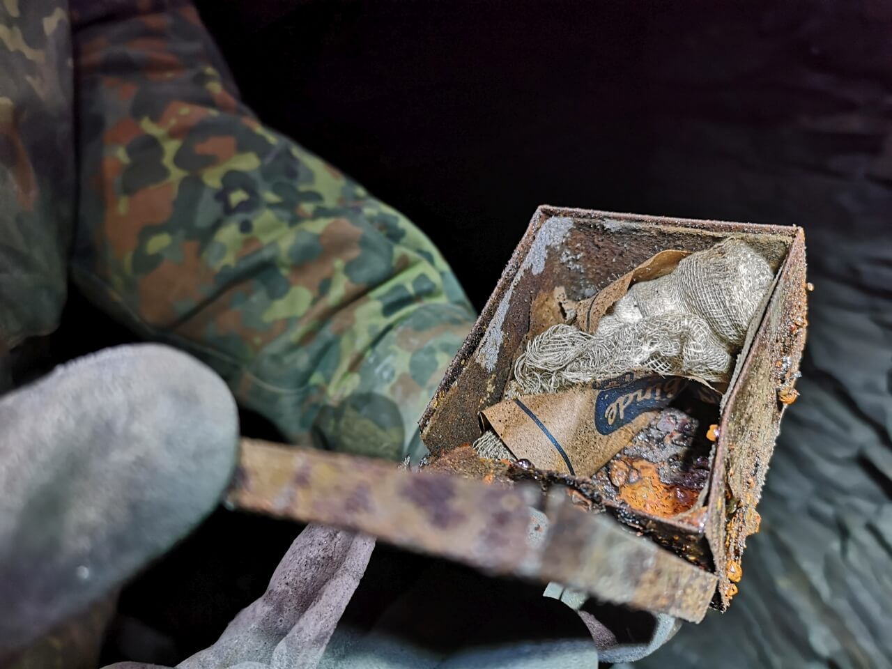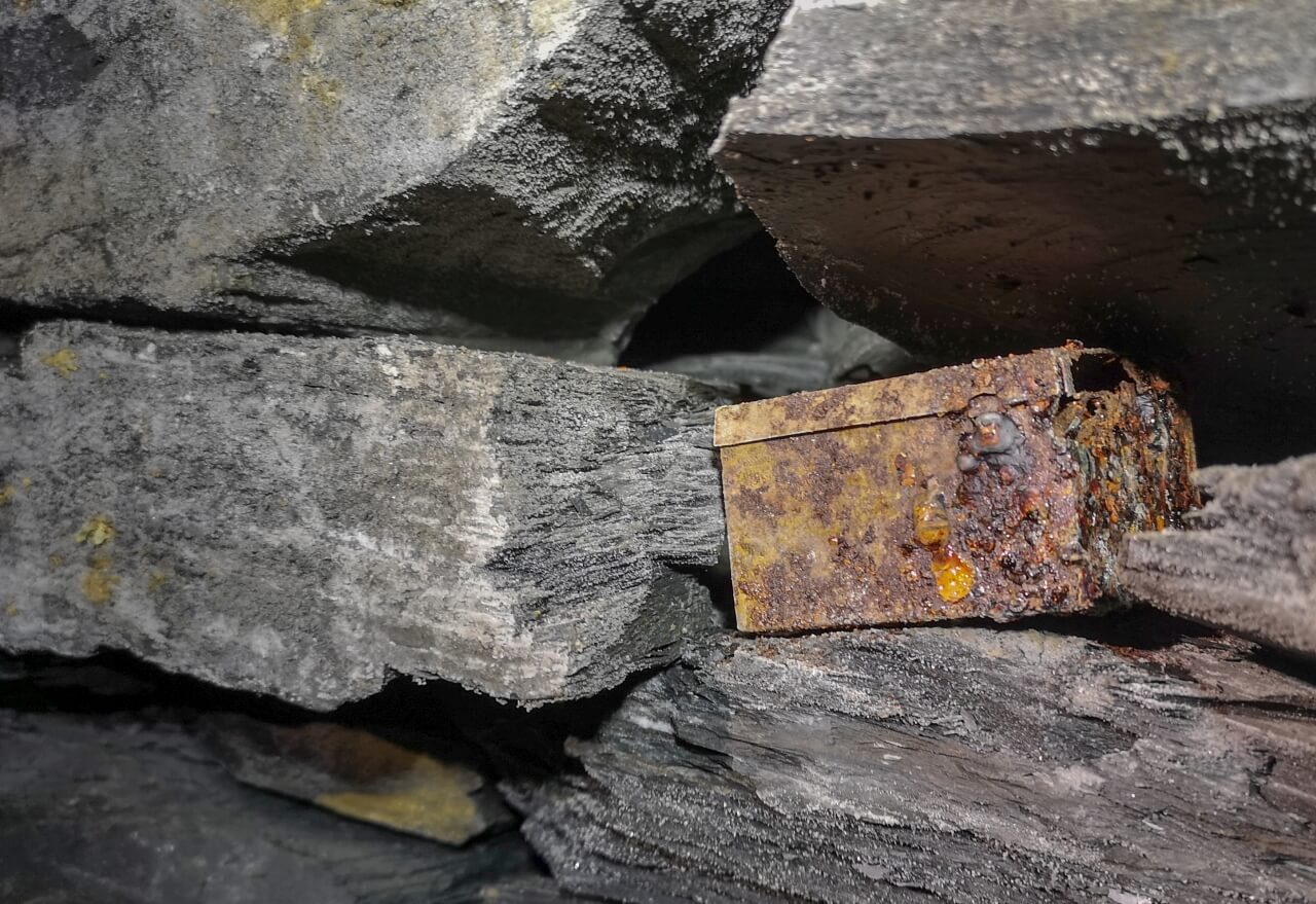 In den Trockenmauerungen fanden wir immer wieder kleine zurückgelassene Utensilien wie eine Tabakdose, einen Mini-Verbandskasten, Schlägel, Eisen und weitere Werkzeuge. Scheinbar legten die Bergmänner ihre persönlichen Dinge in den Spalten der Trockenmauerung ab und vergaßen diese dort. Vielleicht ließen sie manche Sachen mit Absicht zurück. Kleine blecherne Zeitkapseln für die Nachwelt.
