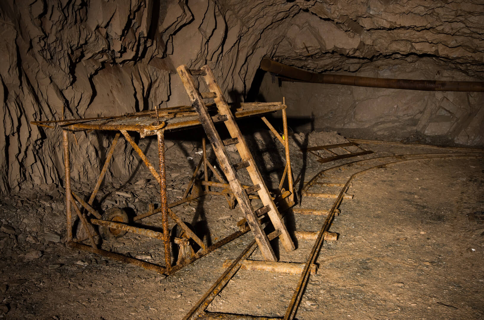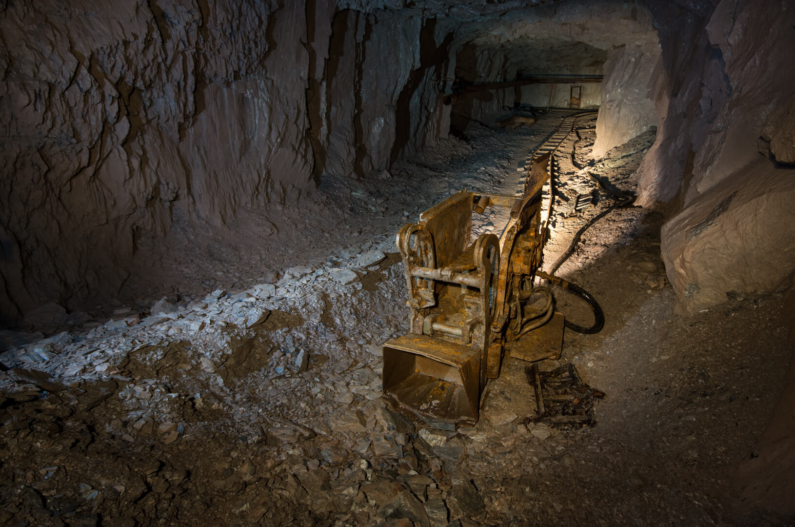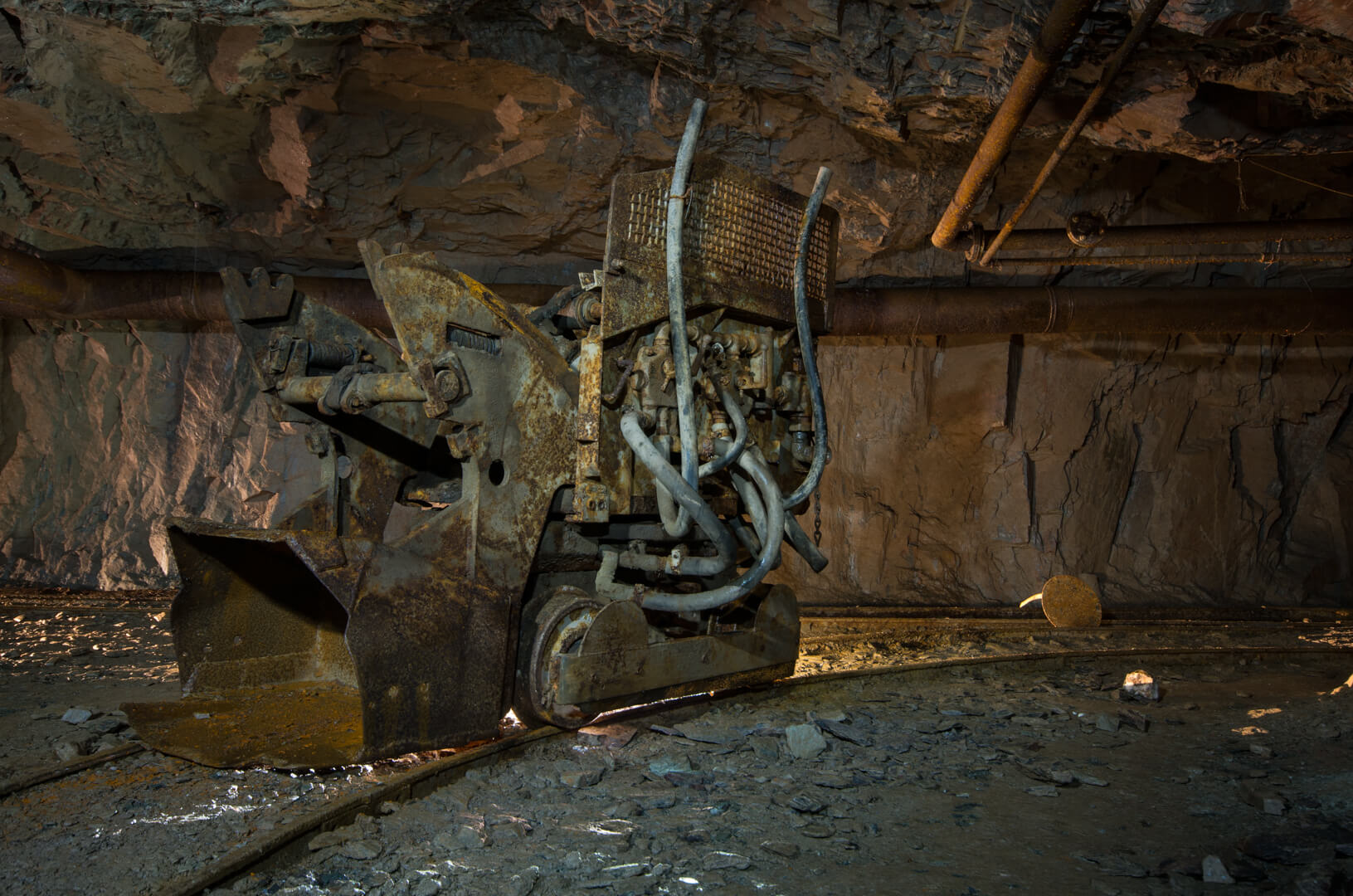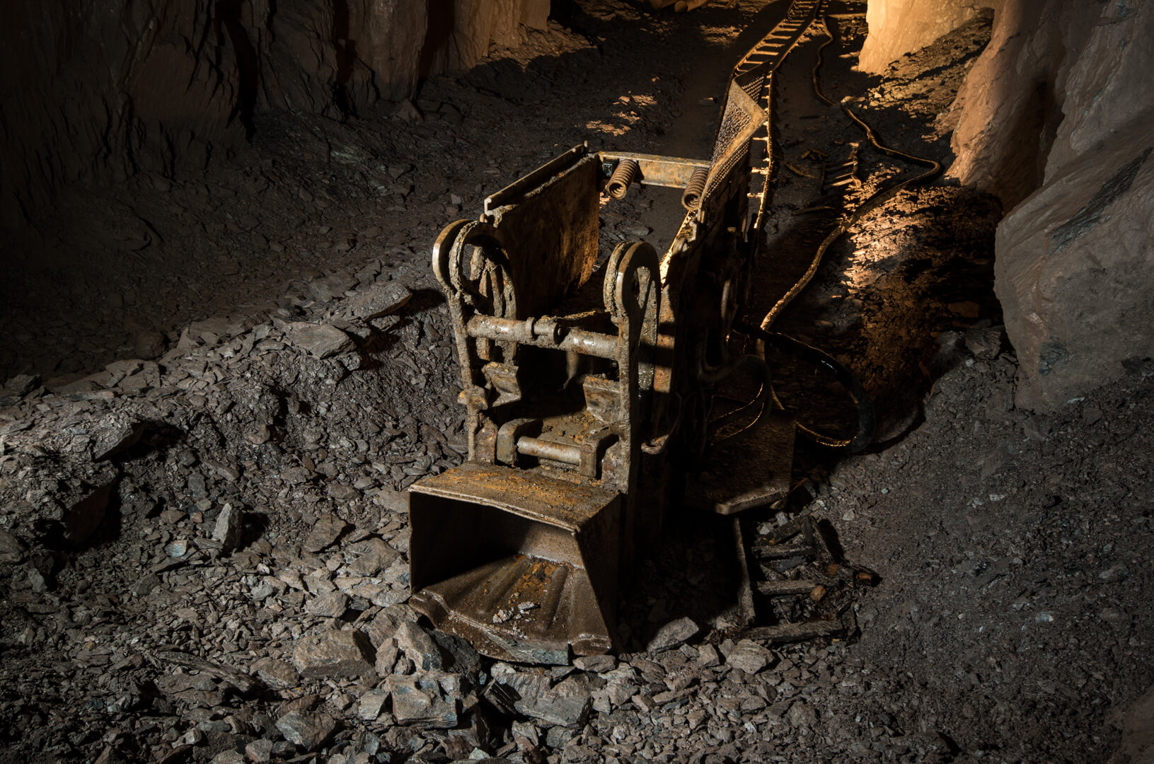 Mit zurückgelassener Abbautechnik wie Überkopfladern, Rollbühnen und Bewetterungsanlagen lässt sich der damalige Grubenbetrieb noch gut nachvollziehen. Ein Überkopflader steht am Ende einer Strecke, direkt vor einem abgesprengten Gesteinsberg, bereit zum Verladen. Man könnte fast meinen, die Bergleute hätten gerade Pause gemacht und jeden Moment würde ein neuer Förderwagen zum Beladen eintreffen.