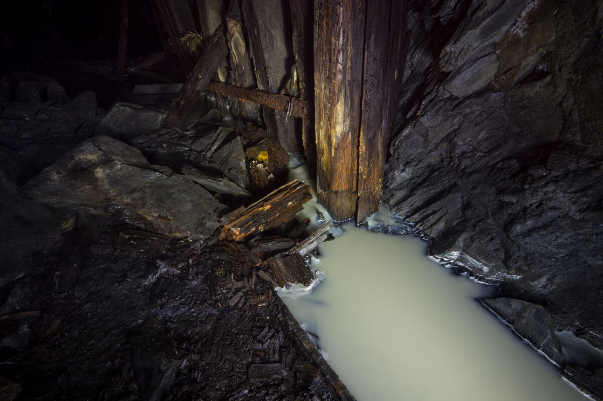 Hier noch der Bremsberg zur vierten Sohle. Ja, man muss schon zweimal hinsehen, aber es ist ein Bremsberg und kein Organ, oder gar eine Raucherlunge. Dieser in Gelb und Schwarz getauchte Bremsberg machte einen nahezu lebendigen Eindruck. Besonders interessant war eine alte hölzerne Treppe. Leider war die vierte Sohle abgesoffen und konnte nicht mehr befahren werden.