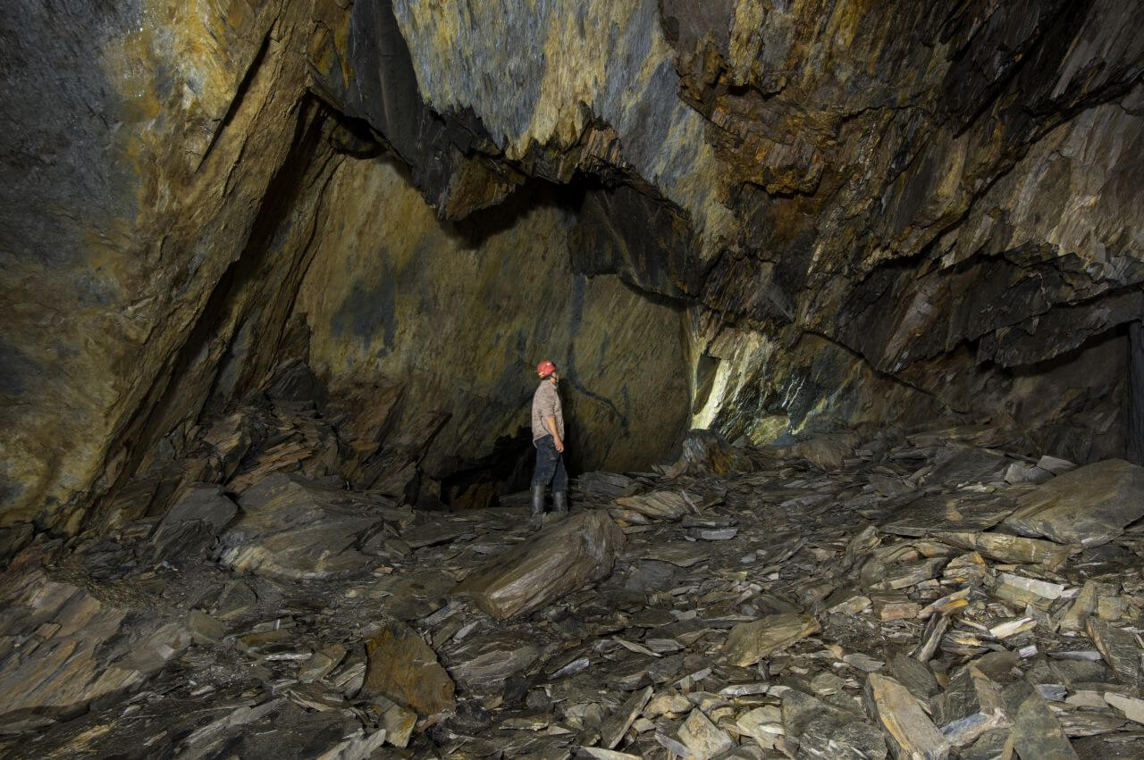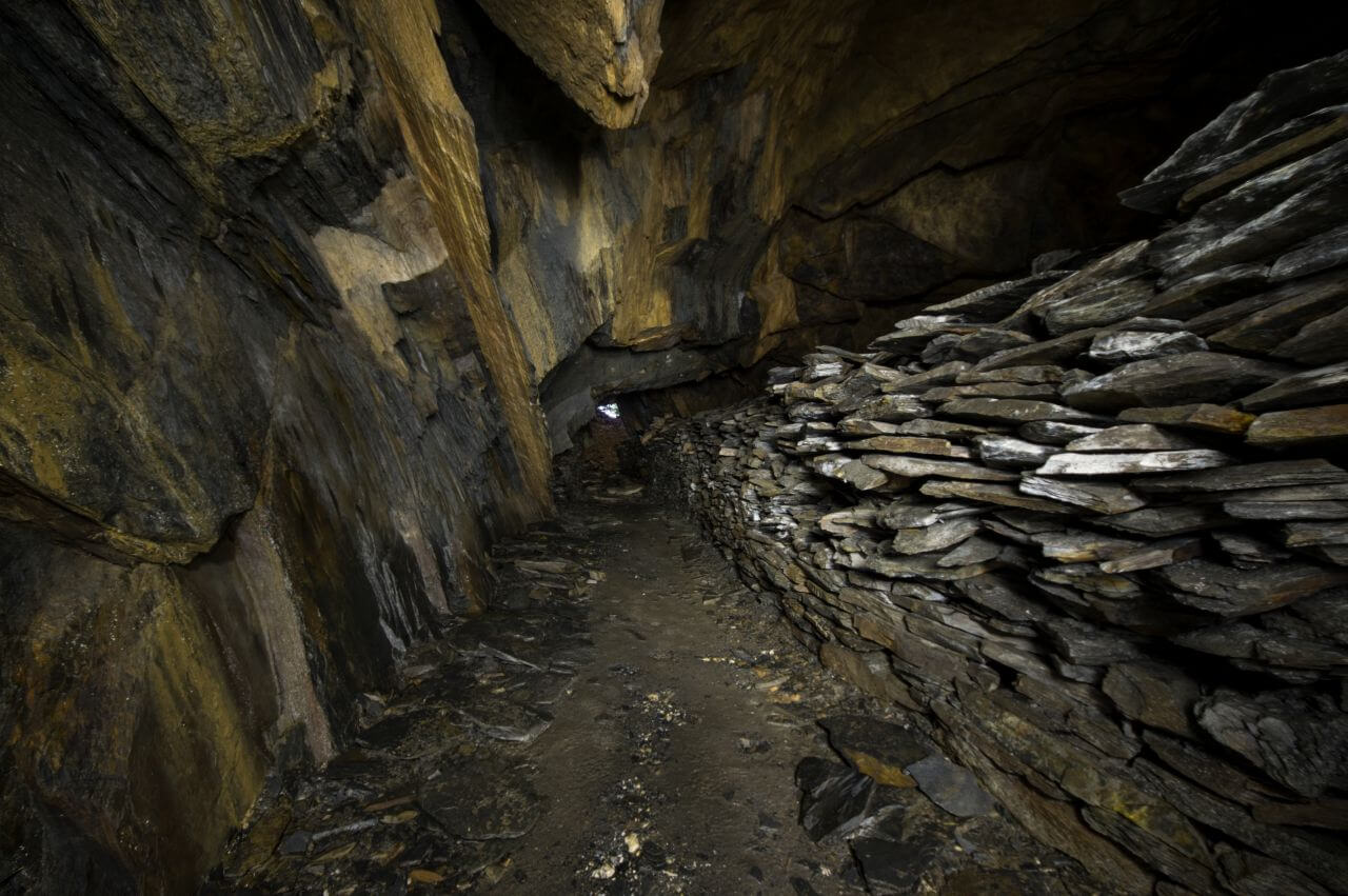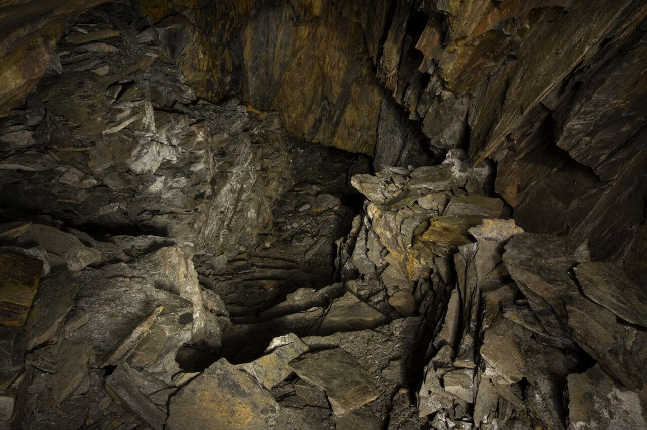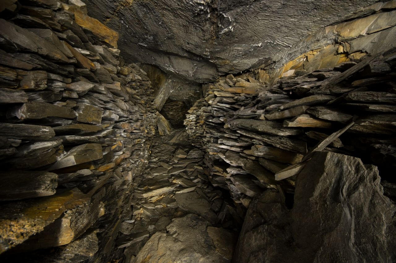 Im Hang und unmittelbar an der Halde angrenzend, fanden wir schnell das ehemalige Mundloch. Es war nur noch ein kleiner Durchschlupf erhalten. Der enge Zugang bündelte den Wetterzug und die kühle Grubenluft strömte uns entgegen. Unmittelbar hinter dem Mundloch standen wir bereits in der ersten Abbaukammer. Durch die Kammer zog sich eine lange Versatzmauer, hinter der das unbrauchbare Material versetzt war. Die Stollen zeigten sich von ihrer schönsten Seite. Handgeschrämmt und standfest hielten sie den Weg durch die Grube frei. Kleine, schmale Gassen und Treppen verbanden die Abbaukammern. Links und rechts türmten sich die Versatzmauern auf. Gestapelt wie Berge von Zeitschriften und Büchern. Einige neigten sich bereits bedrohlich nach vorne und verengten die schmalen Wege noch zusätzlich. Es machte schon einen leicht unaufgeräumten Eindruck. Mein erster Eindruck erinnerte mich an eine Messiewohnung, in der über lange Zeit Papier gestapelt wurde. Jeder Zentimeter sollte zum Ablegen der unbrauchbaren Schieferplatten genutzt werden.
