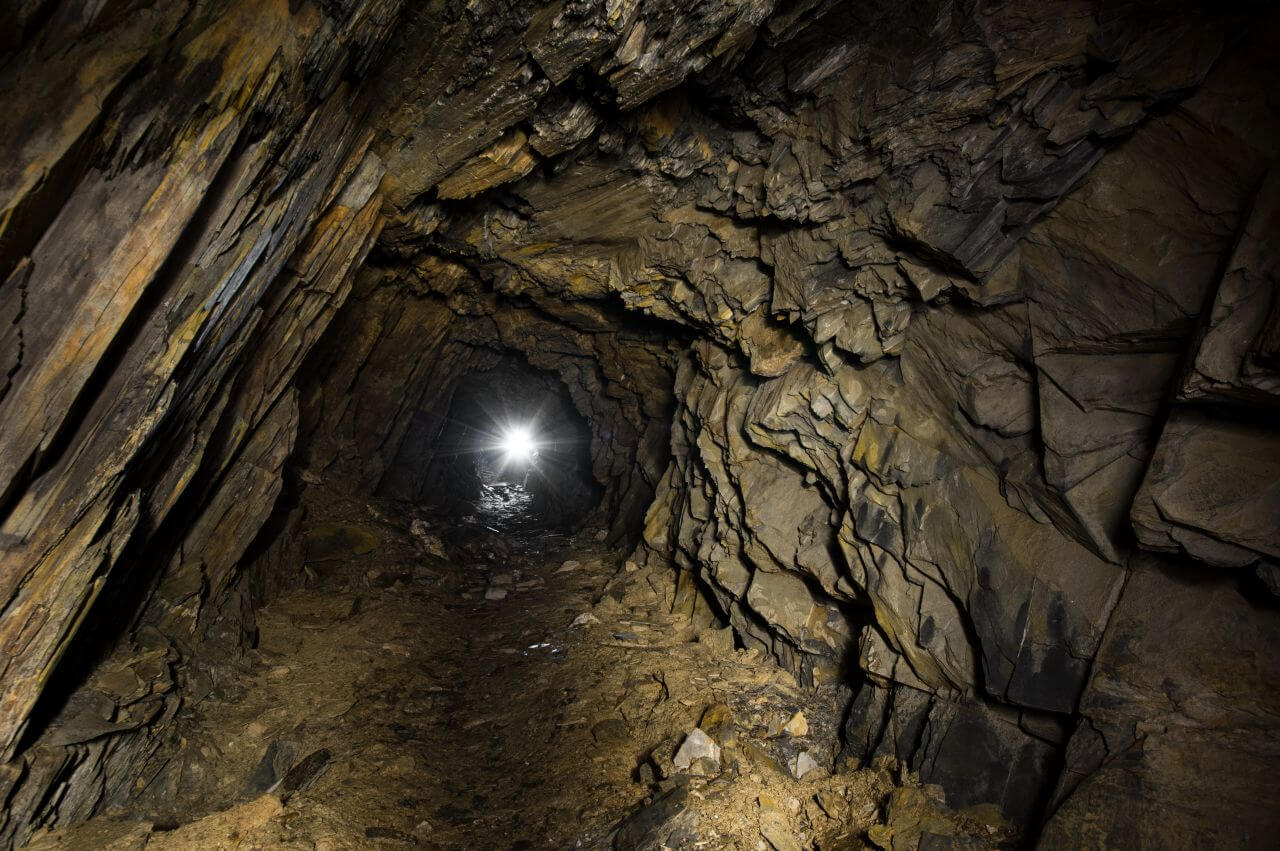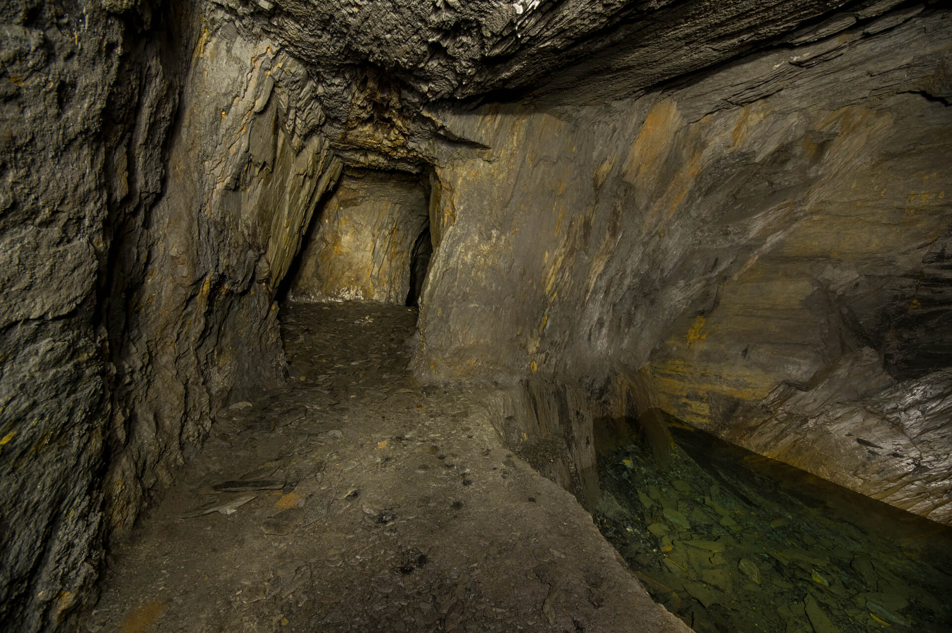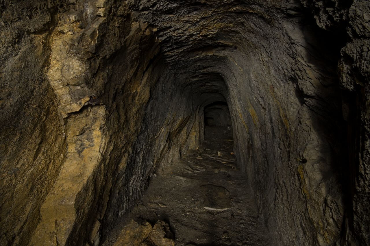 Im Hang und unmittelbar an der Halde angrenzend, fanden wir schnell das ehemalige Mundloch. Es war nur noch ein kleiner Durchschlupf erhalten. Der enge Zugang bündelte den Wetterzug und die kühle Grubenluft strömte uns entgegen. Unmittelbar hinter dem Mundloch standen wir bereits in der ersten Abbaukammer. Durch die Kammer zog sich eine lange Versatzmauer, hinter der das unbrauchbare Material versetzt war. Die Stollen zeigten sich von ihrer schönsten Seite. Handgeschrämmt und standfest hielten sie den Weg durch die Grube frei. Kleine, schmale Gassen und Treppen verbanden die Abbaukammern. Links und rechts türmten sich die Versatzmauern auf. Gestapelt wie Berge von Zeitschriften und Büchern. Einige neigten sich bereits bedrohlich nach vorne und verengten die schmalen Wege noch zusätzlich. Es machte schon einen leicht unaufgeräumten Eindruck. Mein erster Eindruck erinnerte mich an eine Messiewohnung, in der über lange Zeit Papier gestapelt wurde. Jeder Zentimeter sollte zum Ablegen der unbrauchbaren Schieferplatten genutzt werden.