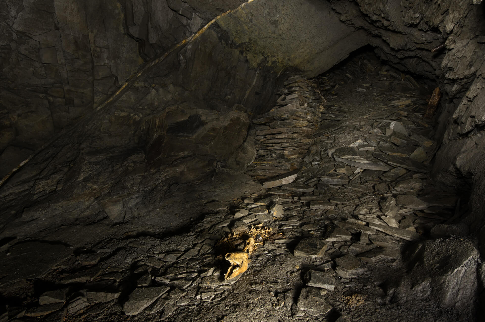 In der letzten Abbaukammer fanden sich einige Knochen und Schädel von jungen Wildschweinen. Wie diese dort hingekommen sind, lässt sich leider nicht sagen. Doch gaben sie dem sonst so grauen Schieferstollen etwas Farbe und machten ihn irgendwie lebendiger.