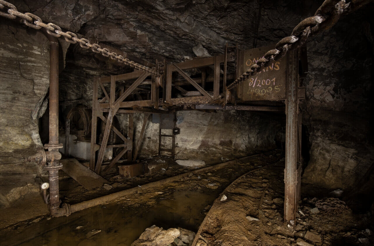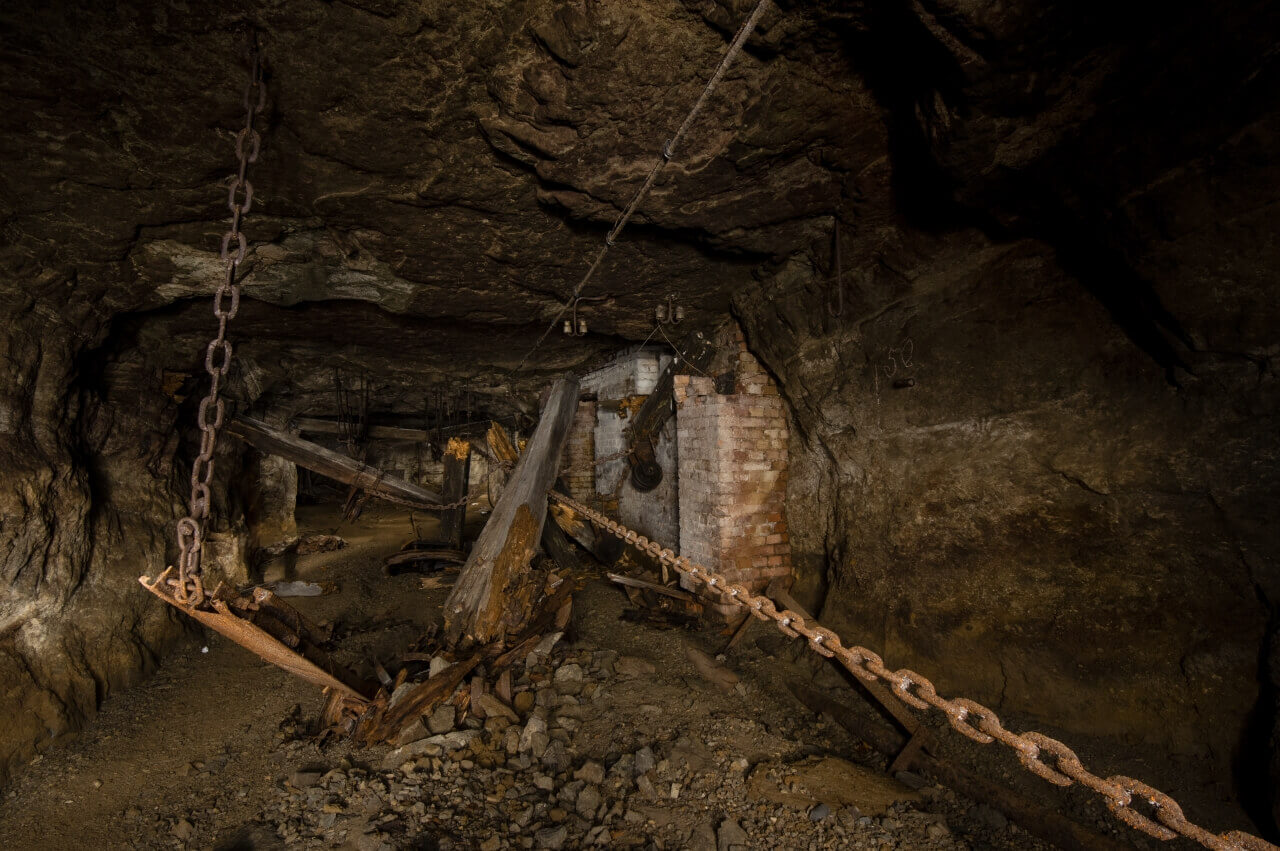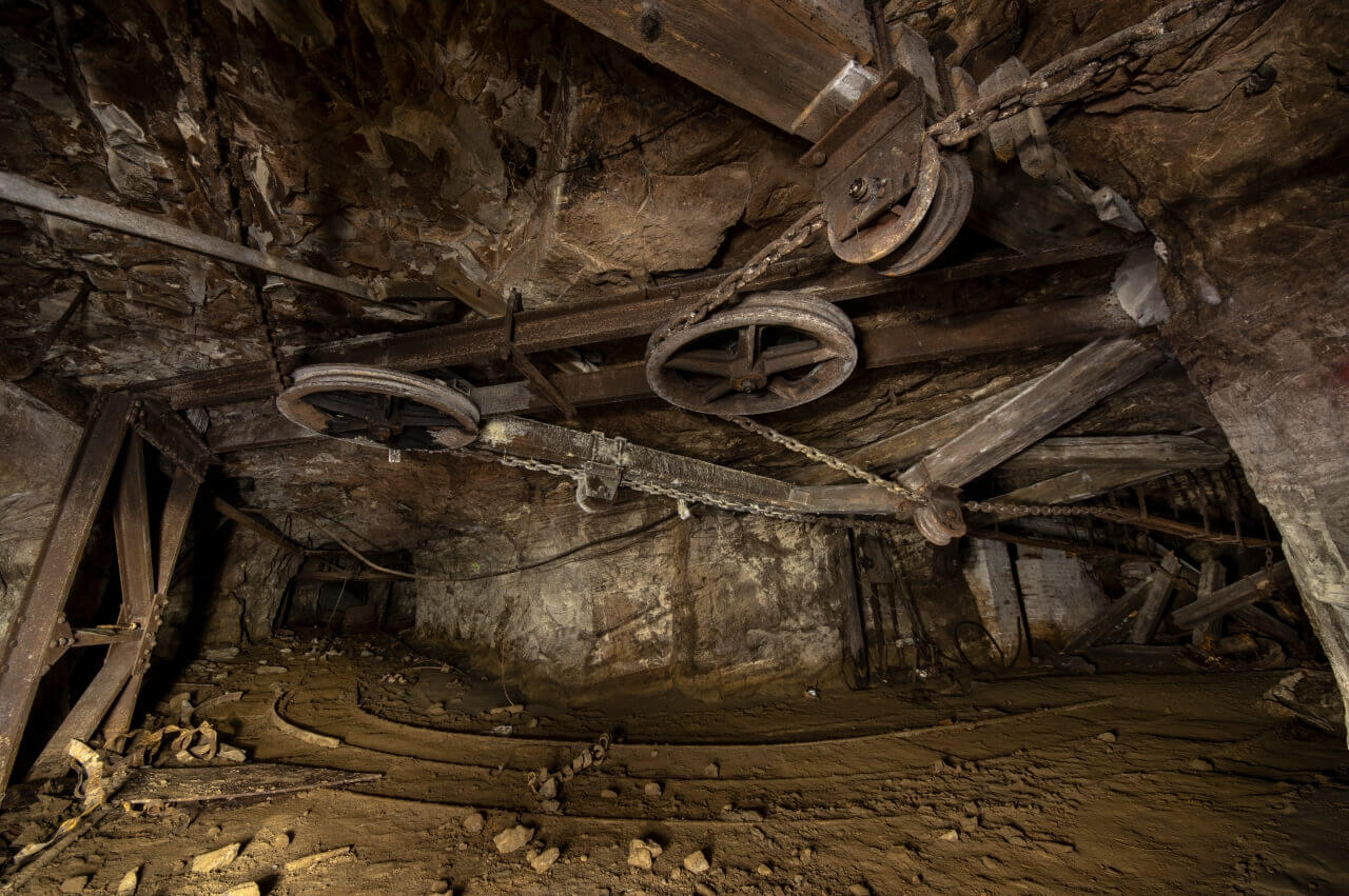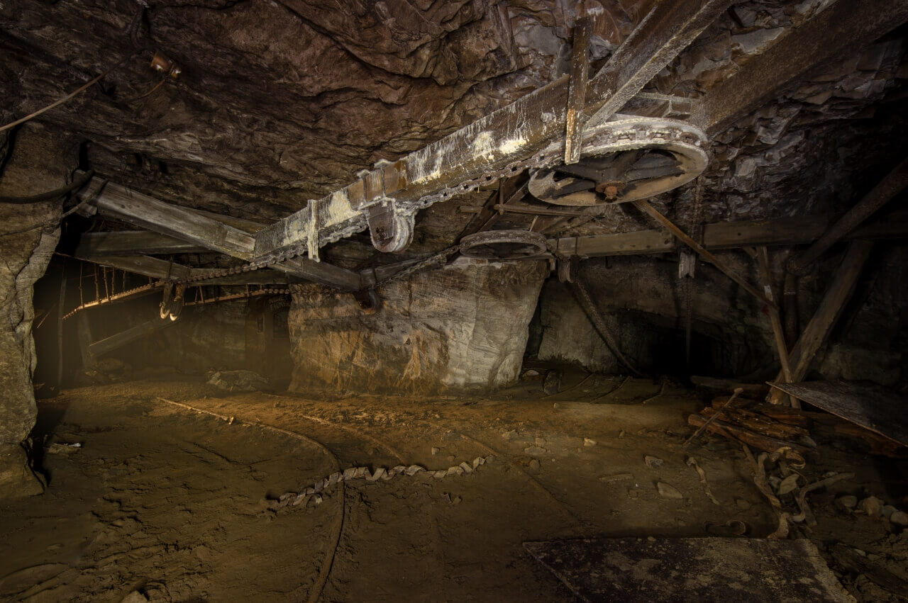 An der Firste und den Stößen sah es aus, als würde der Berg bluten. Der asphalthaltige Kalkstein tropfte an einigen Stellen regelrecht. Daher kam auch dieser stechende Geruch in der Grube. Vergleichbar mit dem Geruch auf der Autobahn, wenn eine neue Asphaltdecke gezogen wird, nur um einiges intensiver. Sicherlich trug die schlechte Bewetterung ihren Teil dazu bei. Die Strecken im Abbau befanden sich teilweise in einem desolaten Zustand. Die Asphaltkalke sind von streichenden und schwebenden Verwerfungen mit geringer Sprunghöhe durchzogen. Der Gesamtzustand war also nicht sonderlich vertrauenerweckend. Doch dann sahen wir aus der Ferne die ersten rostigen Ketten und unser primäres Ziel war lokalisiert. Die Kettenbahn, welche einst die Förderwagen durch die Grube zog.
