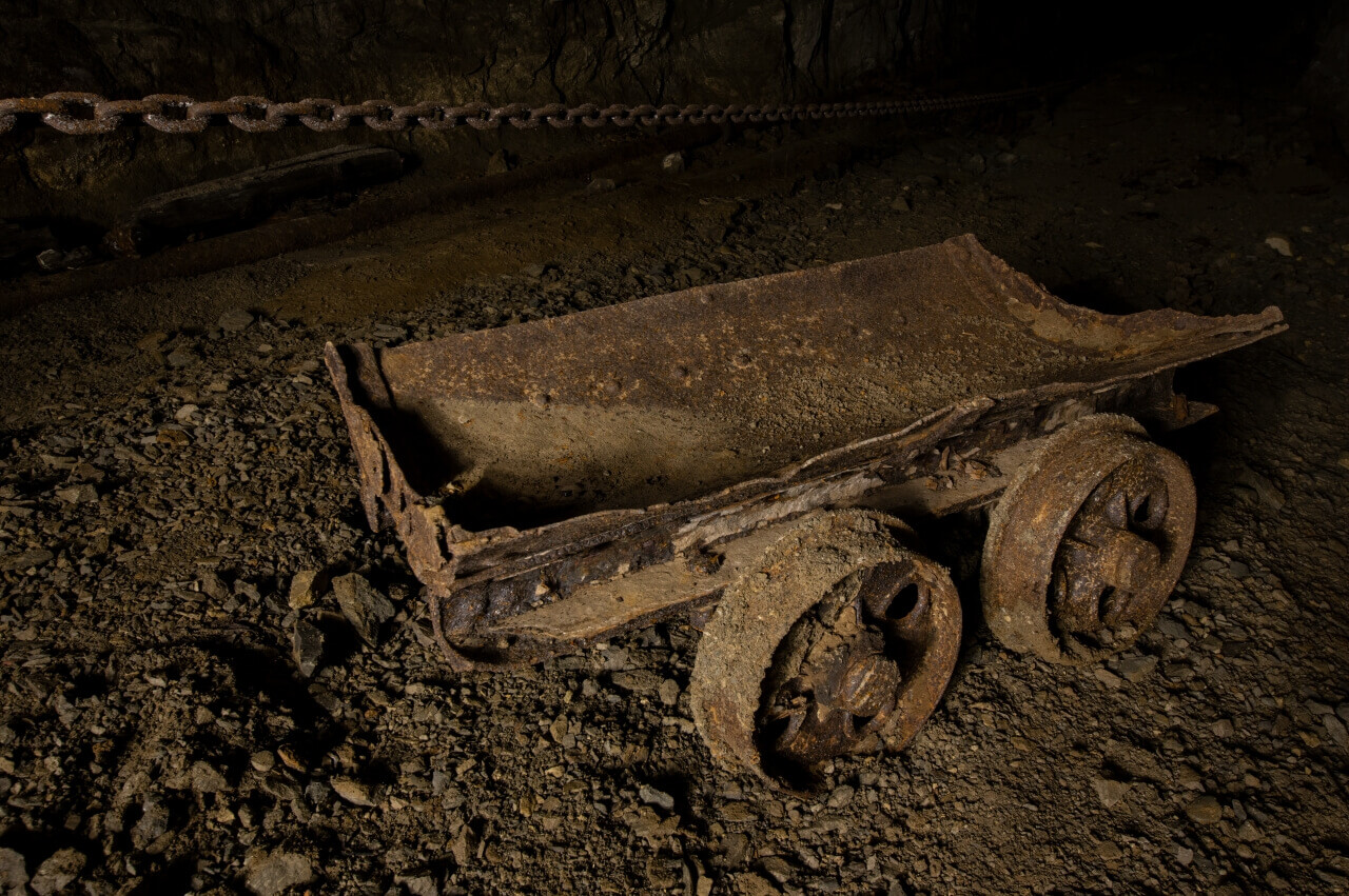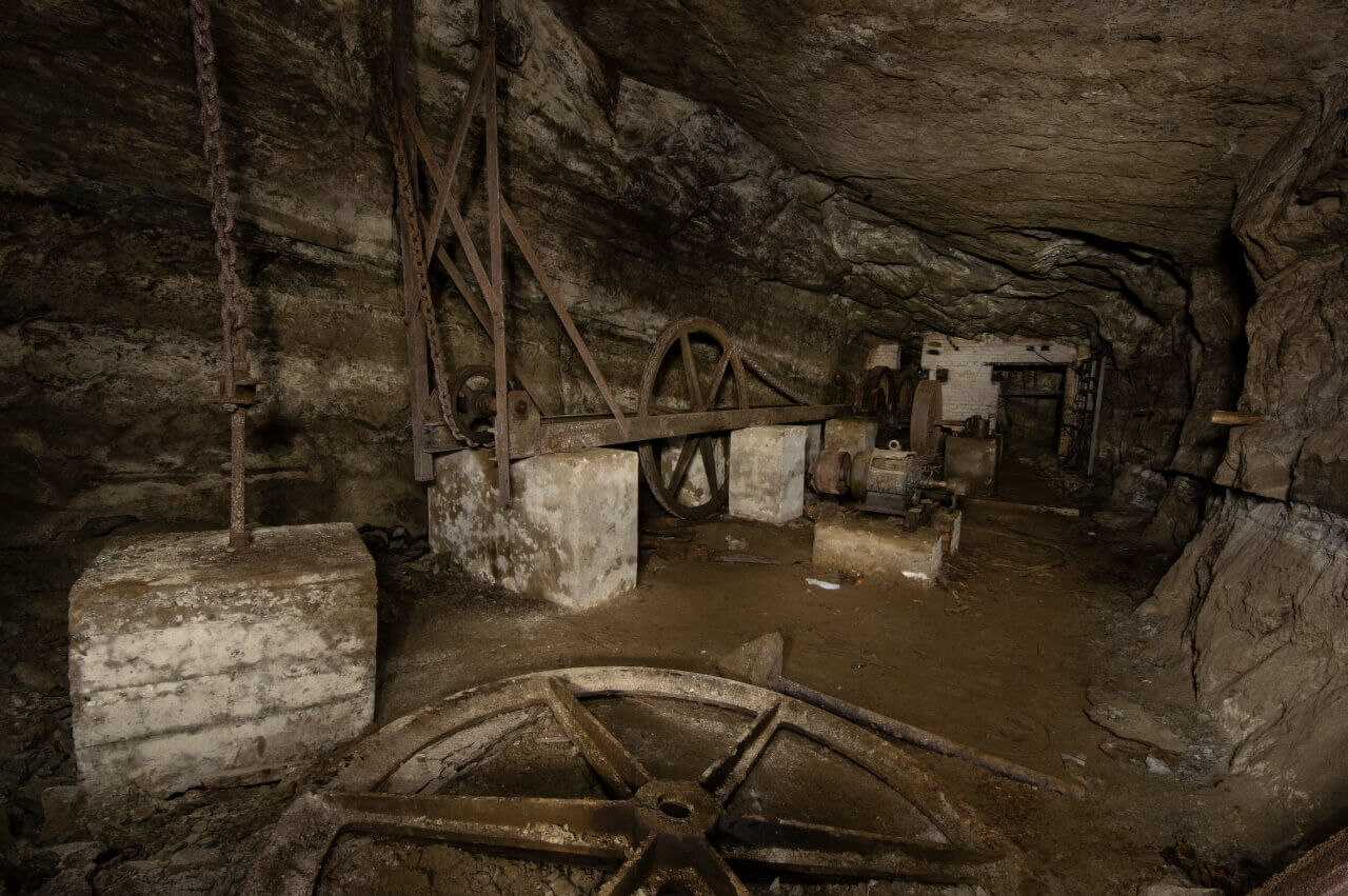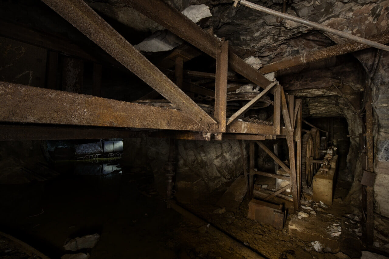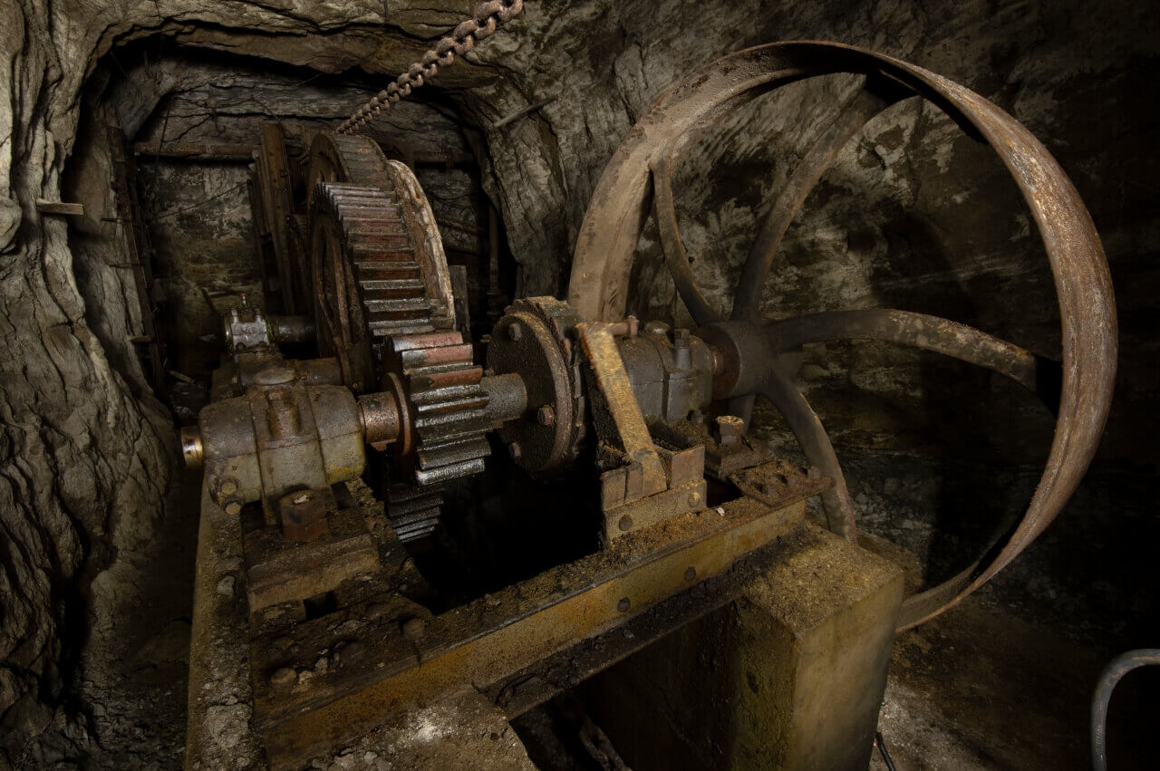 An der Firste und den Stößen sah es aus, als würde der Berg bluten. Der asphalthaltige Kalkstein tropfte an einigen Stellen regelrecht. Daher kam auch dieser stechende Geruch in der Grube. Vergleichbar mit dem Geruch auf der Autobahn, wenn eine neue Asphaltdecke gezogen wird, nur um einiges intensiver. Sicherlich trug die schlechte Bewetterung ihren Teil dazu bei. Die Strecken im Abbau befanden sich teilweise in einem desolaten Zustand. Die Asphaltkalke sind von streichenden und schwebenden Verwerfungen mit geringer Sprunghöhe durchzogen. Der Gesamtzustand war also nicht sonderlich vertrauenerweckend. Doch dann sahen wir aus der Ferne die ersten rostigen Ketten und unser primäres Ziel war lokalisiert. Die Kettenbahn, welche einst die Förderwagen durch die Grube zog.