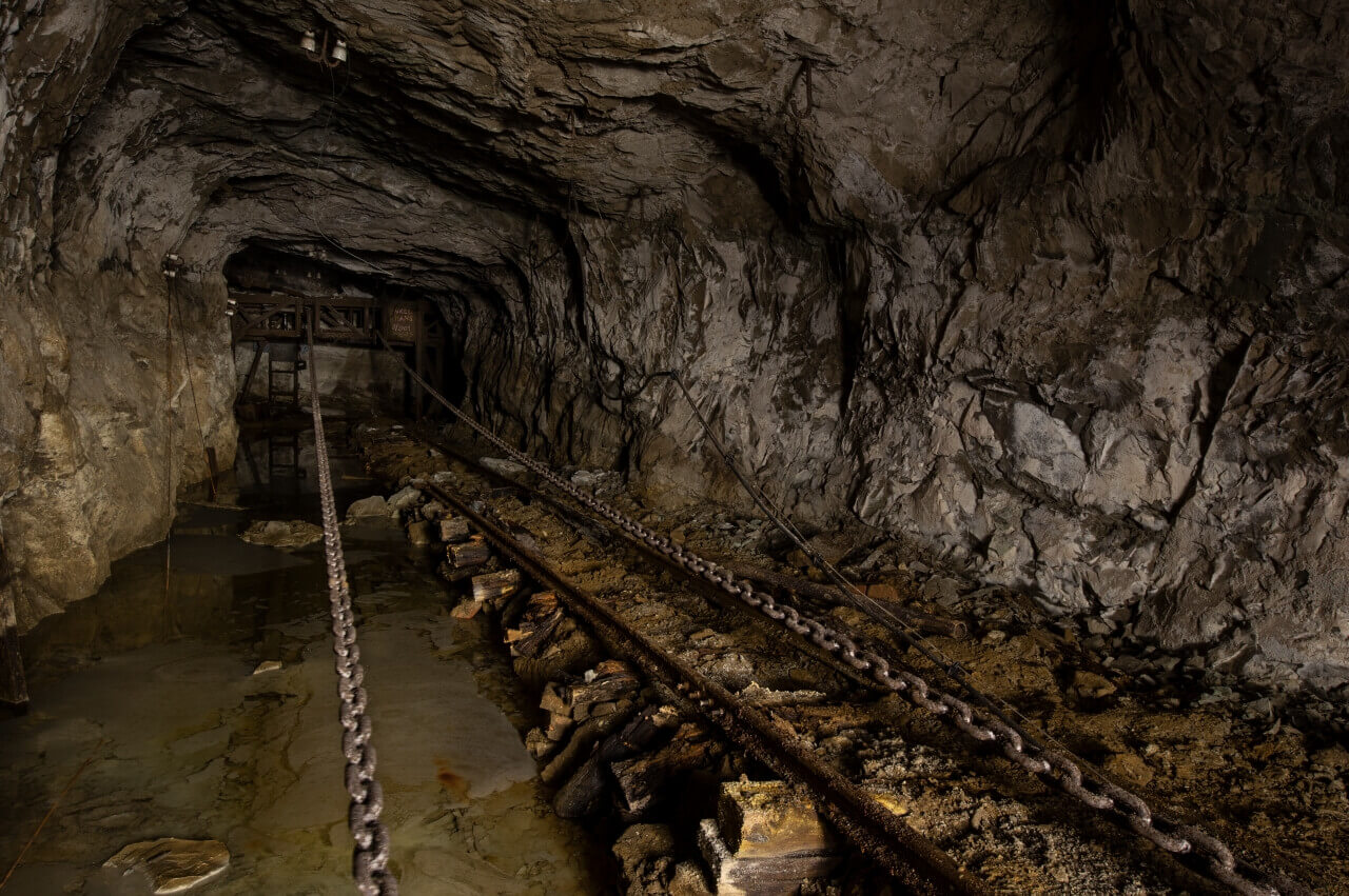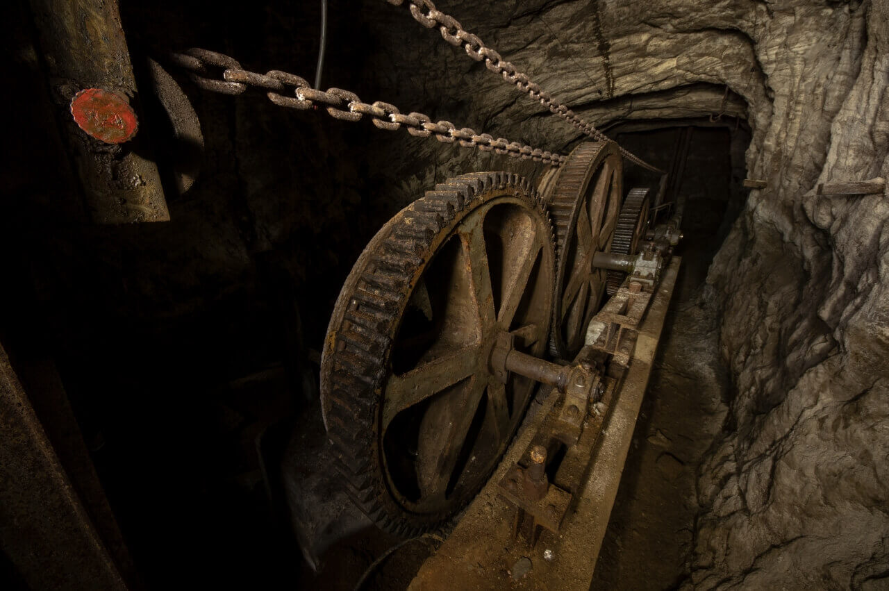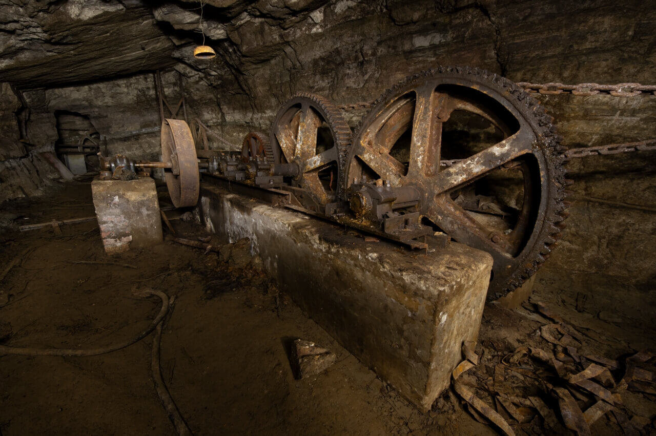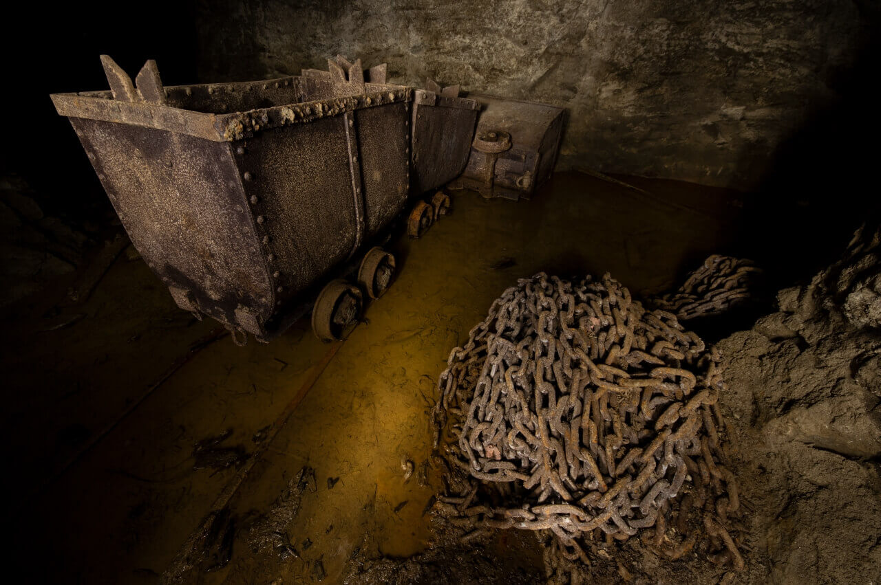 An der Firste und den Stößen sah es aus, als würde der Berg bluten. Der asphalthaltige Kalkstein tropfte an einigen Stellen regelrecht. Daher kam auch dieser stechende Geruch in der Grube. Vergleichbar mit dem Geruch auf der Autobahn, wenn eine neue Asphaltdecke gezogen wird, nur um einiges intensiver. Sicherlich trug die schlechte Bewetterung ihren Teil dazu bei. Die Strecken im Abbau befanden sich teilweise in einem desolaten Zustand. Die Asphaltkalke sind von streichenden und schwebenden Verwerfungen mit geringer Sprunghöhe durchzogen. Der Gesamtzustand war also nicht sonderlich vertrauenerweckend. Doch dann sahen wir aus der Ferne die ersten rostigen Ketten und unser primäres Ziel war lokalisiert. Die Kettenbahn, welche einst die Förderwagen durch die Grube zog.