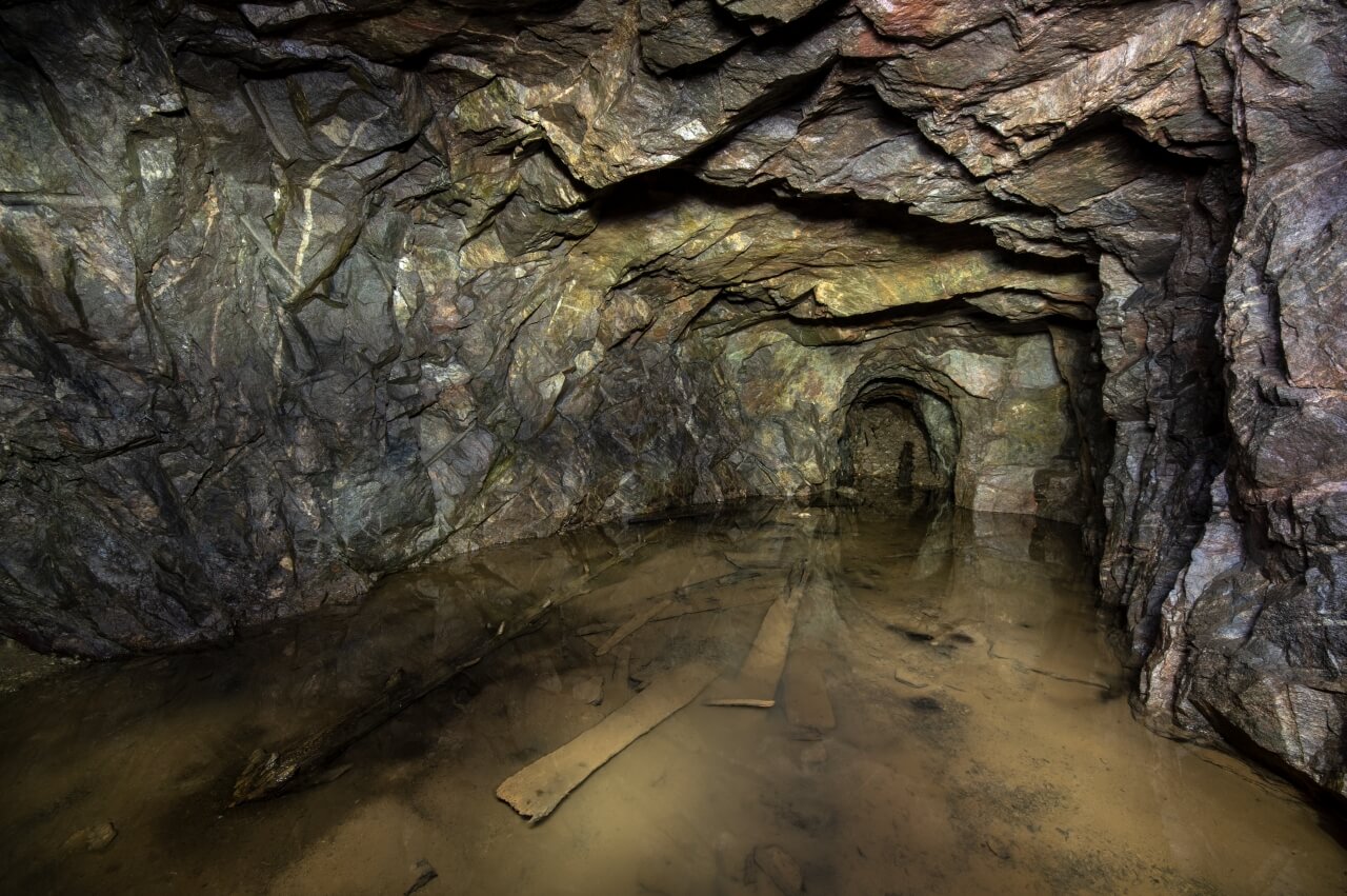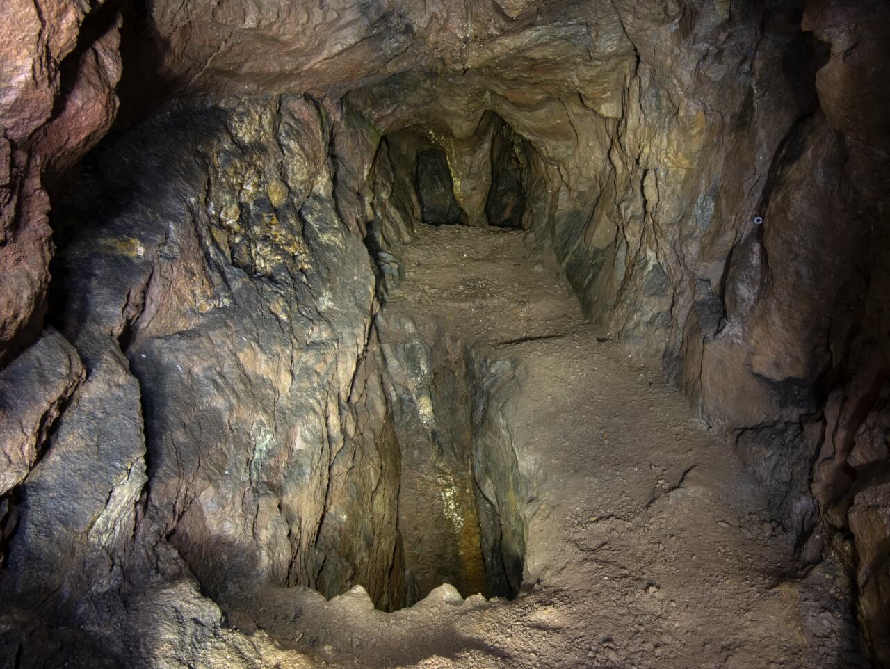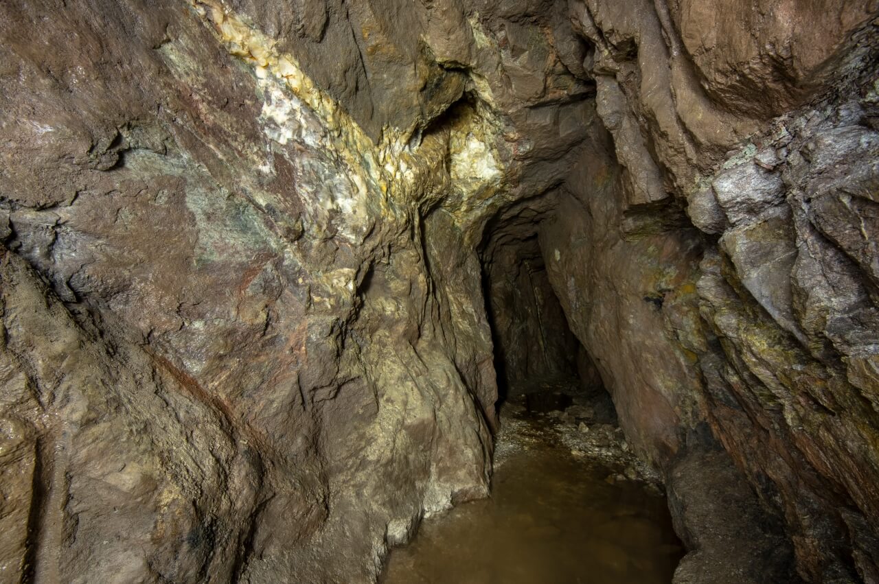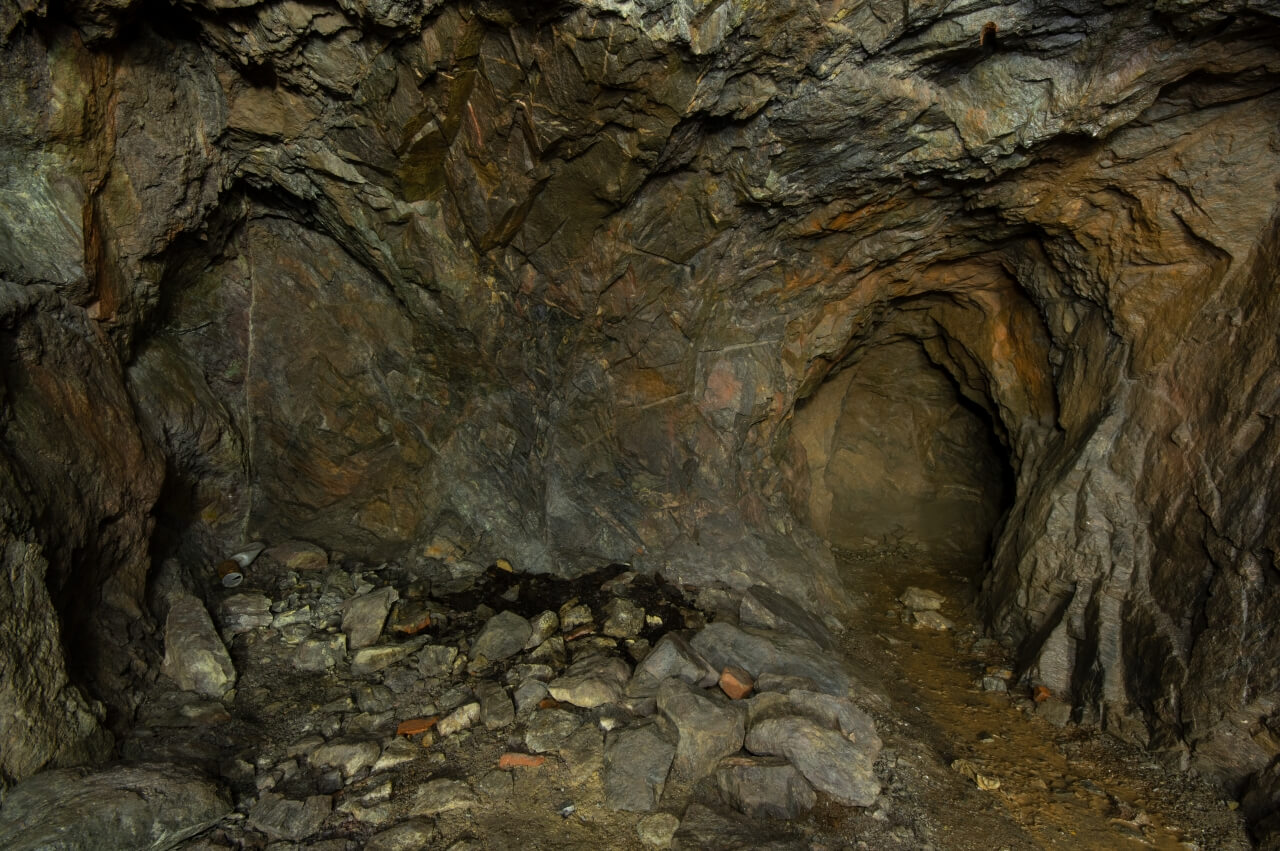 Erst am Ende des Schachts mussten wir durch eine Engstelle seilen. Nachdem wir diese passiert hatten, standen wir im unteren Stollen der Grube. Das Mundloch ist leider verschüttet und somit ist die Sohle nur über die Abseilstrecke erreichbar. Die untere Strecke unterscheidet sich komplett von der oberen. Statt Schlägelarbeiten finden sich hier unten nur Bohrlöcher. Ich schätze, dass diese einmal nachgerissen wurde. Anders kann ich es mir nicht erklären. Auch in der Literatur ließen sich keine weiteren Informationen finden. Die Länge der unteren Sohle beträgt 120 Meter. Am Ende fanden wir ein schönes Gesenk. Dieses war allerdings mit Wasser vollgelaufen. Mit viel Licht waren Holzeinbauten zu erkennen, leider kann ich zur Teufe keine Angaben machen.