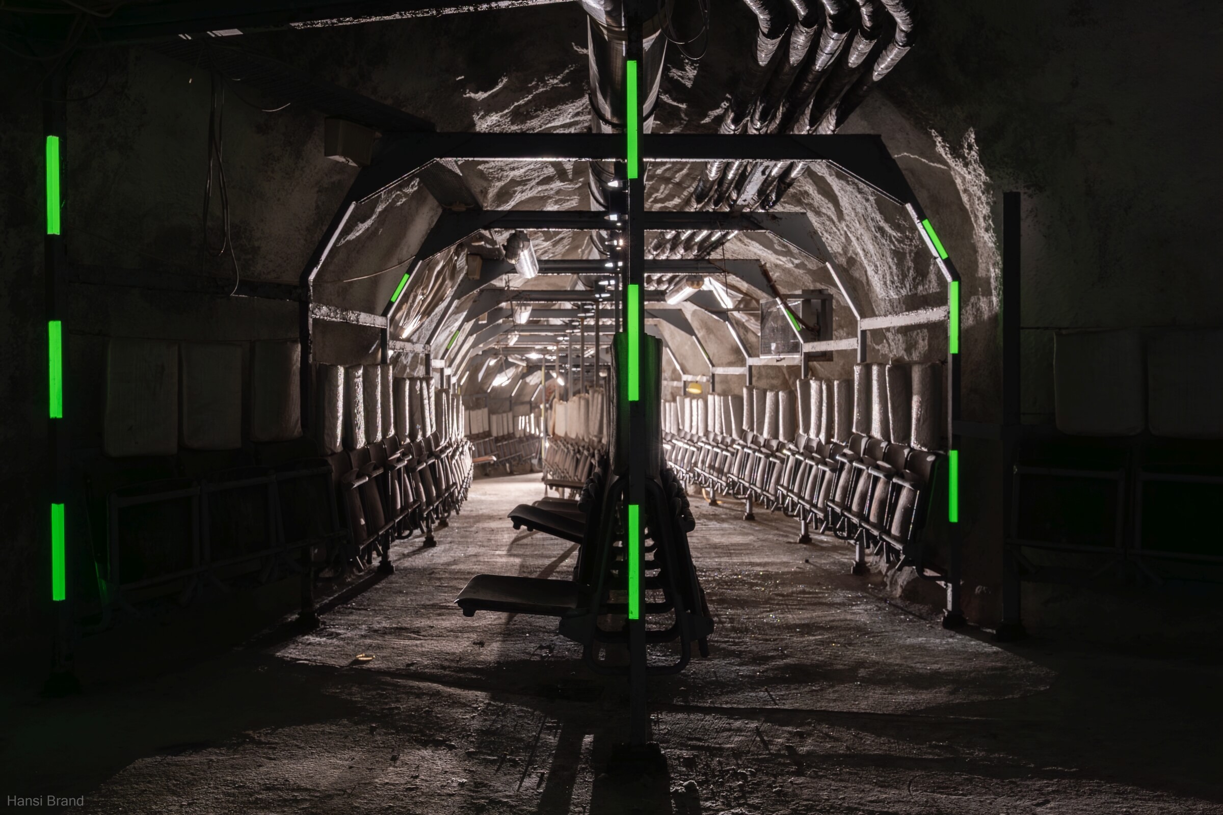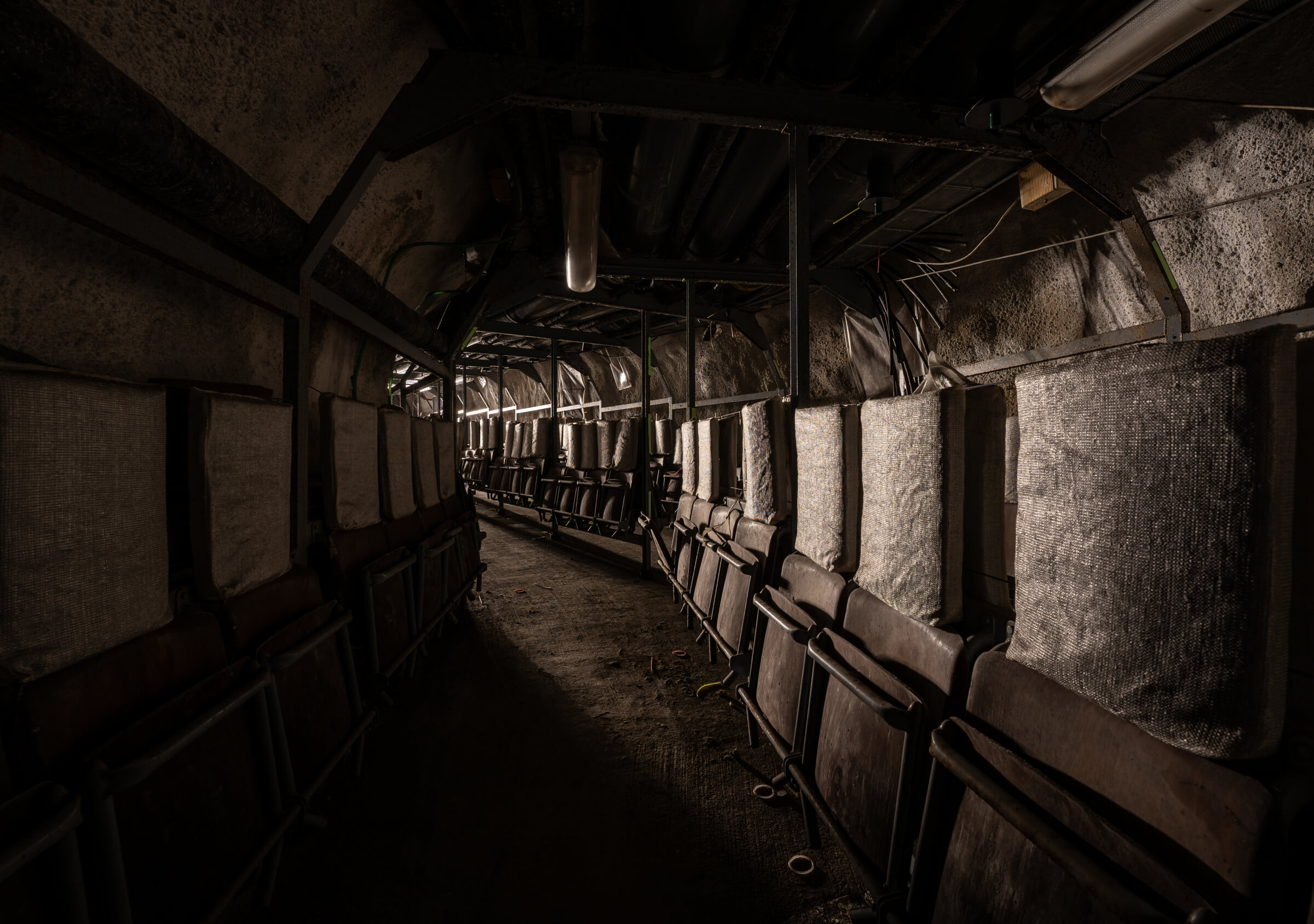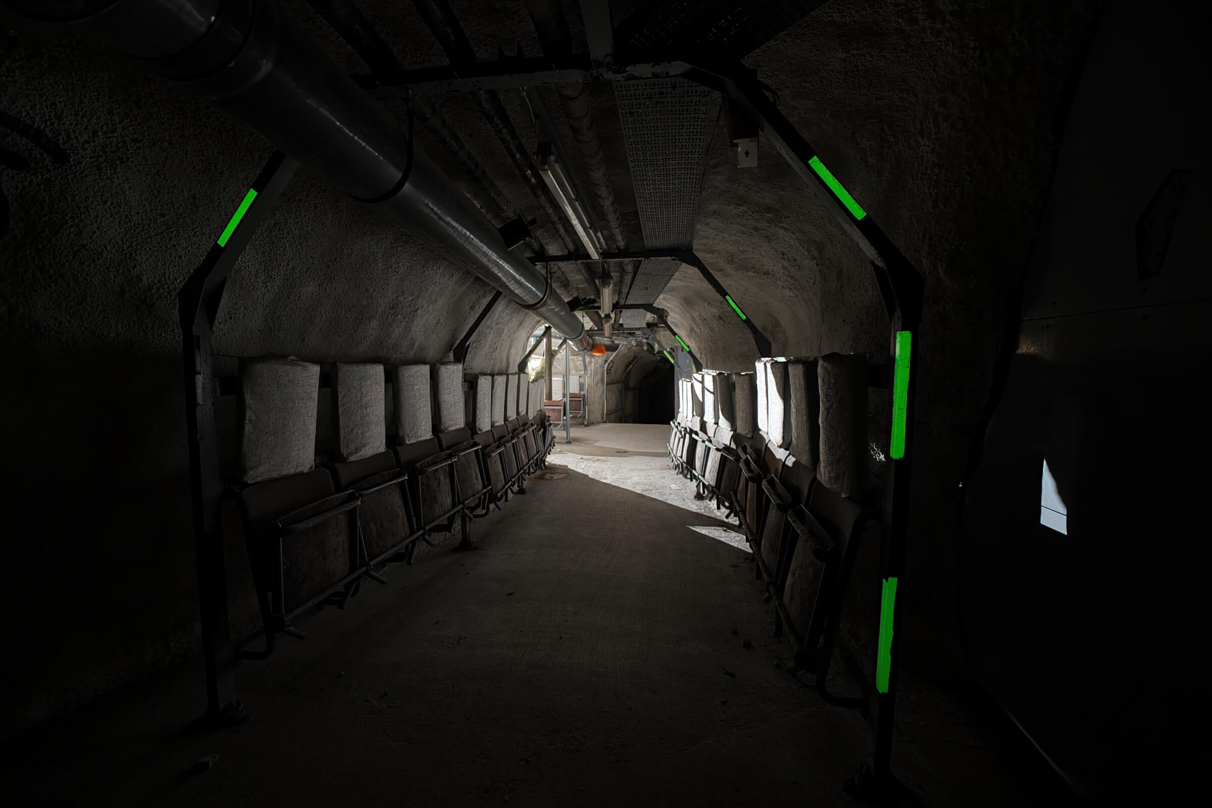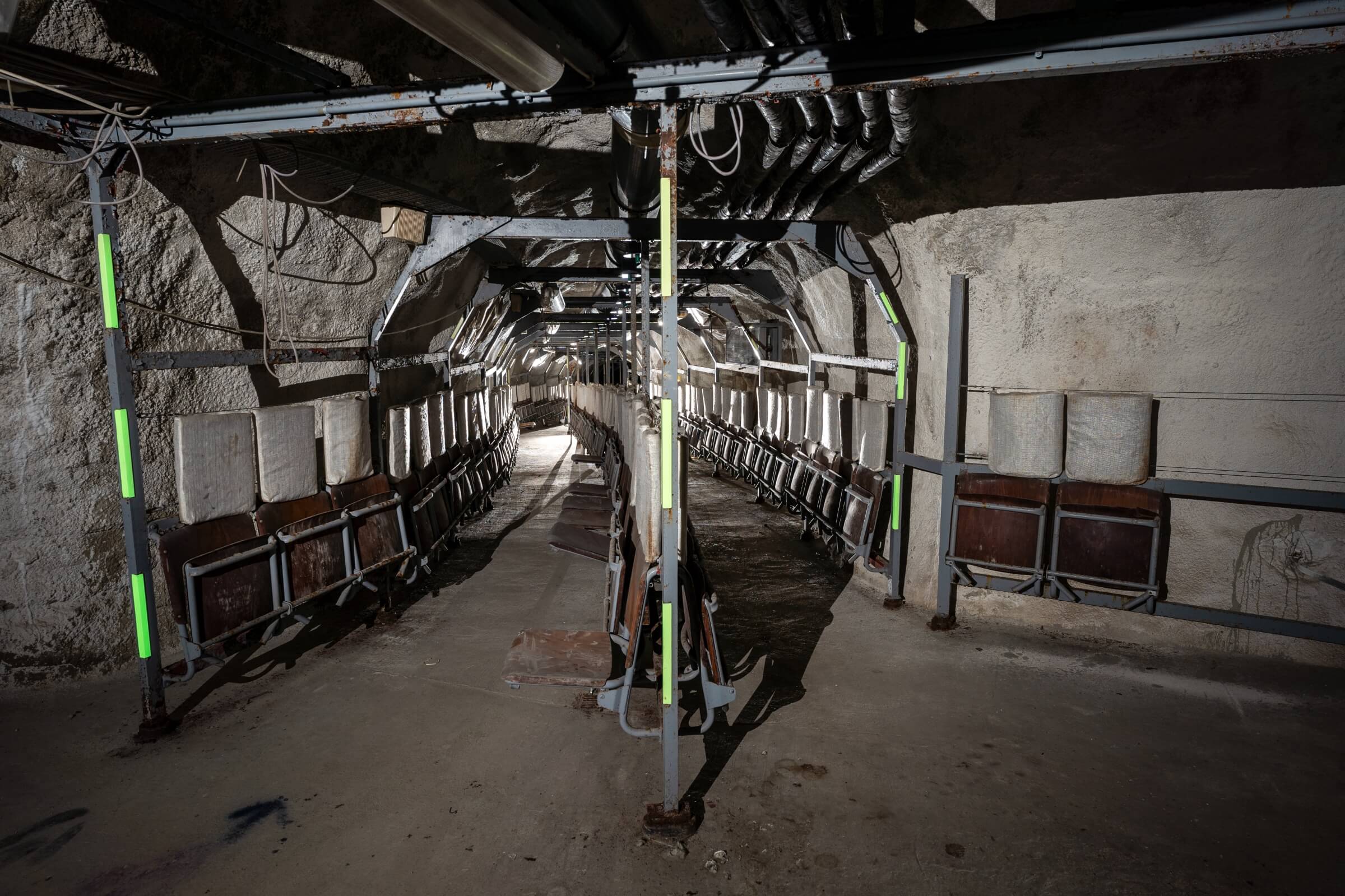 Etwa zwei Drittel der Plätze bestehen aus einfachen, herunterklappbaren Holzsitzen mit Kopfstütze, der Rest aus Klapppritschen. Eine typische Sitz- und Schlafplatzverteilung. Diese Aufteilung ermöglichte einen routinierenden Schlafbetrieb im 8-Stunden-Rhythmus. Die engen Gänge hätten ein Zusammenrücken unvermeidlich gemacht. Es ist absolut nicht vorstellbar, wie sich hier Menschen 30 Tage lang aufhalten sollen. Fremde Personen auf engstem Raum, ohne zu wissen, wie es den Angehörigen draußen ergangen ist. Sind diese noch am Leben? Steht das eigene Haus noch? Existiert überhaupt noch etwas außerhalb der Luftschutzanlage? Ich kann mir nur schwer vorstellen, dass das Personal es geschafft hätte, das Schutzbauwerk 30 Tage lang gegen Austrittsversuche zu sichern.