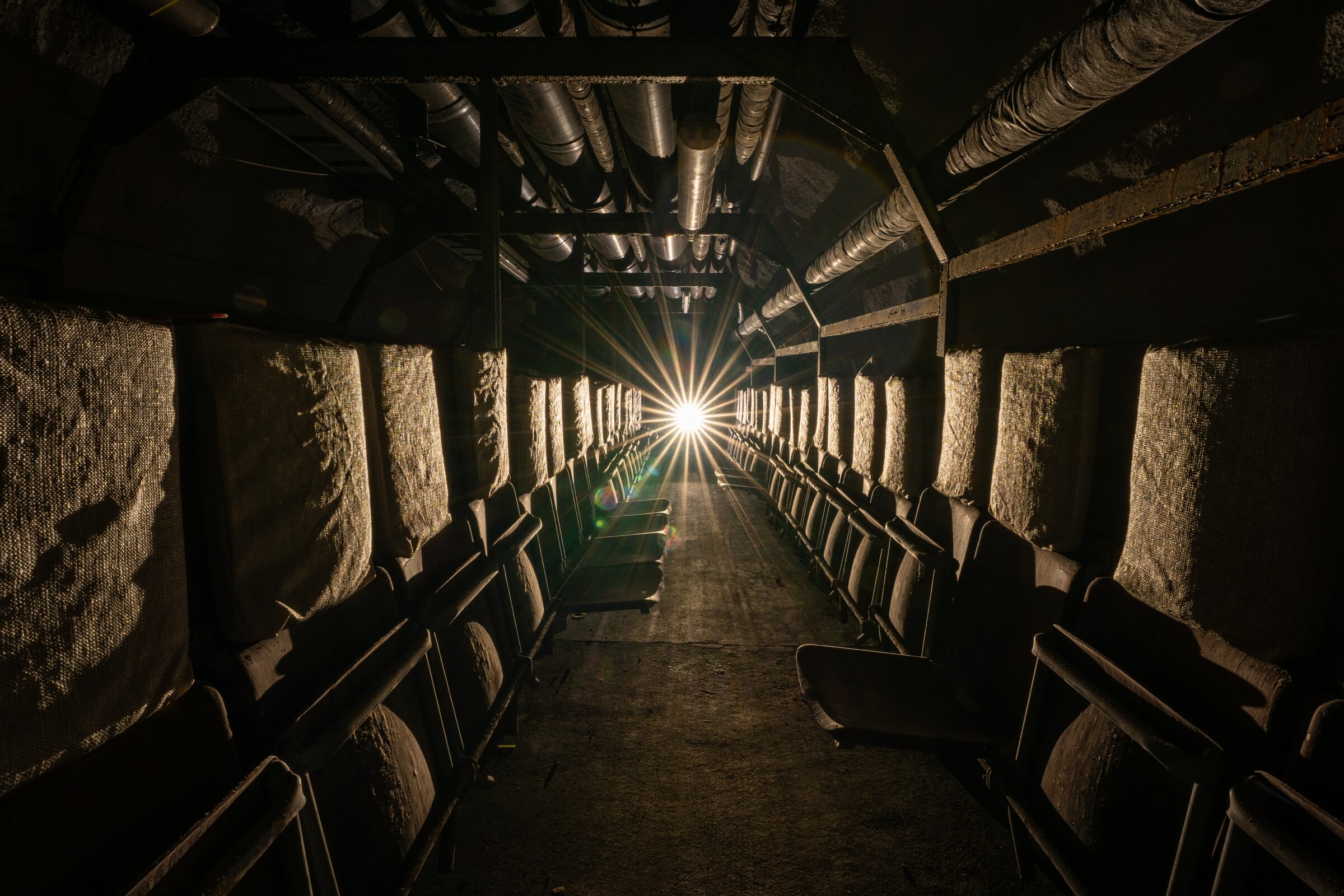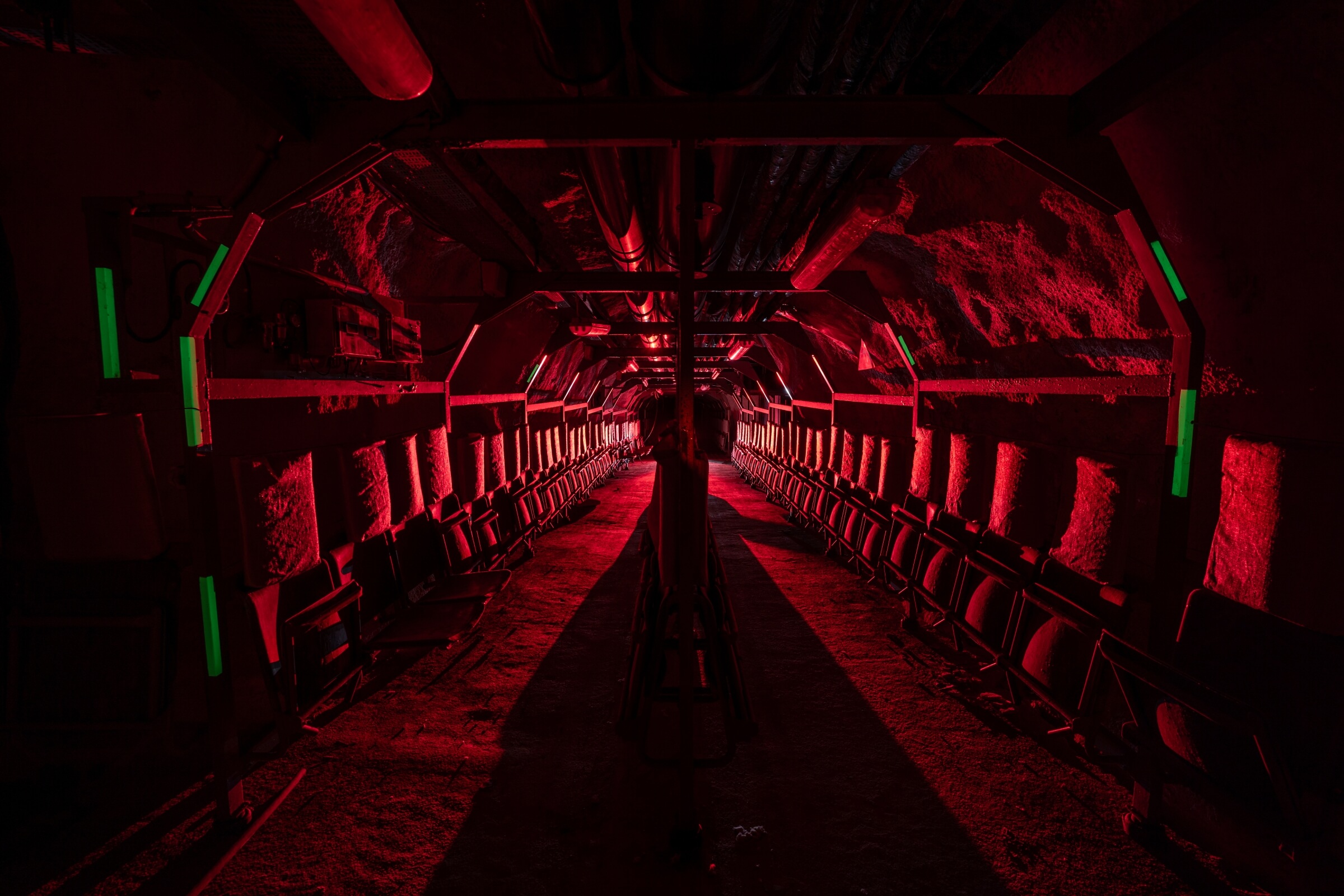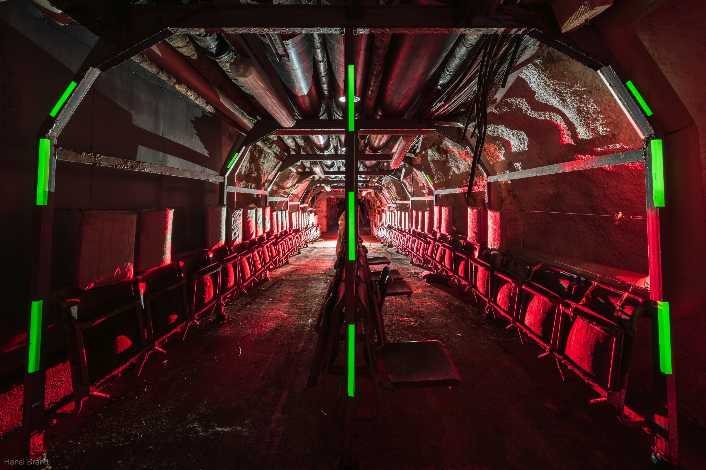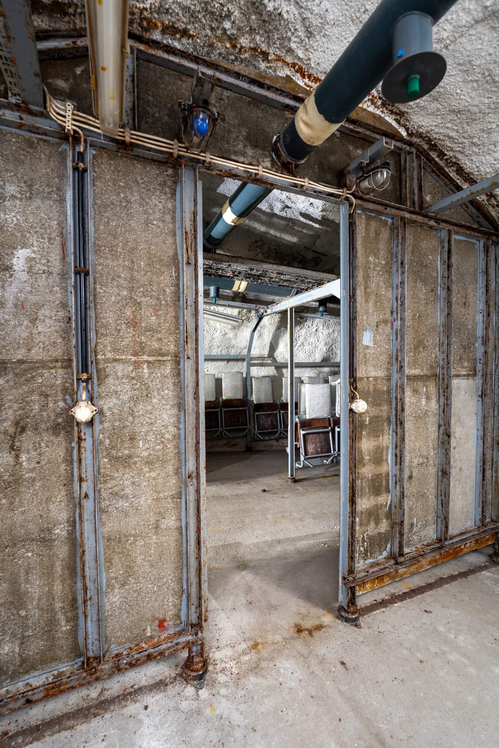 Etwa zwei Drittel der Plätze bestehen aus einfachen, herunterklappbaren Holzsitzen mit Kopfstütze, der Rest aus Klapppritschen. Eine typische Sitz- und Schlafplatzverteilung. Diese Aufteilung ermöglichte einen routinierenden Schlafbetrieb im 8-Stunden-Rhythmus. Die engen Gänge hätten ein Zusammenrücken unvermeidlich gemacht. Es ist absolut nicht vorstellbar, wie sich hier Menschen 30 Tage lang aufhalten sollen. Fremde Personen auf engstem Raum, ohne zu wissen, wie es den Angehörigen draußen ergangen ist. Sind diese noch am Leben? Steht das eigene Haus noch? Existiert überhaupt noch etwas außerhalb der Luftschutzanlage? Ich kann mir nur schwer vorstellen, dass das Personal es geschafft hätte, das Schutzbauwerk 30 Tage lang gegen Austrittsversuche zu sichern.