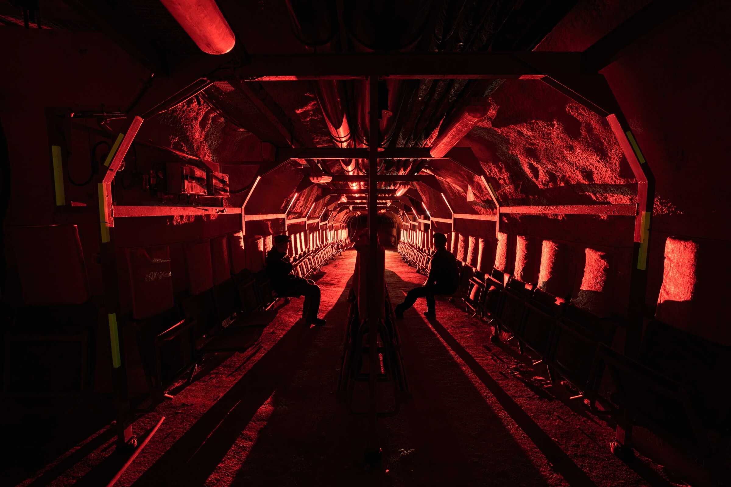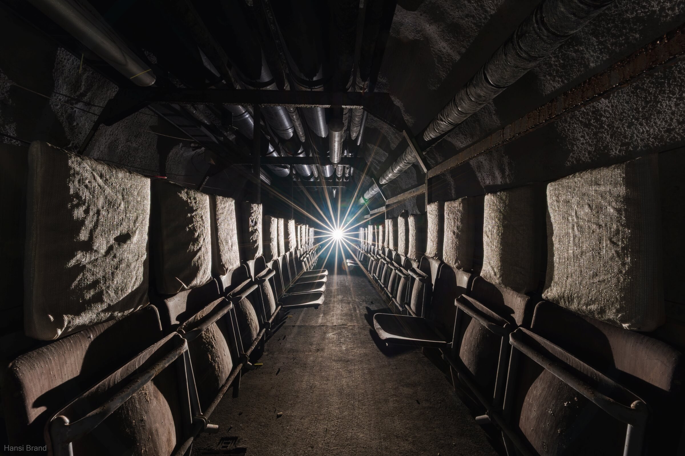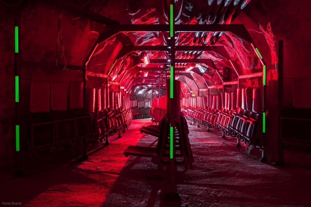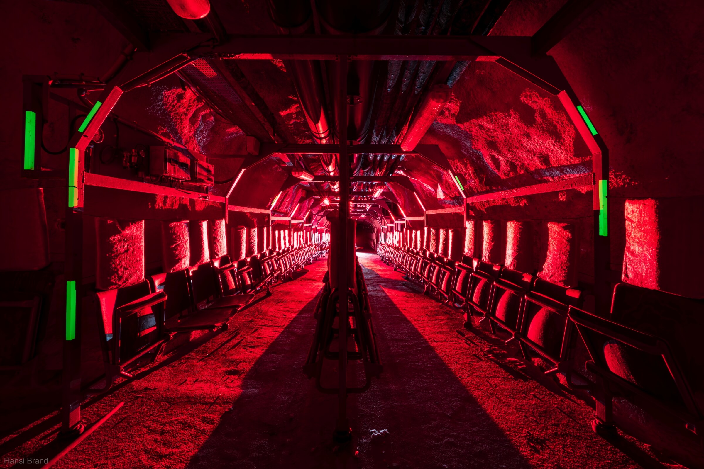 Etwa zwei Drittel der Plätze bestehen aus einfachen, herunterklappbaren Holzsitzen mit Kopfstütze, der Rest aus Klapppritschen. Eine typische Sitz- und Schlafplatzverteilung. Diese Aufteilung ermöglichte einen routinierenden Schlafbetrieb im 8-Stunden-Rhythmus. Die engen Gänge hätten ein Zusammenrücken unvermeidlich gemacht. Es ist absolut nicht vorstellbar, wie sich hier Menschen 30 Tage lang aufhalten sollen. Fremde Personen auf engstem Raum, ohne zu wissen, wie es den Angehörigen draußen ergangen ist. Sind diese noch am Leben? Steht das eigene Haus noch? Existiert überhaupt noch etwas außerhalb der Luftschutzanlage? Ich kann mir nur schwer vorstellen, dass das Personal es geschafft hätte, das Schutzbauwerk 30 Tage lang gegen Austrittsversuche zu sichern.