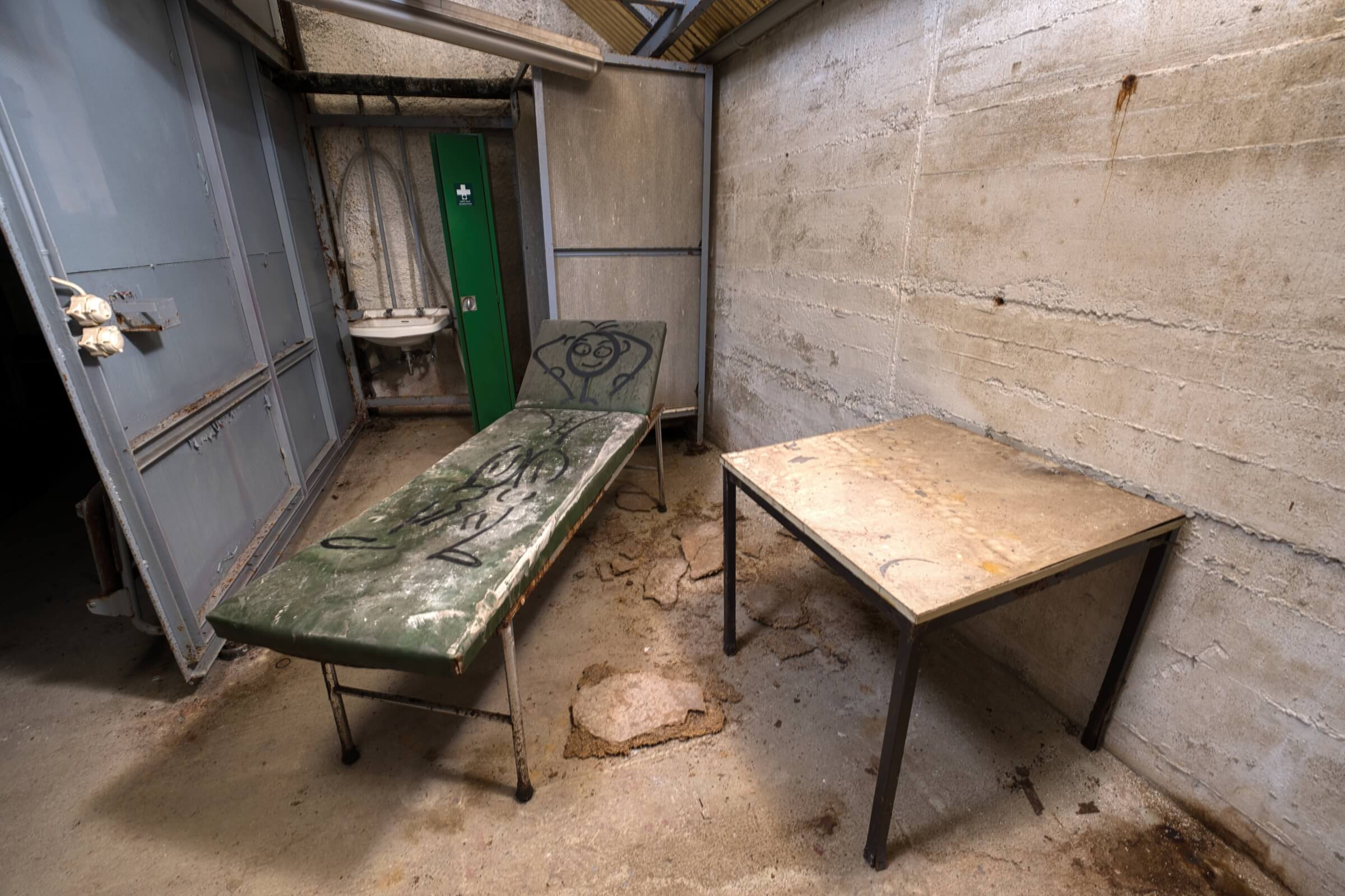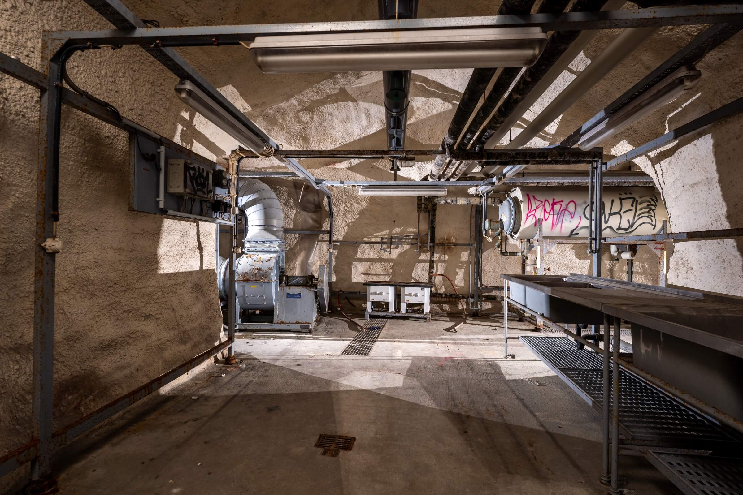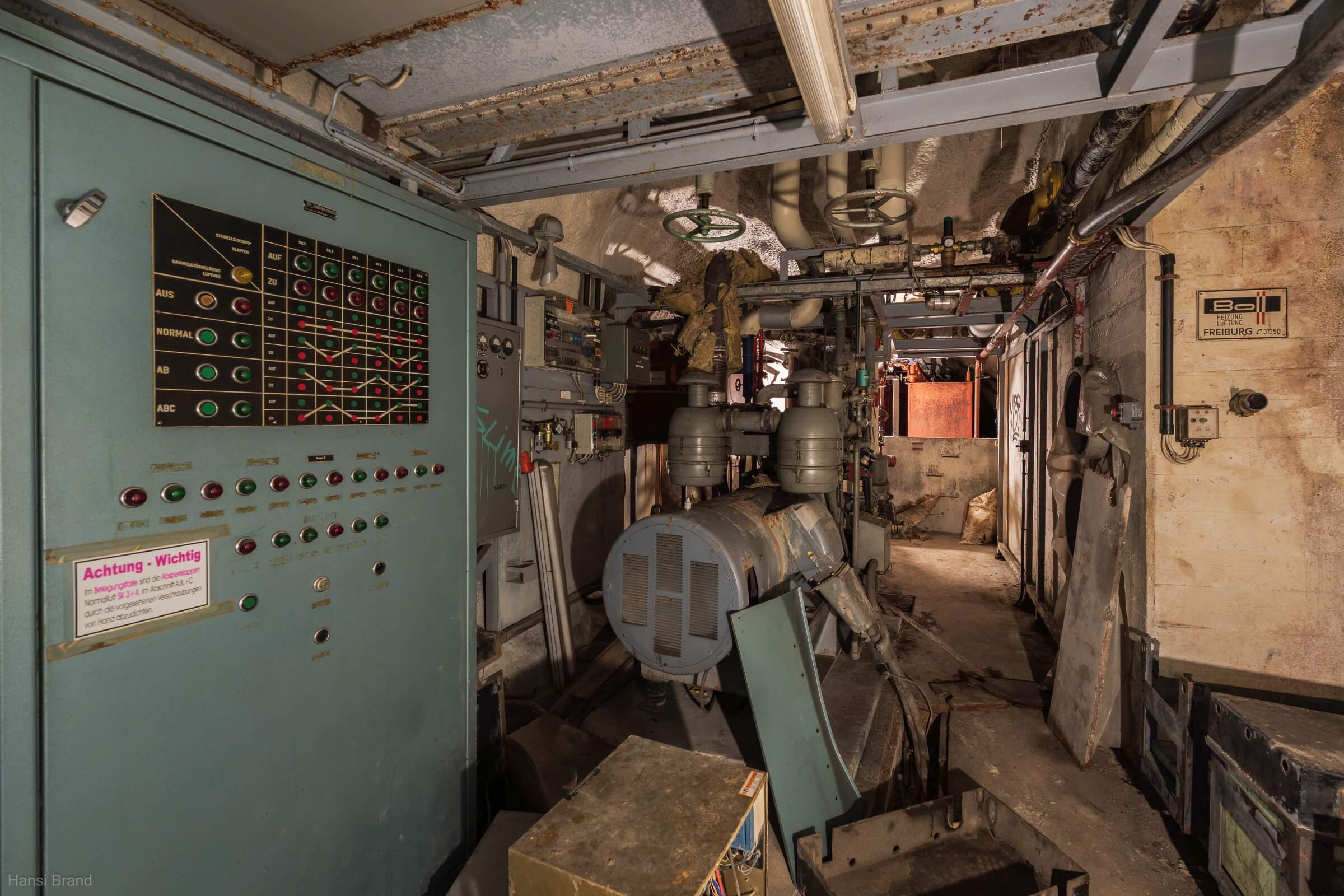 Ein Großteil der Wände und viele Einbauten sind mit Graffitis beschmiert. Sämtliche Pissoirs im Sanitärbereich wurden zerschlagen. Viele Räume dienten als Unterkunft für Obdachlose oder Besetzer. Die Liste der Zerstörung wäre noch lang, aber belassen wir es bei dem Fazit, dass das Schutzbauwerk in einem desolaten Zustand ist und die Stadt Freiburg die Kontrolle verloren hat.